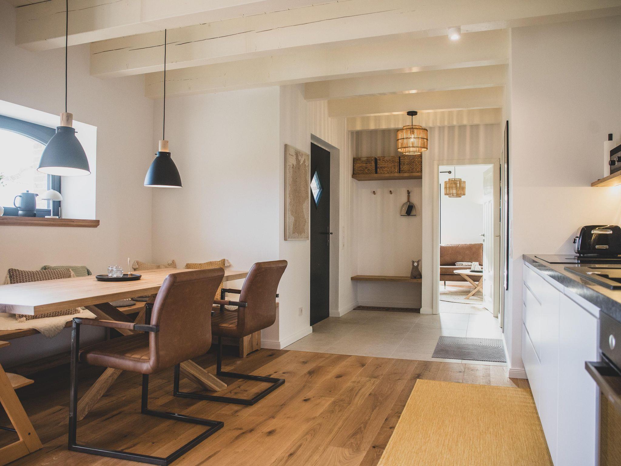 Die Ferienwohnung erstreckt sich über zwei Ebenen und verfügt über einen separaten Eingang, der nicht über die große Eingangshalle des Gulfhofs führt. So genießt ihr zusätzliche Privatsphäre und könnt direkt in euer eigenes Urlaubsreich eintreten.