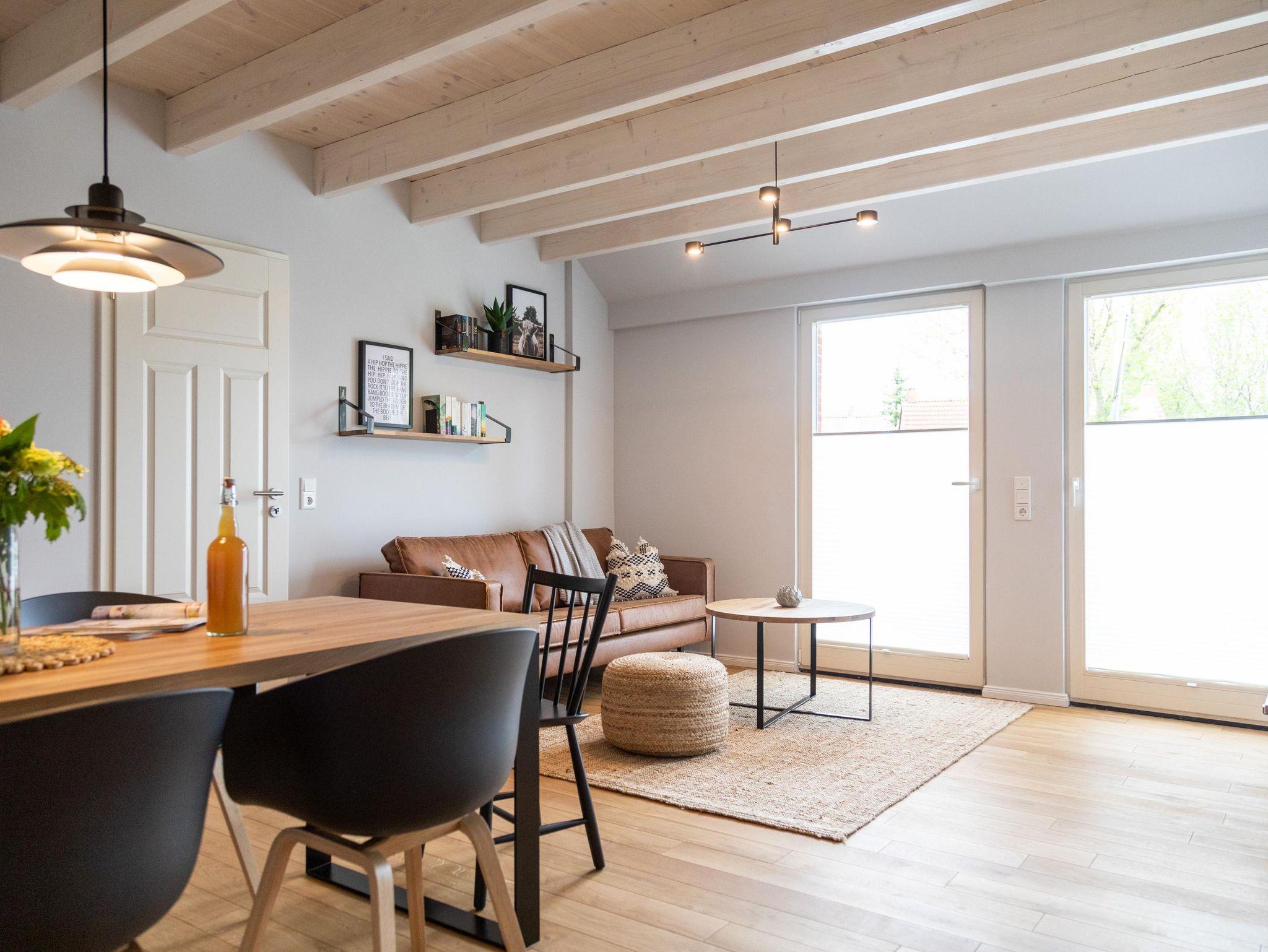 Unsere Wohnungen im Vorderhaus des Ferienhofs verfügen über hohe Decken mit durchgehend erhaltenen alten Deckenbalken. Die historischen Blockrahmenfenster und Fensterläden wurden in Handarbeit neu erstellt und runden den Anblick des denkmalgeschützten Gulfhofs ab. Im ehemaligen Scheunentrakt befinden sich durch bodentiefe Fenster helle und großzügig geschnittene Wohnungen. Alle Ferienwohnungen sind individuell, modern und mit viel Liebe zum Detail eingerichtet und bieten von der Terrasse einen erholsamen Blick auf die Grünflächen mit altem Baumbestand.