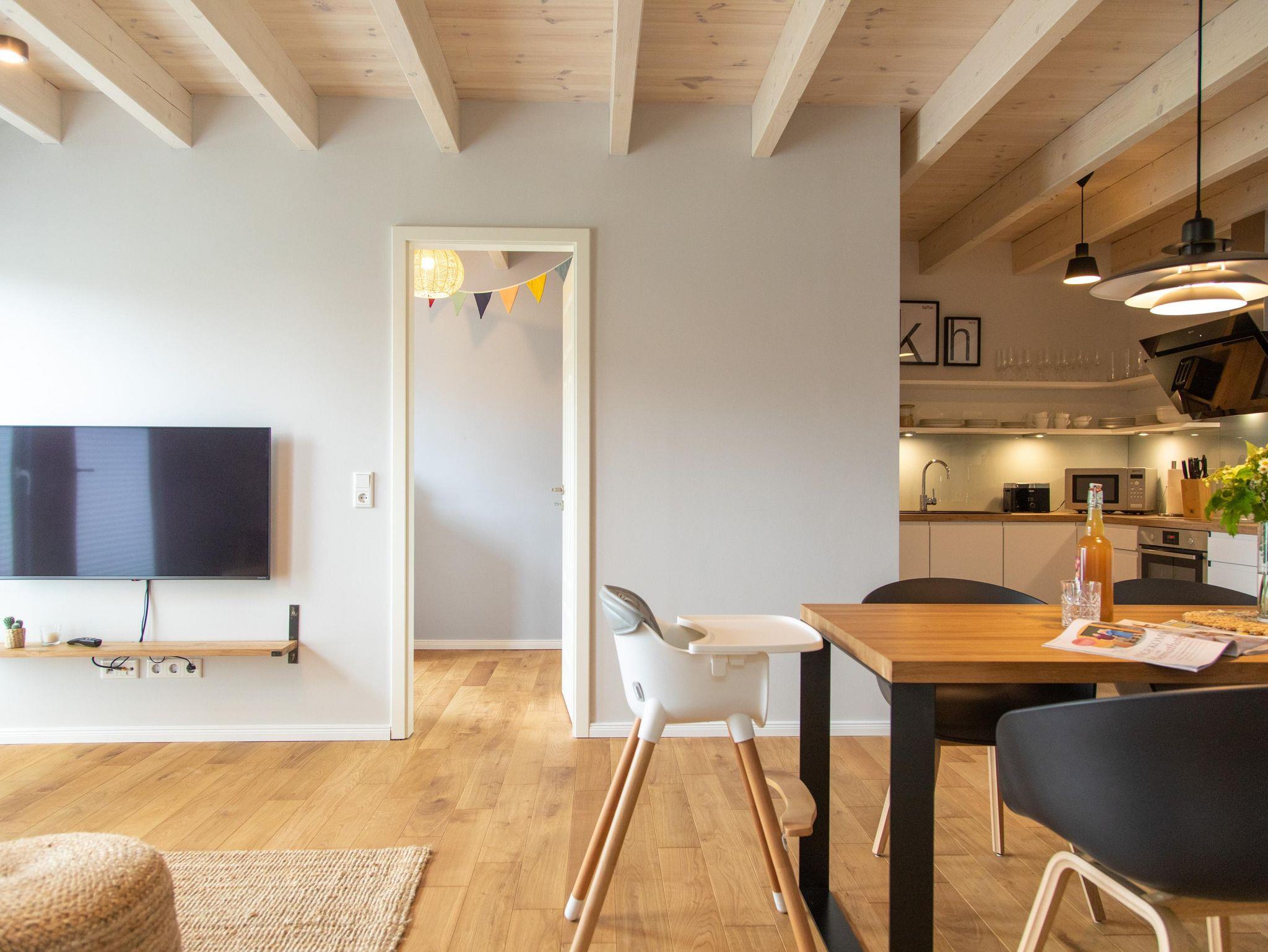 Familienurlaub an der Nordsee – mit unserer Ferienwohnung Hinrich habt ihr den perfekten Wohlfühlort für eine tolle Auszeit am Meer gefunden. Die Unterkunft liegt ebenerdig im historischen Scheunentraktes des liebevoll restaurierten Gulfhofes und bietet mit 69 qm genug Platz für einen entspannten Familienaufenthalt. Der Charme des alten Hofes wird Euch begeistern! Hier könnt ihr dem stressigen Alltag entfliehen. Für einen rundum komfortablen Urlaub sorgt die moderne Ausstattung der Unterkunft mit Echtholzböden, Fußbodenheizung, Smart-TV und bodentiefen Fenstern. Das Herz der Wohnung bietet der harmonische Wohn-/Essbereich, der sich nahtlos an die voll ausgestattete Küche anschließt. Kochliebhaber kommen hier voll auf ihre Kosten. Zwei separate Schlafzimmer sorgen für erholsame Nächte. Schlafzimmer 1 ist ein gemütlicher Rückzugsort mit Doppelbett und komfortablen Matratzen für die Eltern, ein eigens vom Tischler konzipiertes Hochbett im Schlafzimmer 2 bietet Platz für 2 Kinder. Das Bad mit Dusche und Badewanne lässt keine Wünsche offen. Für kleine Nordlichter stehen ein Kinderhochstuhl, Kinderreisebett und Kindergeschirr bereit. Im Kinderzimmer ist neben einer bunten Auswahl von Kinderbüchern, Bausteinen und Spielen auch ein kleiner Mal-und Spieltisch vorhanden.