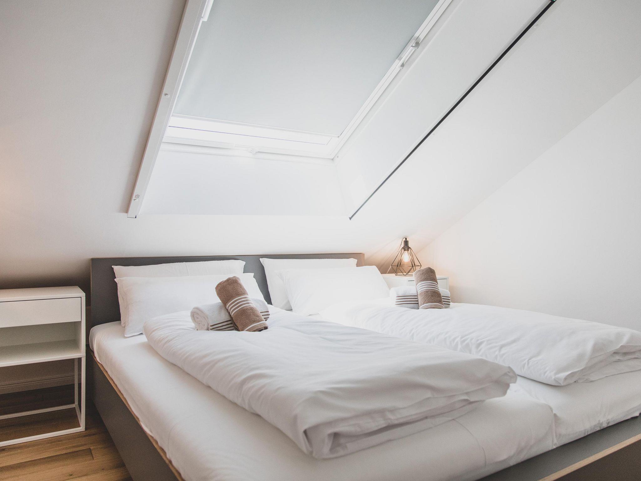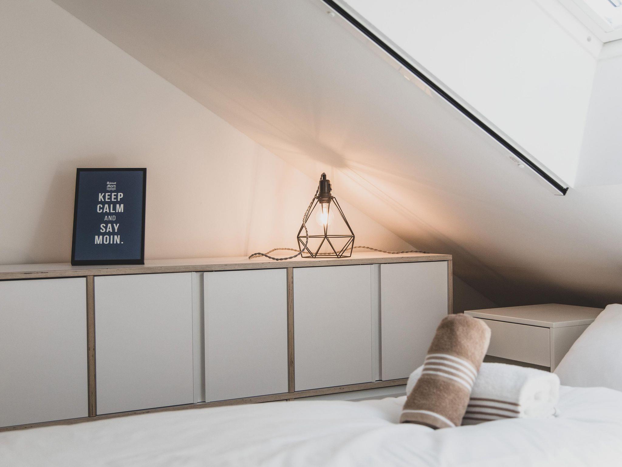 Im Obergeschoss befinden sich zwei Schlafzimmer sowie ein geräumiges Bad mit Dusche. Im Schlafzimmer 1 befindet sich ein Doppelbett, Schlafzimmer 2 bietet Platz für bis zu drei (ggf. auch vier) Kinder. Alternativ kann die Wohnung auch von 4 erwachsenen Feriengästen genutzt werden, da in Schlafzimmer 2 auch ein Doppelbett darstellbar ist. Beide Schlafzimmer verfügen über Verdunkelungs- und Insektenschutzrollos.