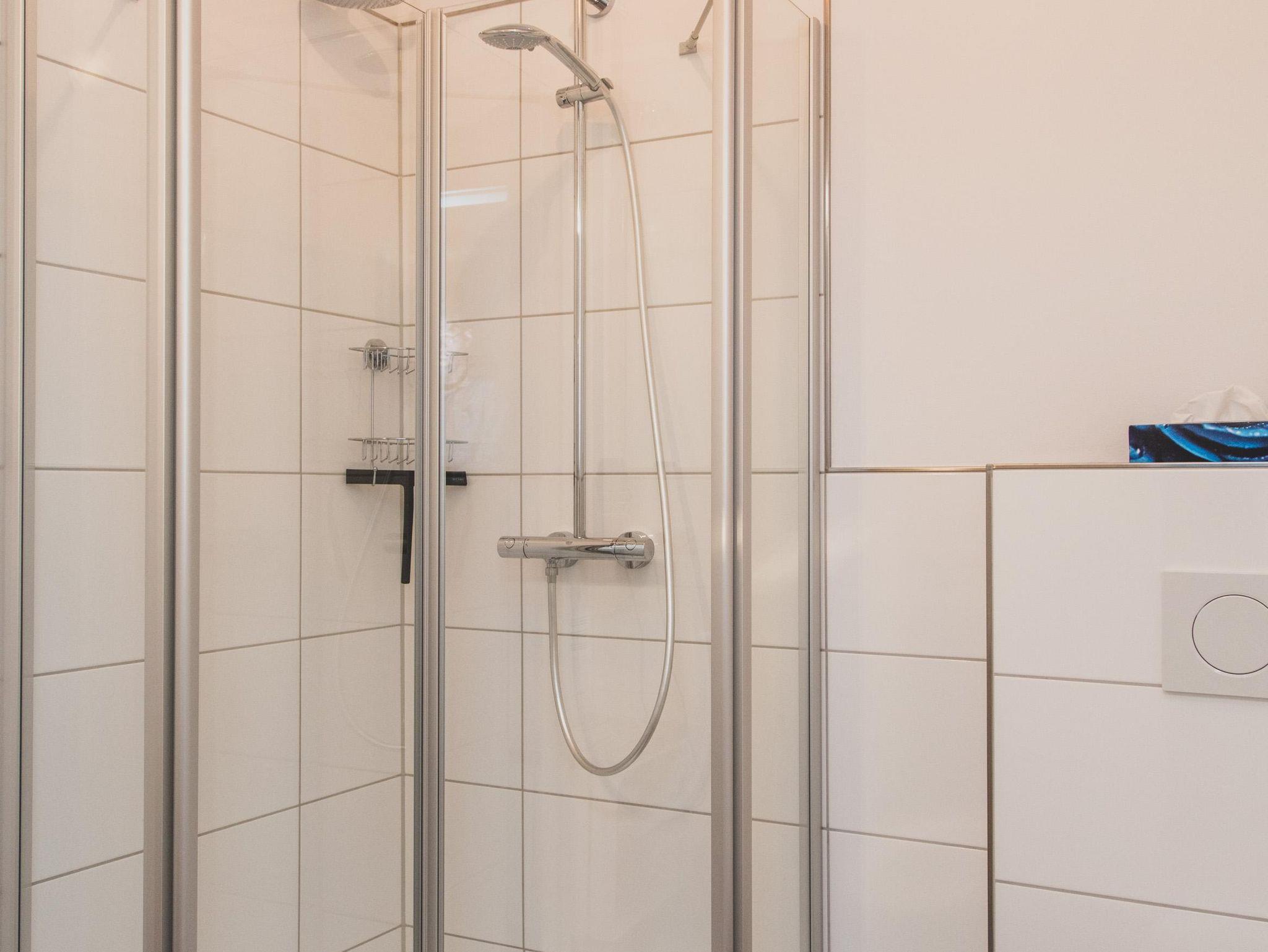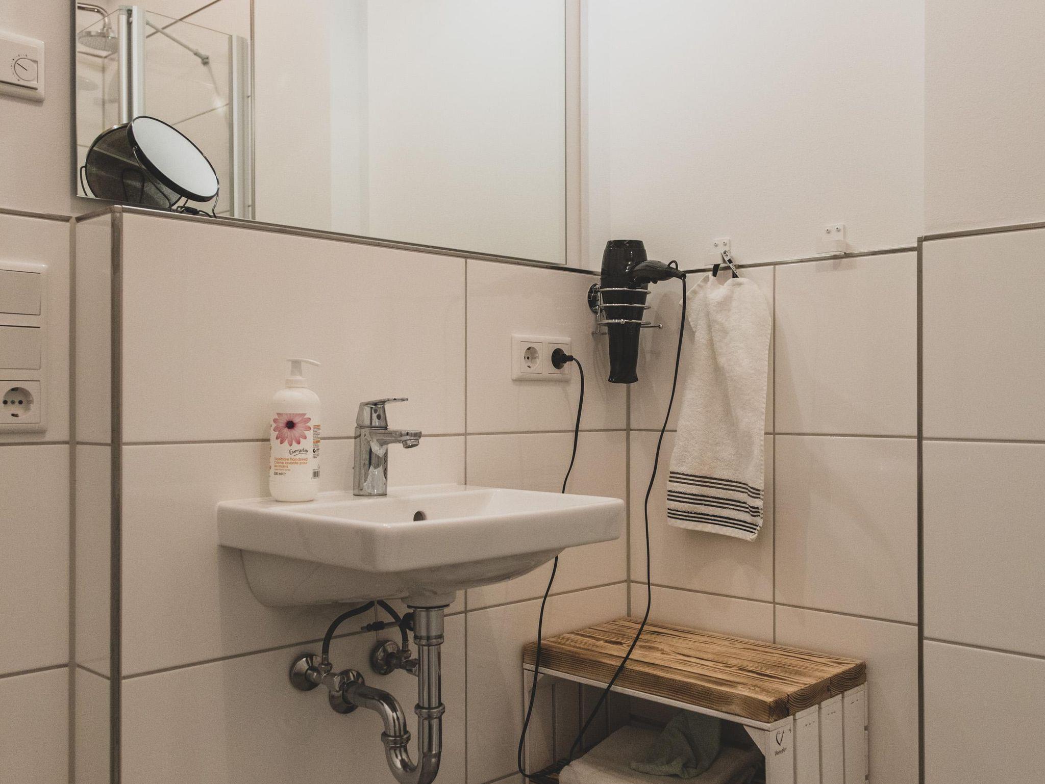 Im Eingangsbereich befindet sich ein Bad mit Dusche.