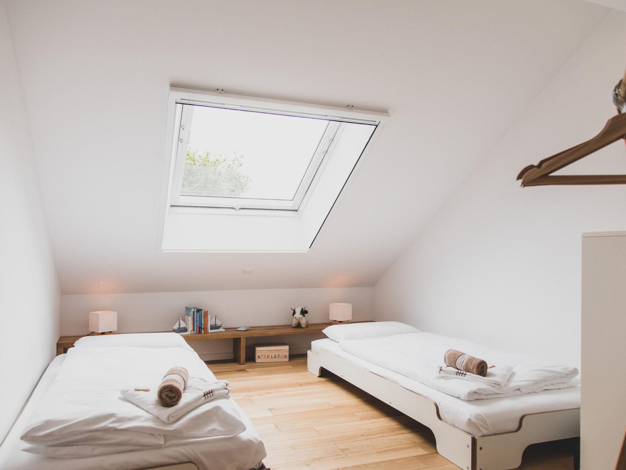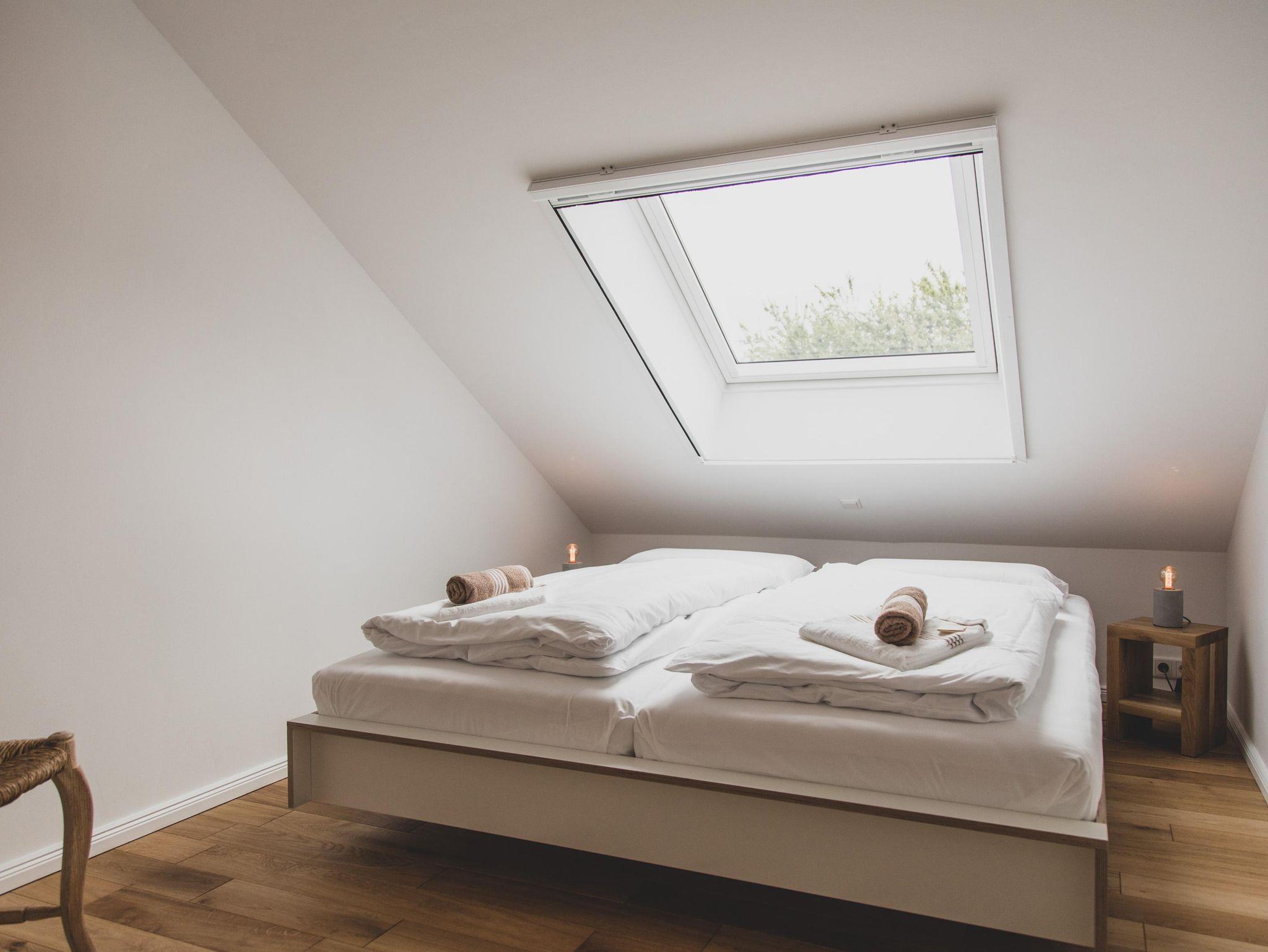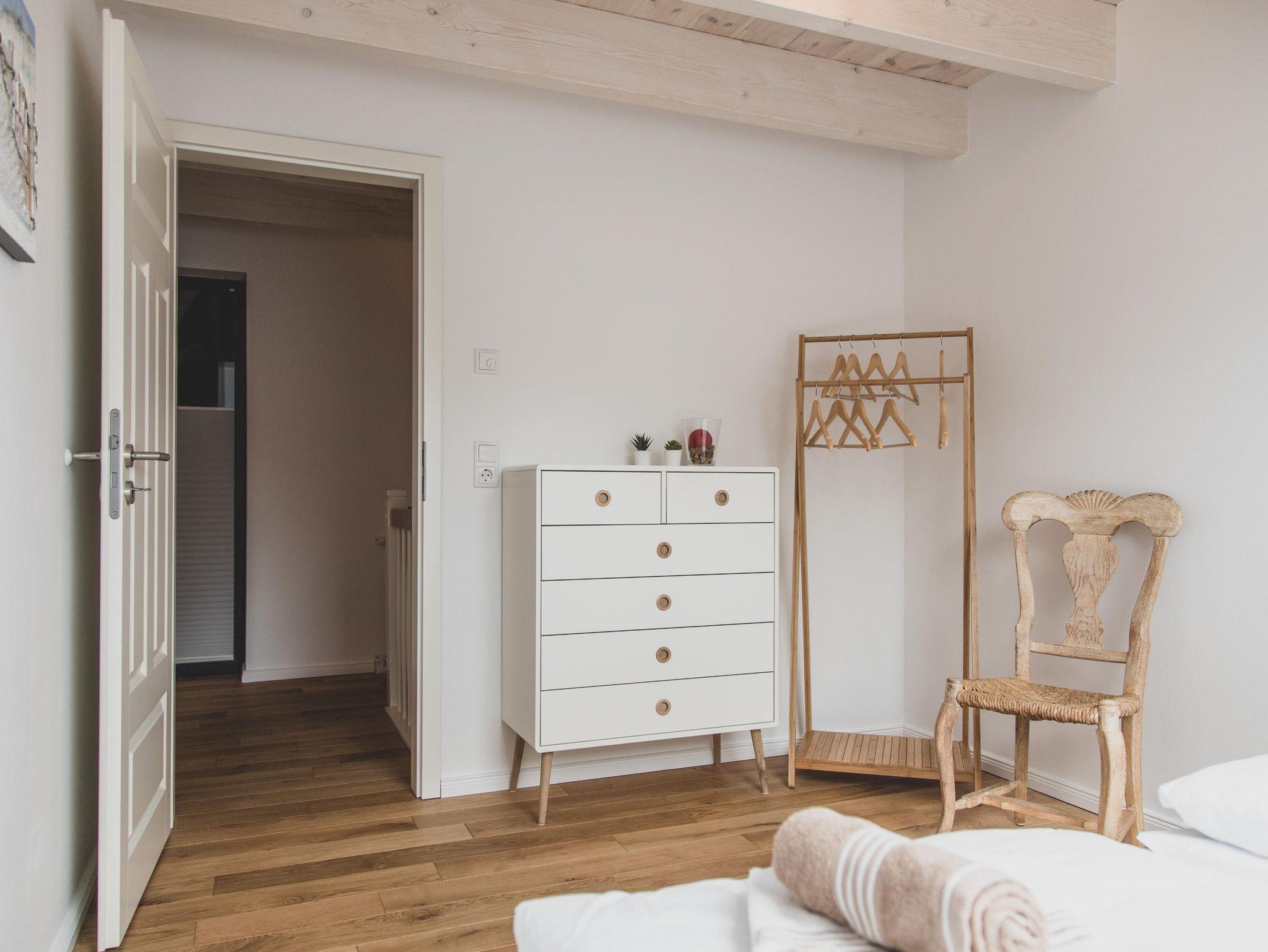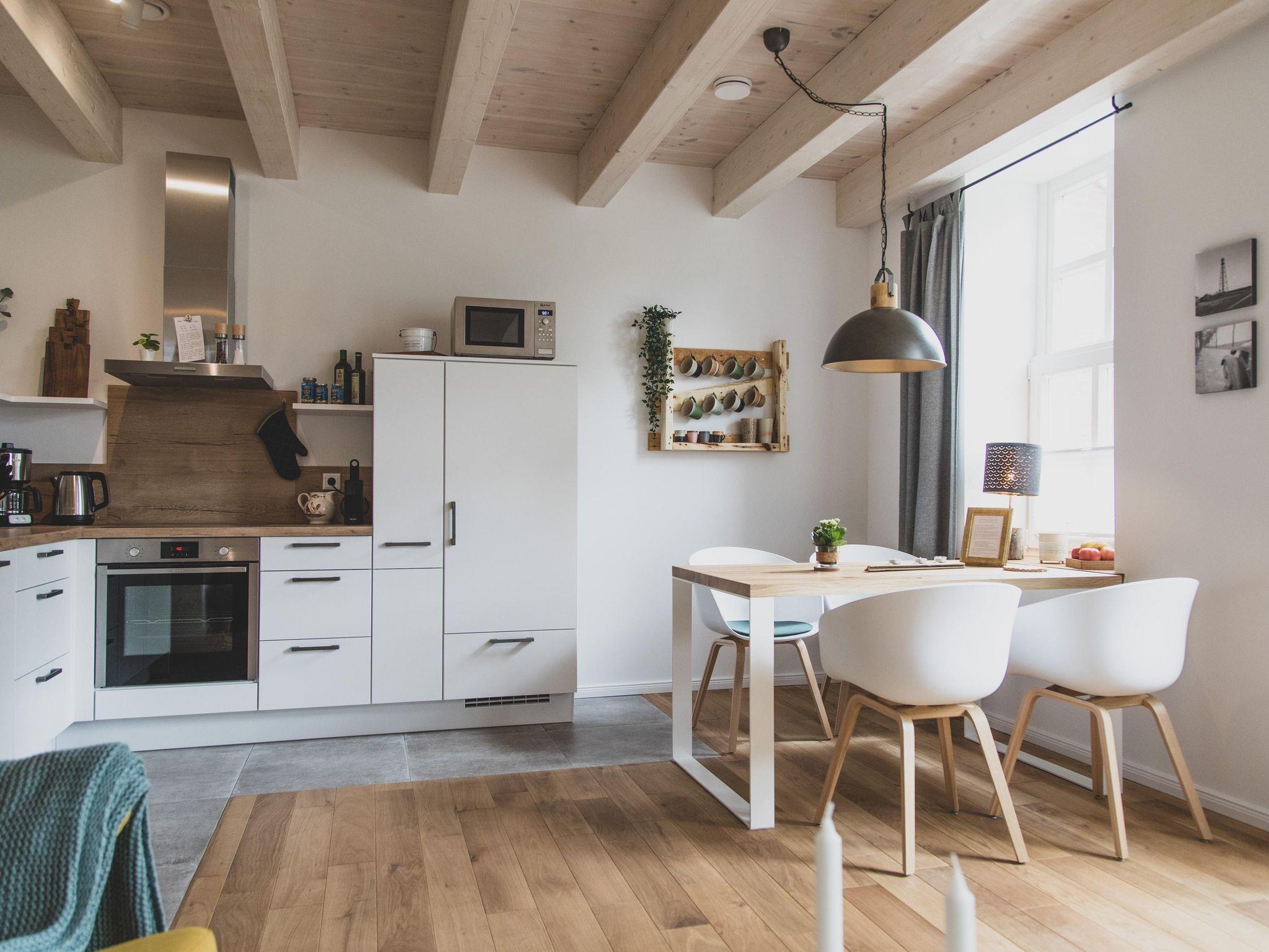 Die großen Blockrahmenfenster, die Balkendecken und das Echtholzparkett prägen das Erscheinungsbild der hellen Ferienwohnung. Sie wurde mit viel Liebe zum Detail eingerichtet und Materialien vom Strand, aus der Bauphase und alte Teile des historischen Ständerwerks runden den Charme der Wohnung ab.