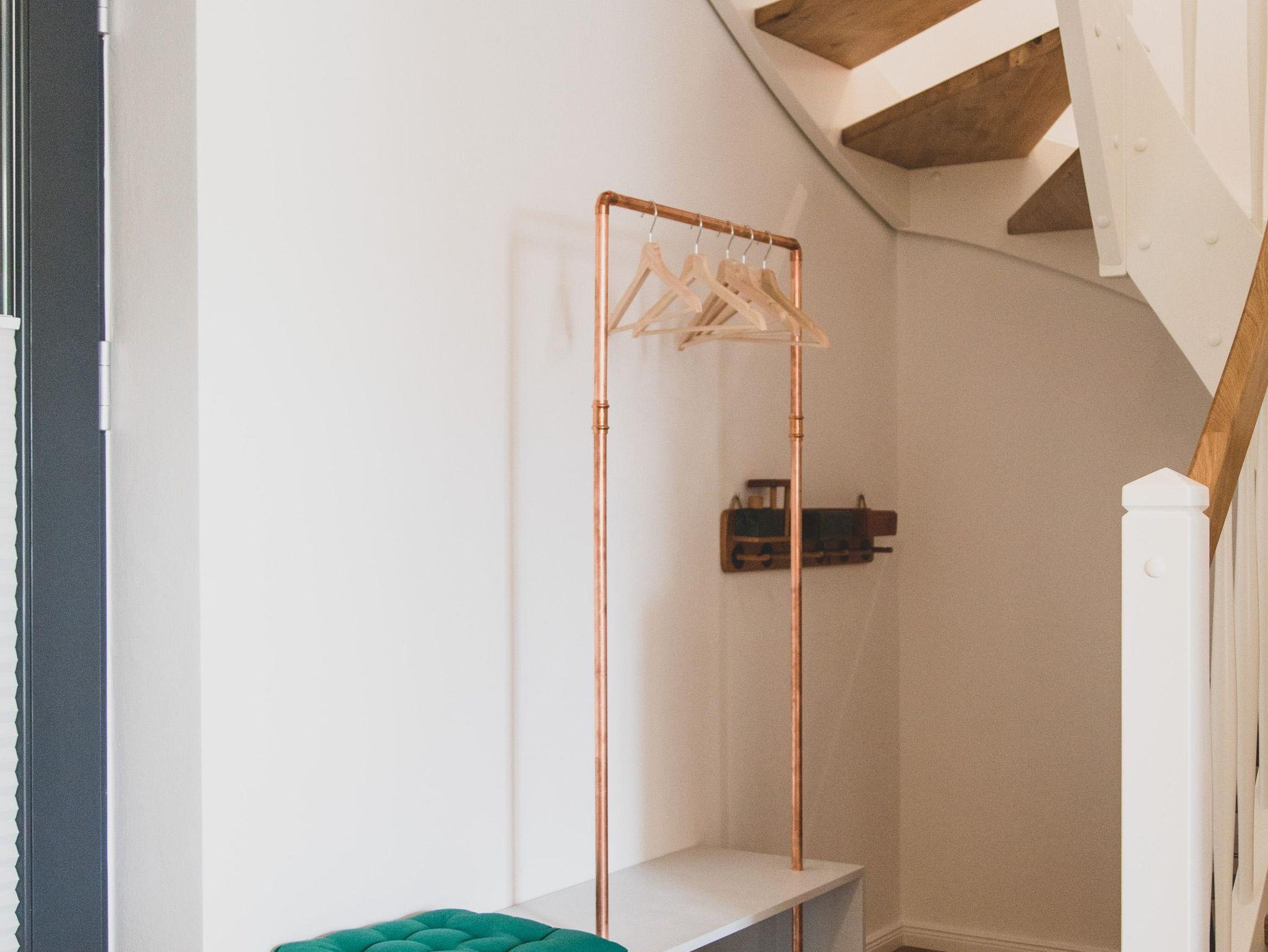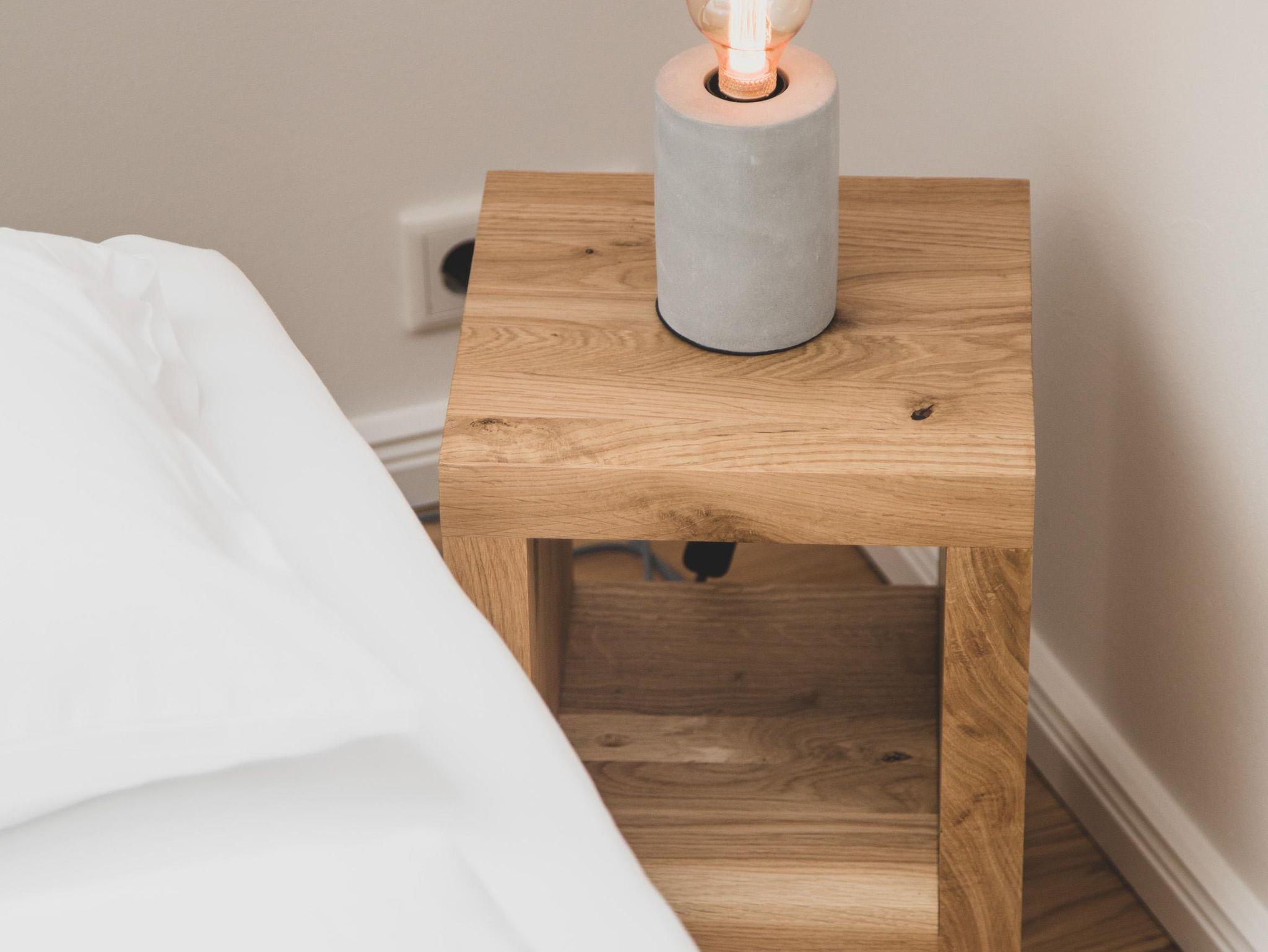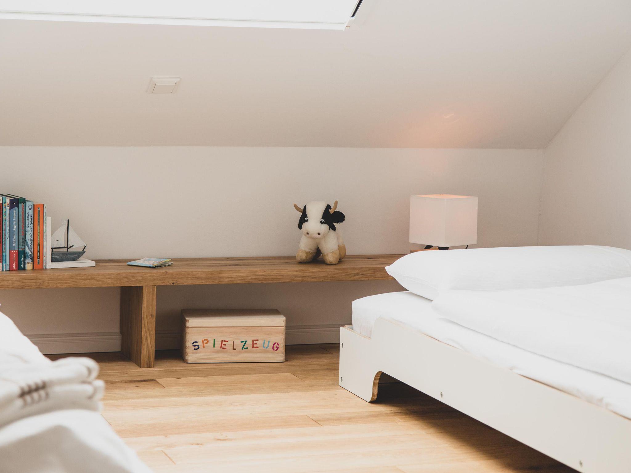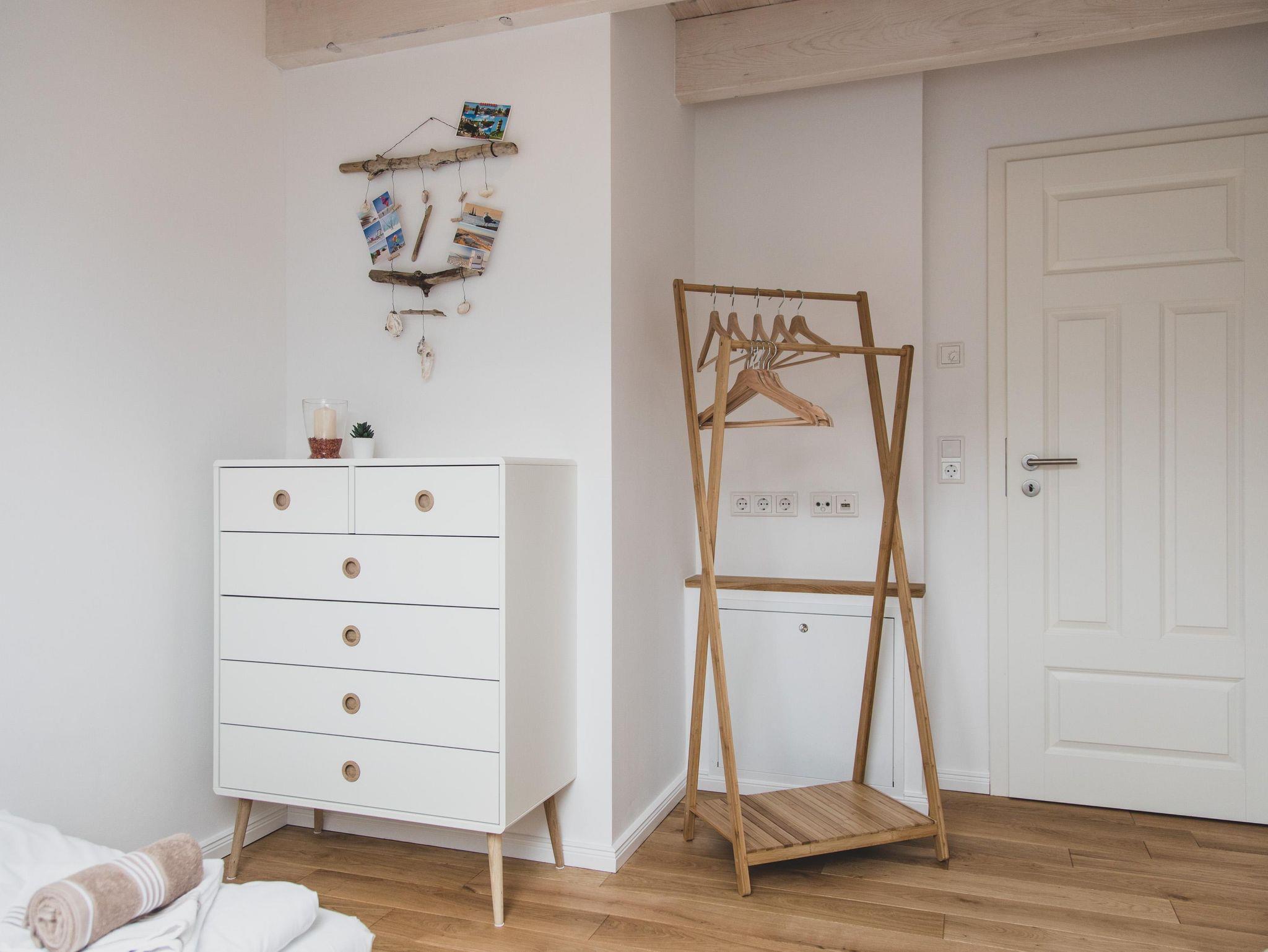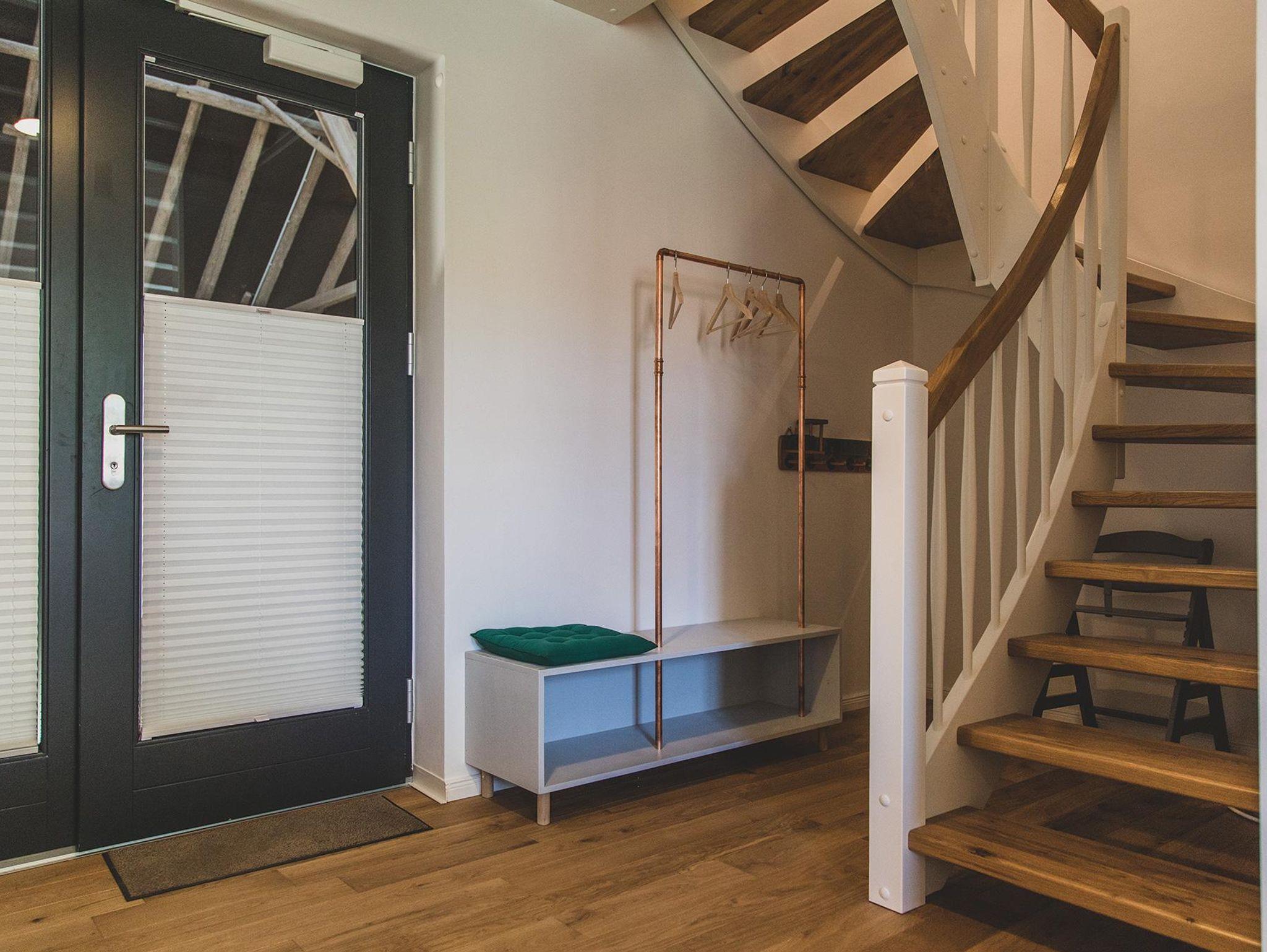 Die großen Blockrahmenfenster, die Balkendecken und das Echtholzparkett prägen das Erscheinungsbild der hellen Ferienwohnung. Sie wurde mit viel Liebe zum Detail eingerichtet und Materialien vom Strand, aus der Bauphase und alte Teile des historischen Ständerwerks runden den Charme der Wohnung ab.