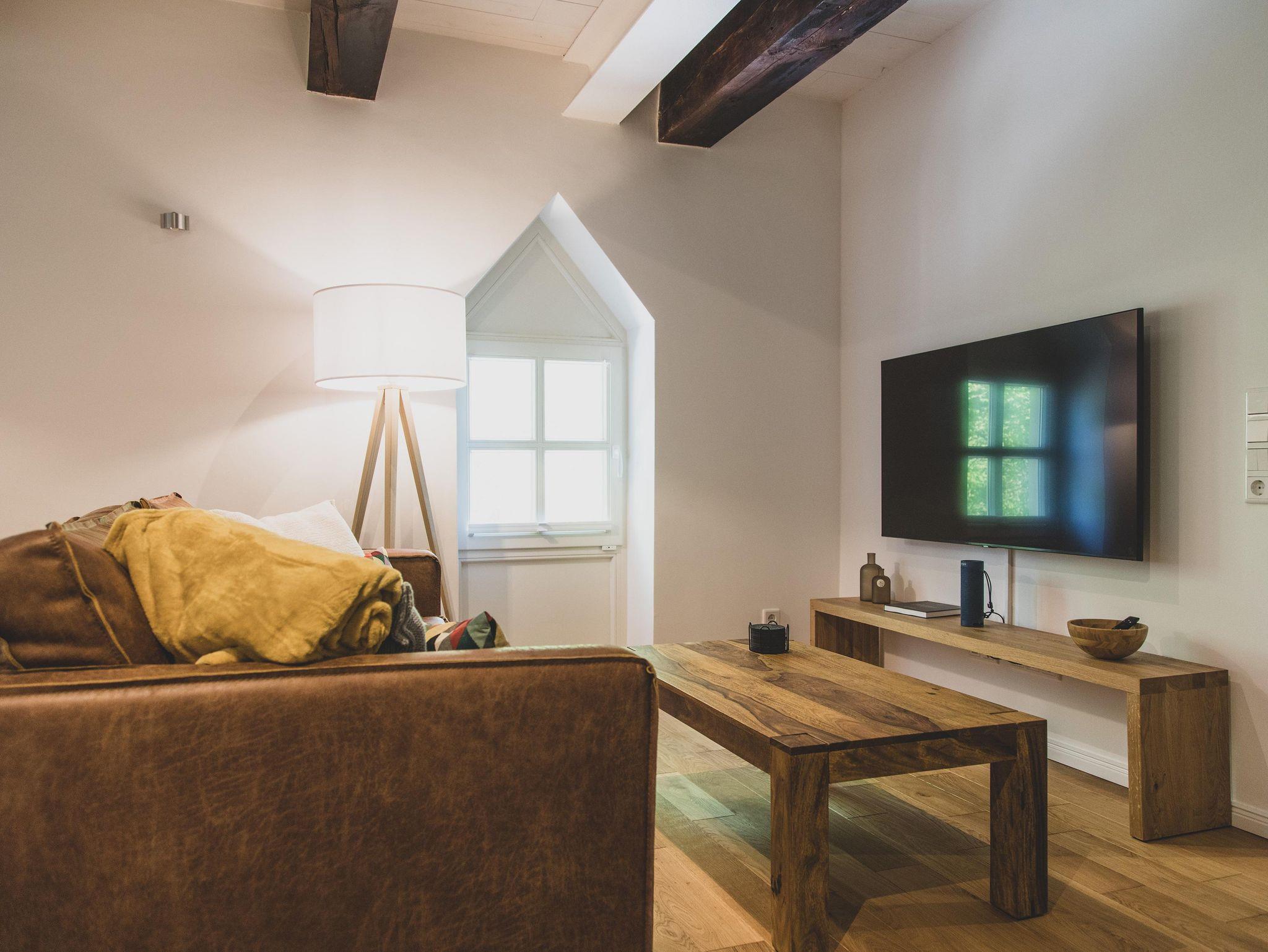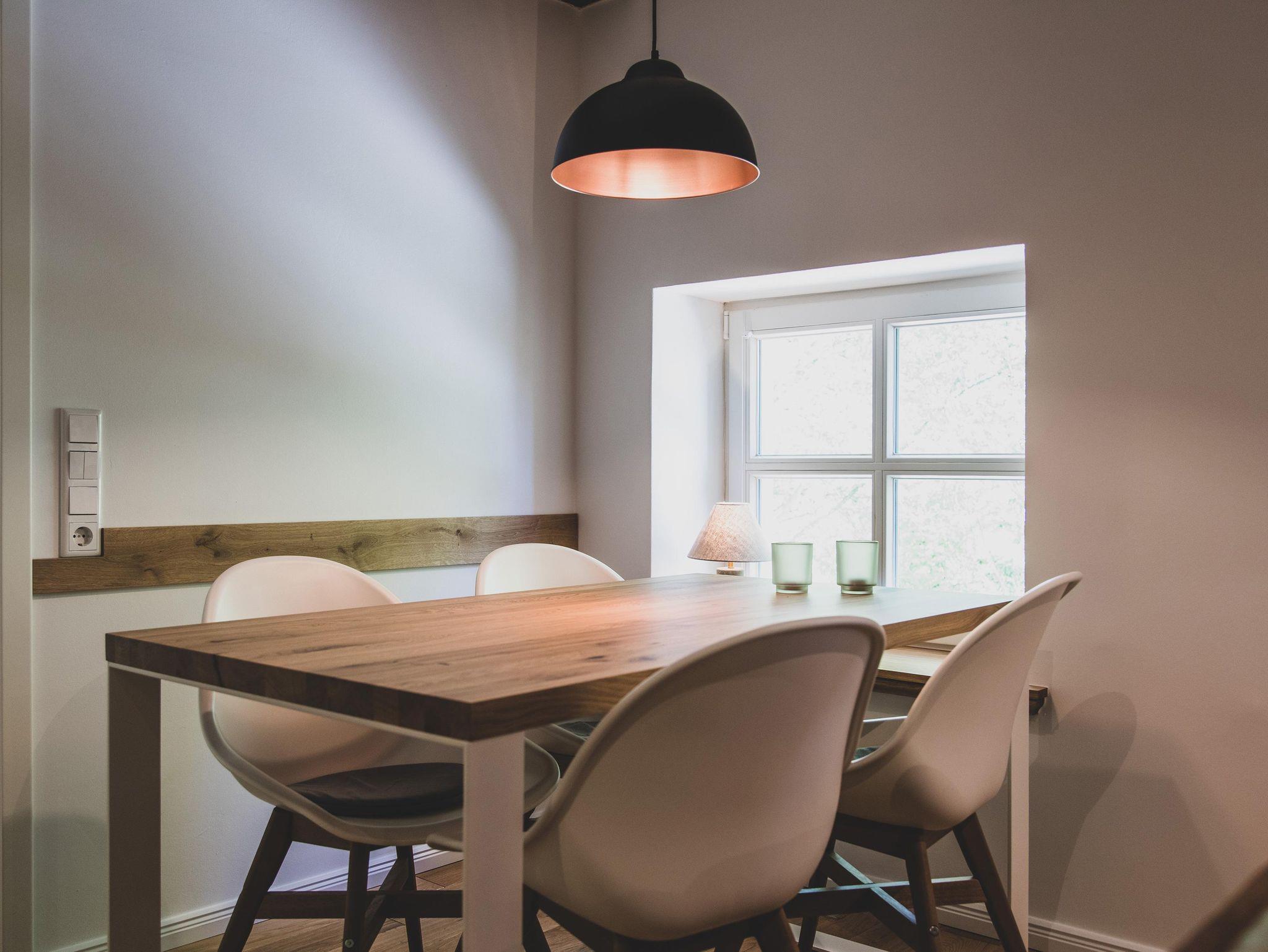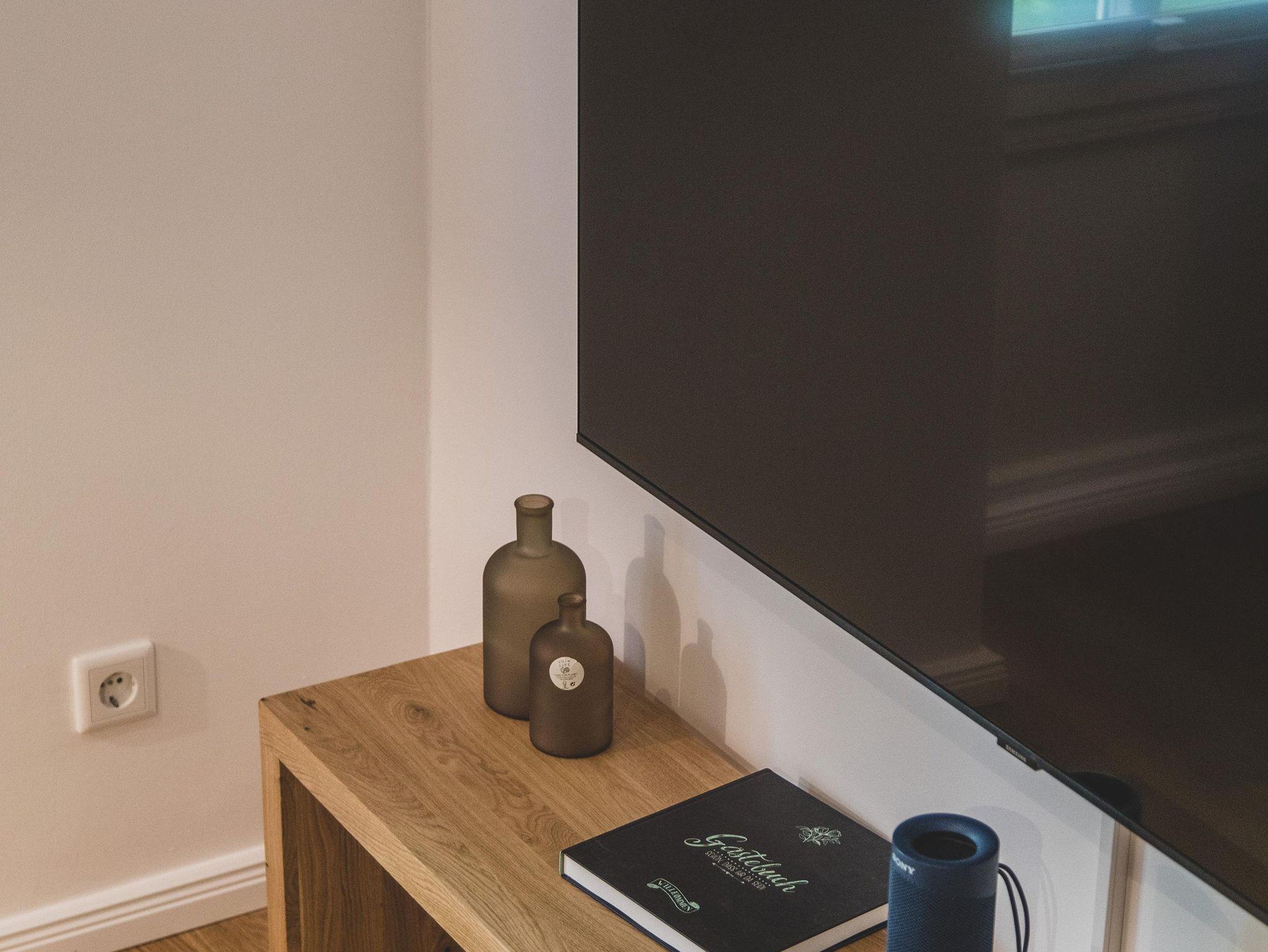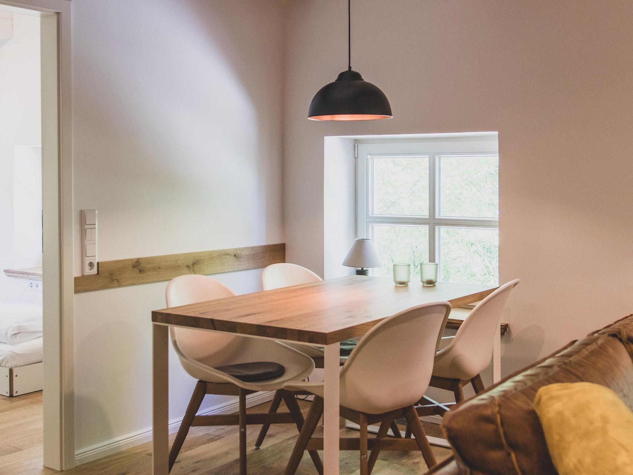 Unsere Wohnungen im Vorderhaus des Ferienhofs verfügen über hohe Decken mit durchgehend erhaltenen alten Deckenbalken. Die historischen Blockrahmenfenster und Fensterläden wurden in Handarbeit neu erstellt und runden den Anblick des denkmalgeschützten Gulfhofs ab. Im ehemaligen Scheunentrakt befinden sich durch bodentiefe Fenster helle und großzügig geschnittene Wohnungen. Alle Ferienwohnungen sind individuell, modern und mit viel Liebe zum Detail eingerichtet und bieten von der Terrasse einen erholsamen Blick auf die Grünflächen mit altem Baumbestand.