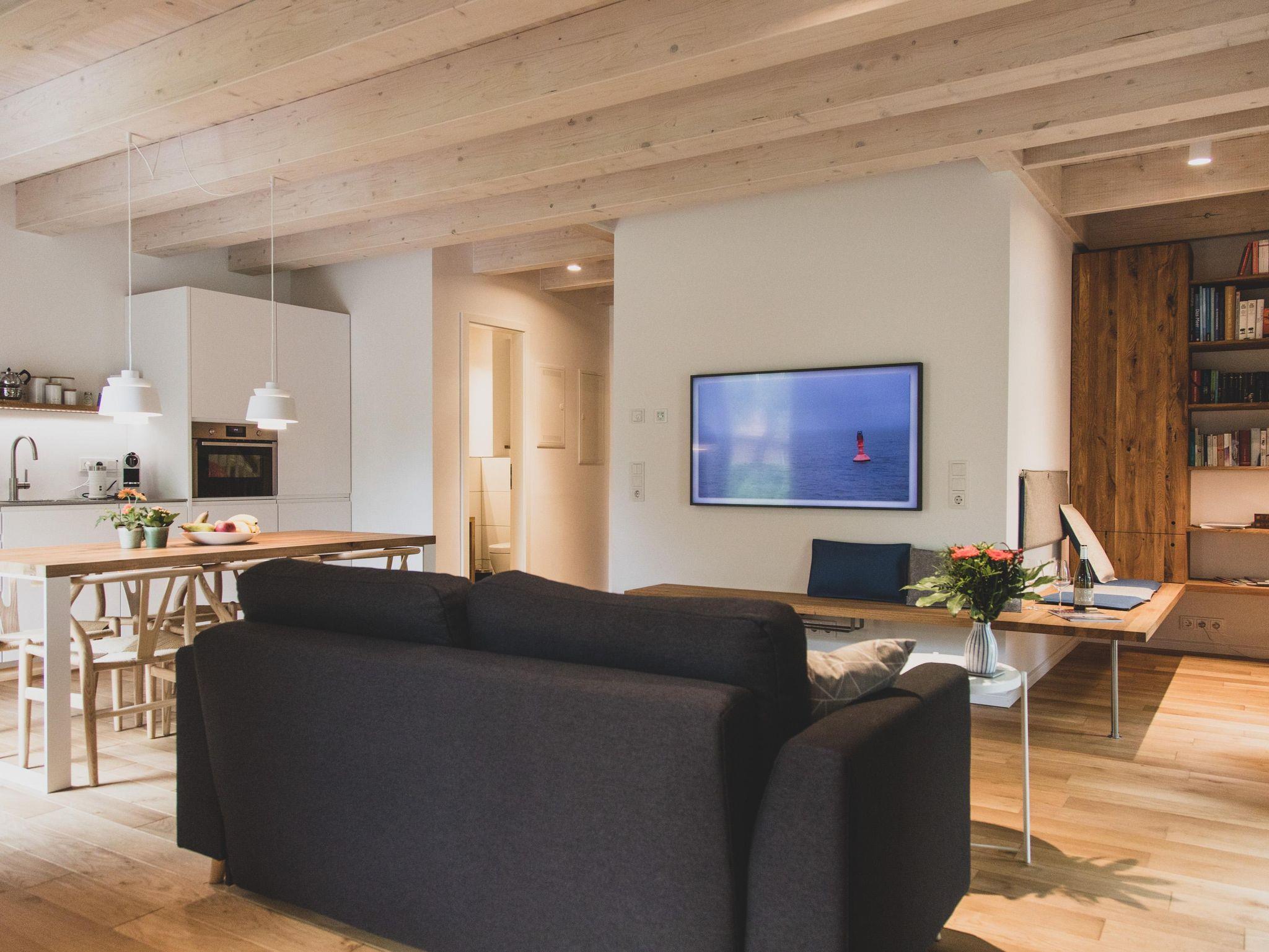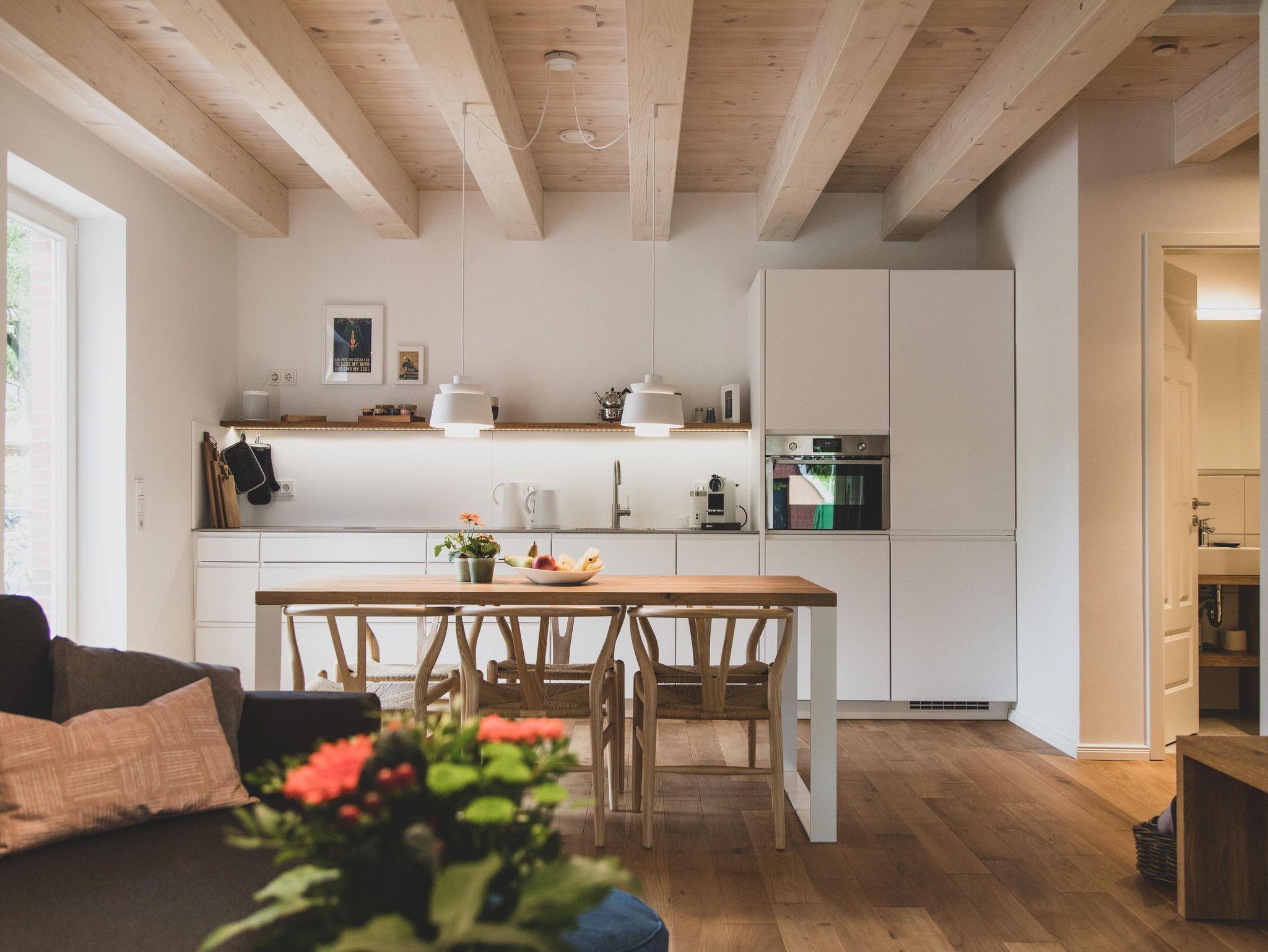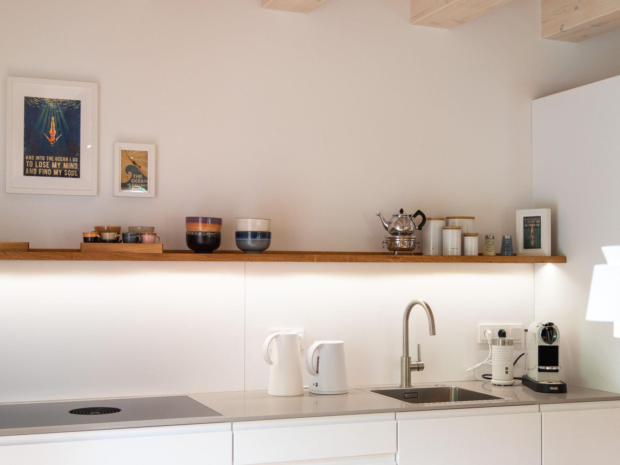 Die moderne und umfangreich ausgestattete Küche ist mit einem Bora-Kochfeld, Backofen/Mikrowelle, Geschirrspüler und einem großen Kühlschrank ausgestattet. Kochliebhaber können sich voll entfalten. Für diejenigen, die statt eines Ostfriesentees lieber frischen Kaffee bevorzugen, steht eine Nespressomaschine nebst Milchaufschäumer zur Verfügung.