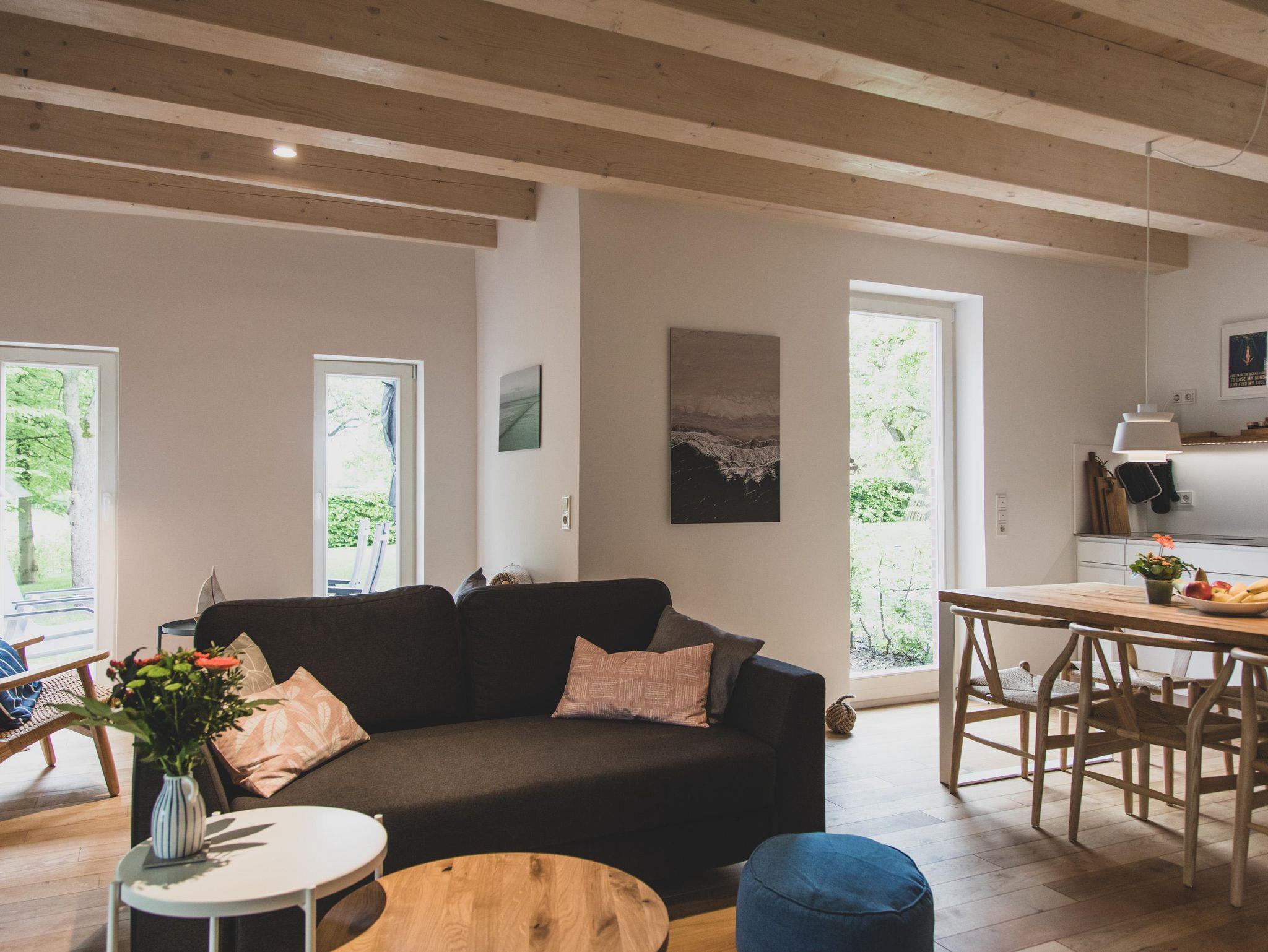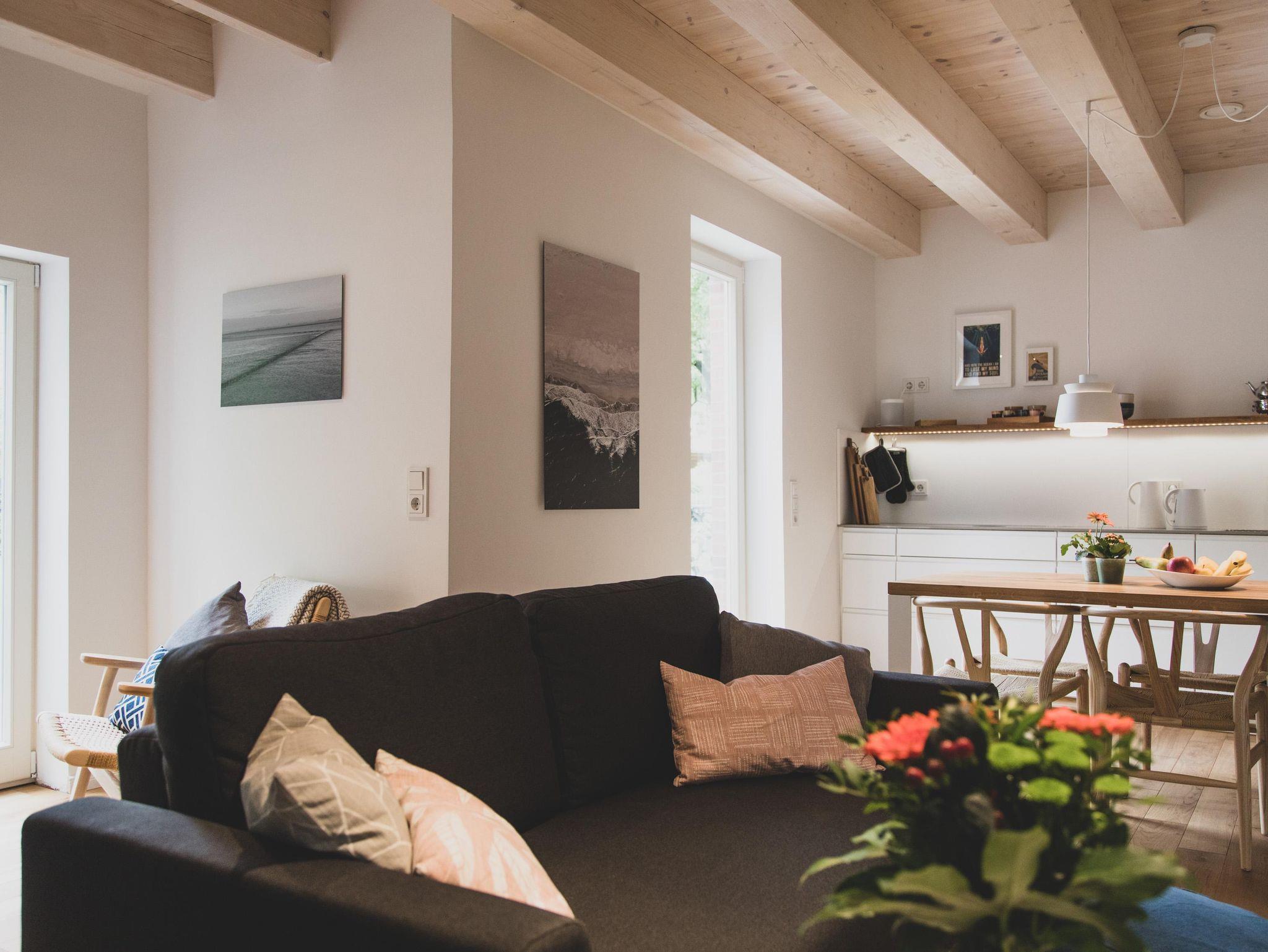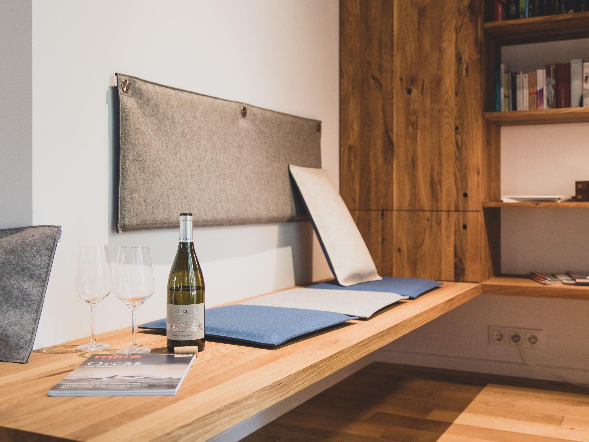 Mediale Unterhaltung bieten ein großer Fernseher mit SAT-Anschluss und kostenloses WLAN. Über das Sonos-System kannst Du Deine Lieblingsmusik abspielen. In der separaten Leseecke oder in gemütlichen Sesseln mit direktem Blick in den Birnengarten lässt es sich beim Ostfriesentee entspannt in den bereitgestellten Büchern schmökern – auch Reiseführer liegen zur optimalen Planung Deines Aufenthalts bereit.