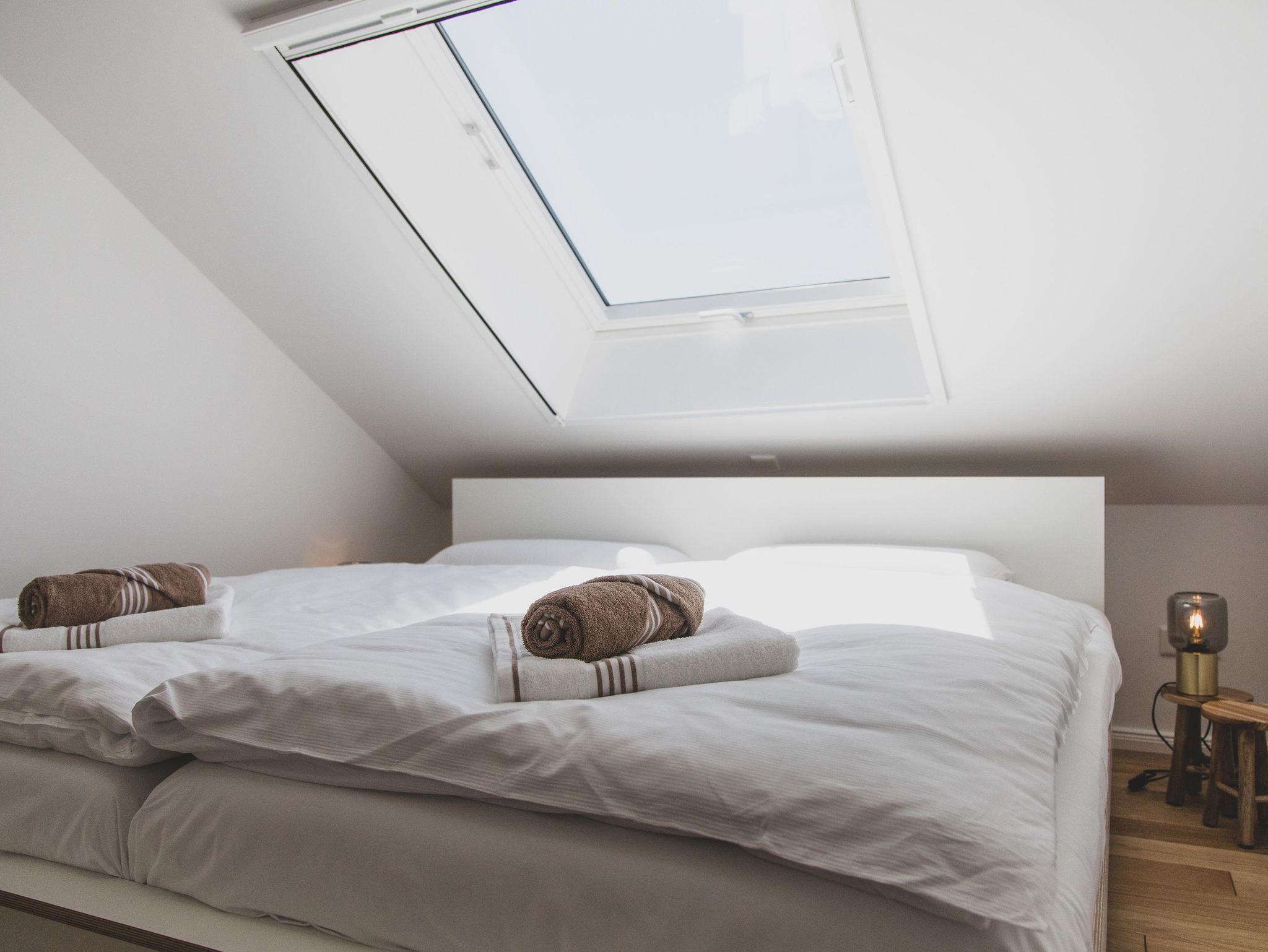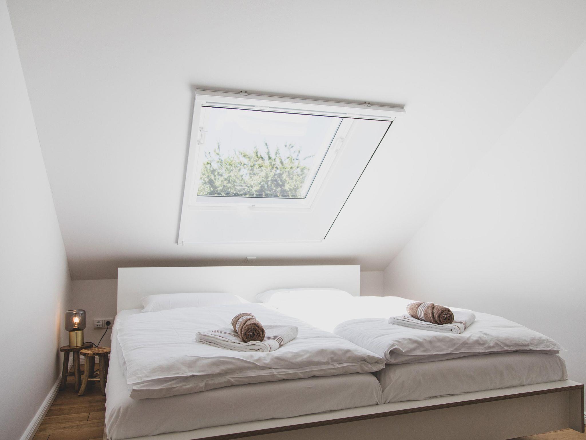 Hohe Decken, dicke Balken und große Fenster prägen das Erscheinungsbild der hellen Wohnung. Holzdielen, moderne Einrichtung, ausgesuchte Details und Bilder runden den Charme der Wohnung ab. Gartenmöbel, Sonnenschirm und Grill stehen zur Benutzung bereit. Schlafzimmer 1 bietet ein Doppelbett und den unverbauten Blick in den Garten und die Natur. Im zweiten Schlafzimmer finden Sie 2 Einzelbetten. Ein großzügiges Bad mit Dusche lädt zur Entspannung ein.