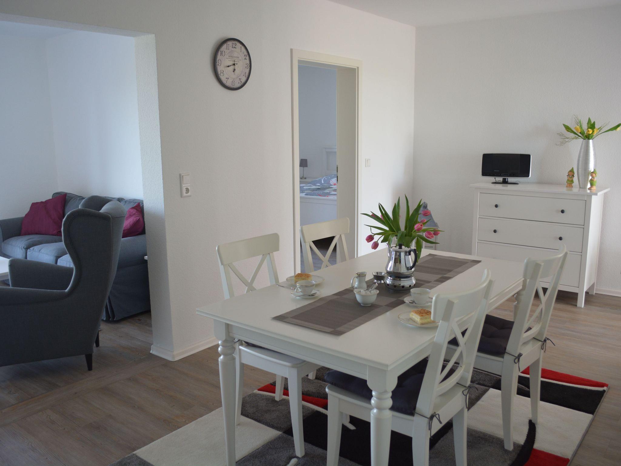 Die ebenerdige sowie hell und modern eingerichtete Ferienwohnung (ca. 60 qm) bietet Platz für 2 Personen. Sie verfügt über ein Schlafzimmer mit Doppelbett 1,80 m x 2,00 m sowie einem großzügigen Wohn- und Essbereich mit angegliederter Küche. Diese ist mit einem E- Herd mit Backofen, Kühlschrank mit Gefrierfach, Toaster, Wasserkocher und Kaffeemaschine ausgestattet. SAT-TV und eine Stereoanlage sind vorhanden. Das Bad mit ebenerdiger Dusche und WC ist zusätzlich mit einer Fußbodenerwärmung ausgestattet. Vom Wohnzimmer aus haben Sie direkten Zugang zu Ihrer eigenen Terrasse. Diese ist mit Gartenmöbeln, Sonnenschirm und einem Grill ausgestattet. Der Internetzugang ist für unsere Gäste selbstverständlich kostenfrei. Wachmaschine und Wäschetrockner befinden sich ebenfalls in der Anlage und können gegen Gebühr genutzt werden. Handtücher und Bettwäsche werden einmalig gestellt (weitere Wechsel sind selbstverständlich gegen Gebühr möglich). Wir bitten im Interesse unserer allergischen Gäste um Verständnis, dass das Mitbringen von Haustieren nicht gestattet ist. Das Rauchen ist im Außenbereich möglich. Vermietung ausschließlich an Feriengäste, nicht an Firmen.