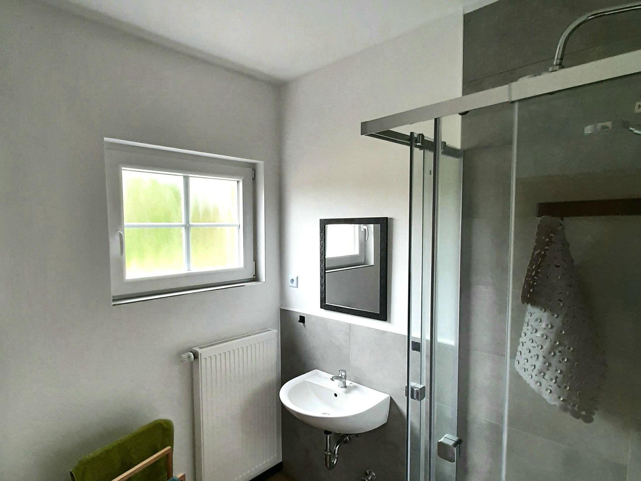 Bad mit Dusche und Fön. Handtücher können dazu gebucht werden. (8 Euro pro Person)