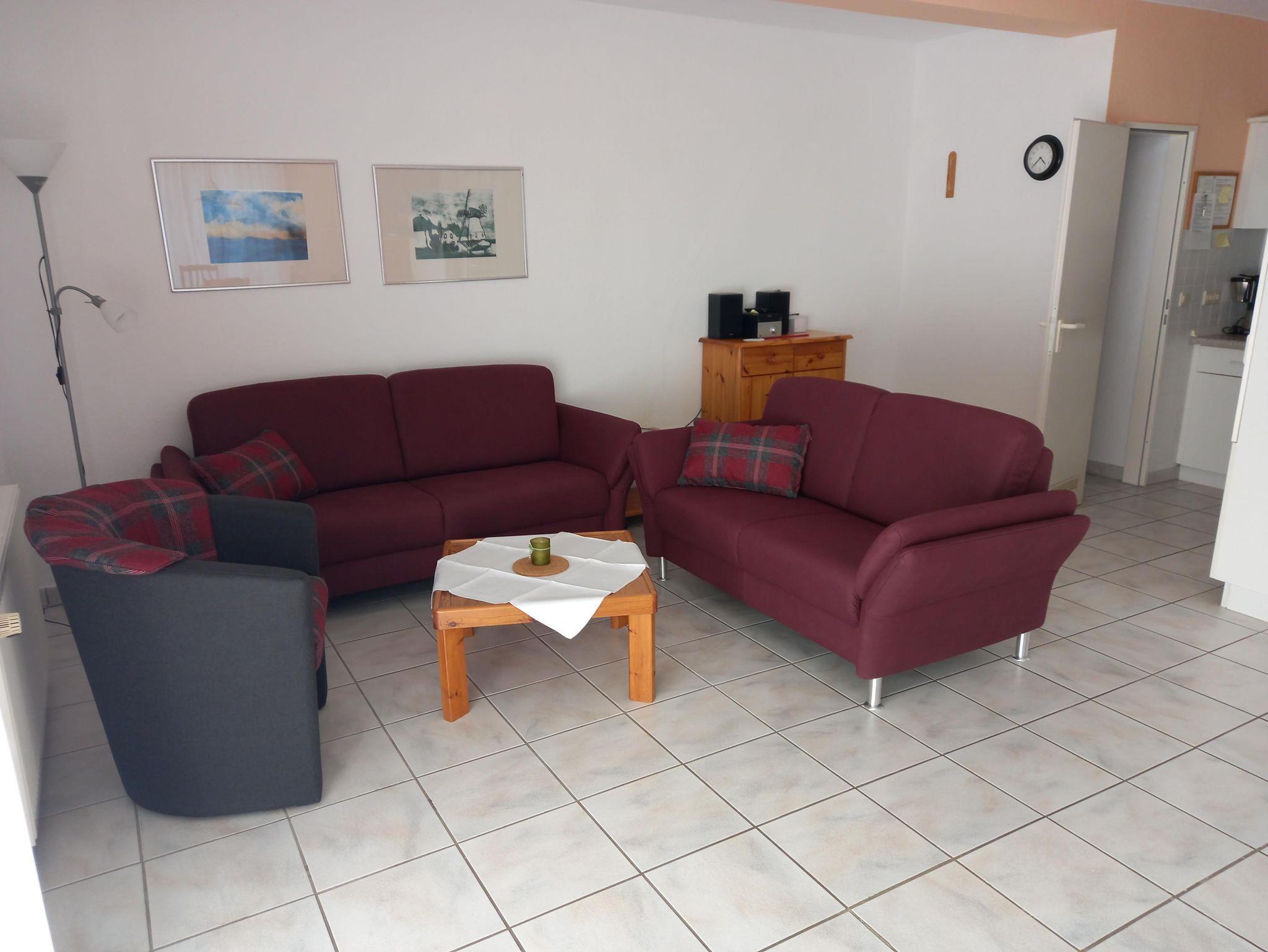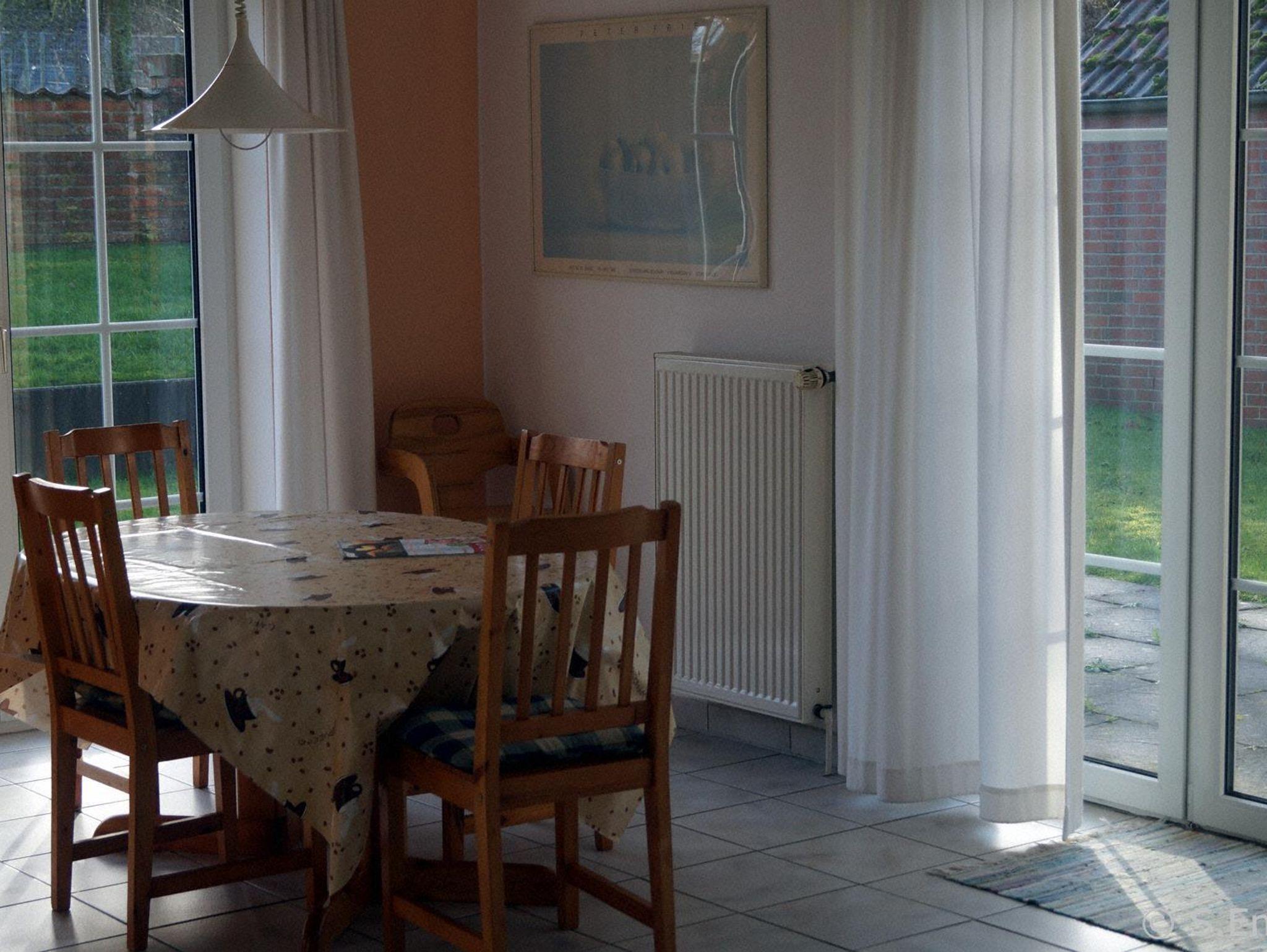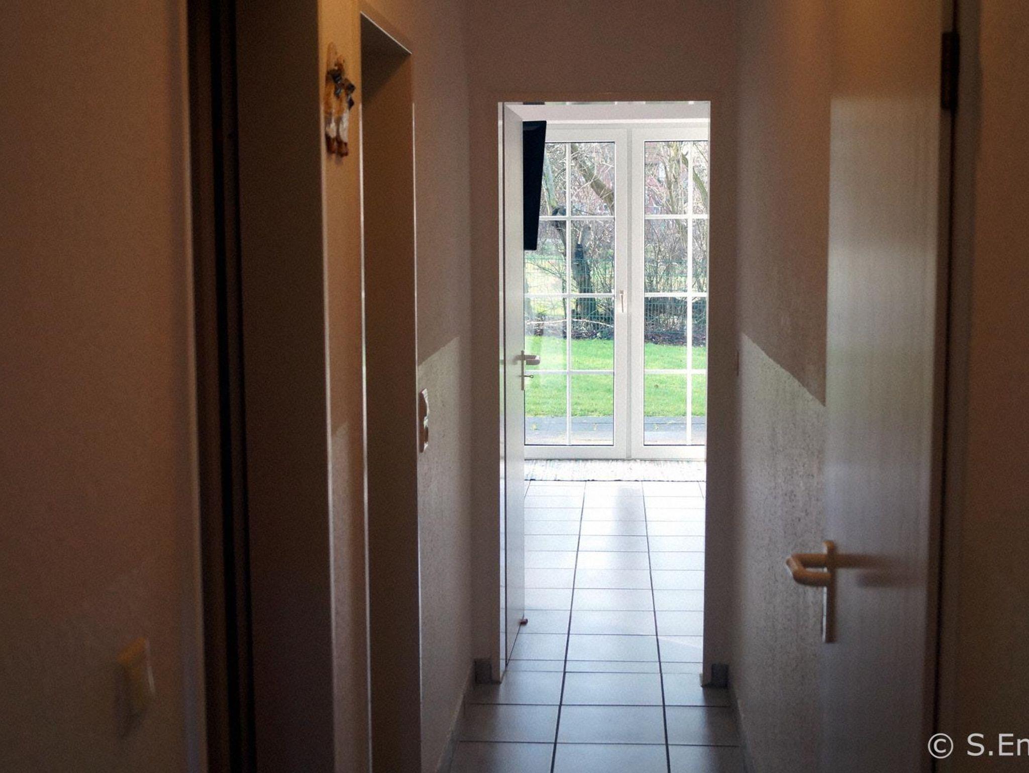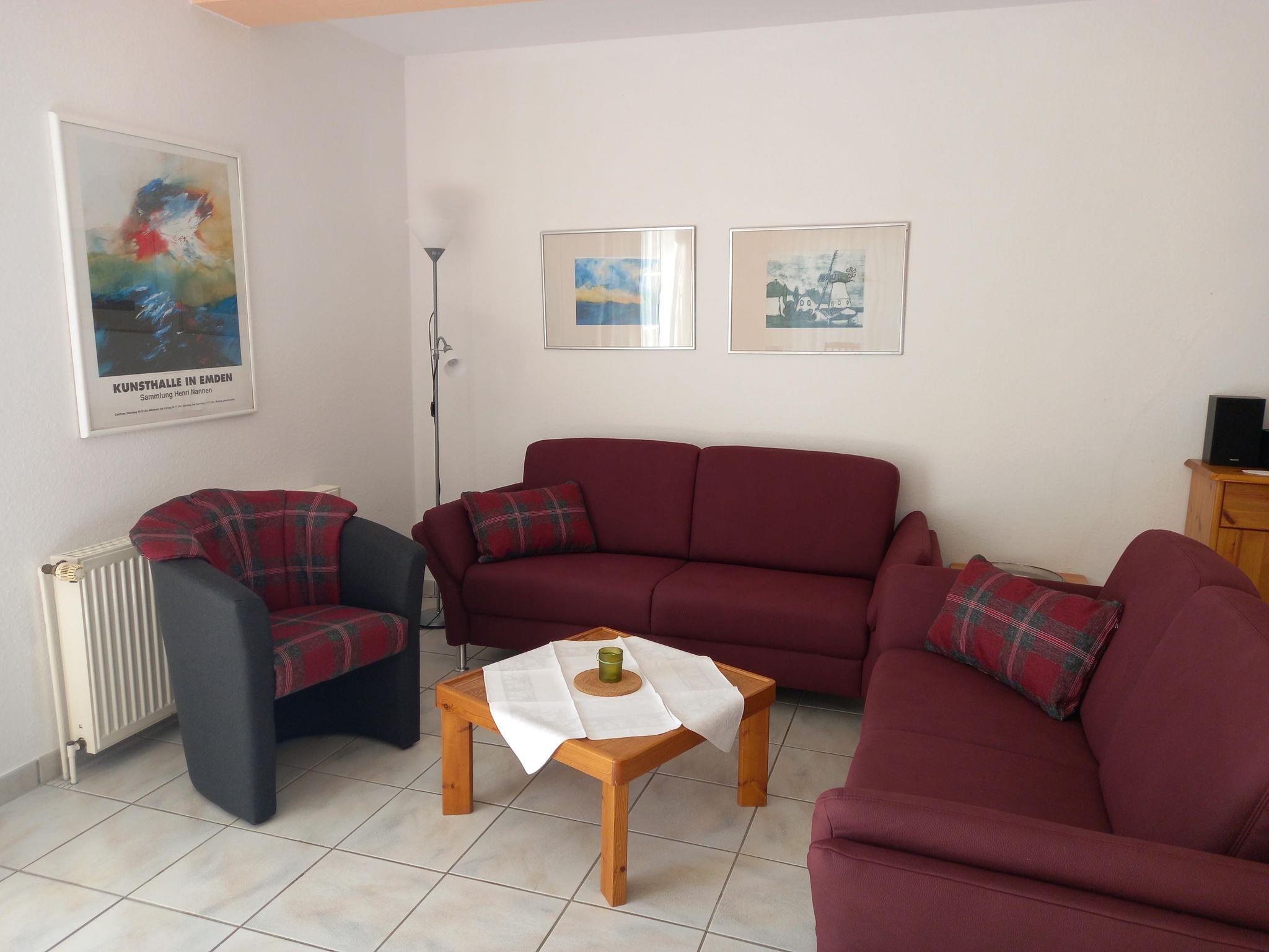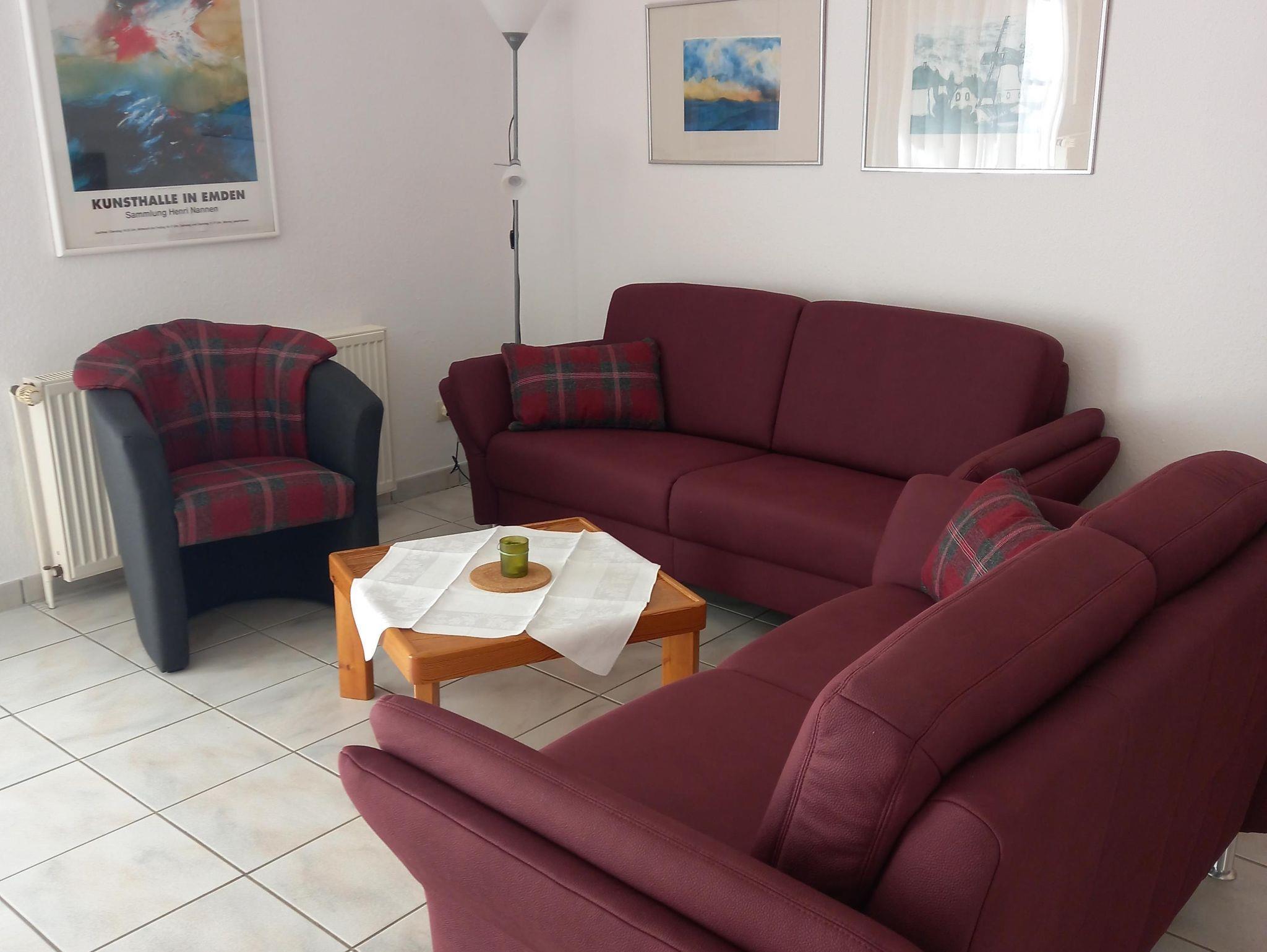 Die Wohnung ist ca. 60 qm groß; sehr hell und ruhig gelegen mit einem großen Wohn-/Essbereich und einer Küchenzeile. Die gut ausgestattete Küche verfügt über Backofen, Kaffeemaschine, Wasserkocher, kleiner Microwelle, Kühlschrank und Geschirrspülmaschine. Die 2 Schlafzimmer sind mit einem Doppelbett bzw. mit 2 Einzelbetten ausgestattet. Die Fenster sind mit Fliegenschutzgittern versehen. Im Wohn-/Essbereich ist ein 40 Zoll Sony Flachbildschirm (an der Wand hängend) mit Sat-TV & RADIO und DVD-Player sowie eine Sony Mikrostereoanlage vorhanden. Die Wohnung hat eine ca. 30 qm große Terrasse, diese ist überwiegend windgeschützt . An die Terrasse grenzt der Garten mit Blick in die Meede, Fernsicht bis nach Emshaven bei gutem Wetter. Gartenmöbel sind im Abstellhaus im Garten vorhanden. Im Abstellhäuschen können auch mitgebrachte Fahrräder untergestellt werden. Die Wohnung ist ideal für Familien mit 2 Kindern oder für max. 4 Erwachsene.