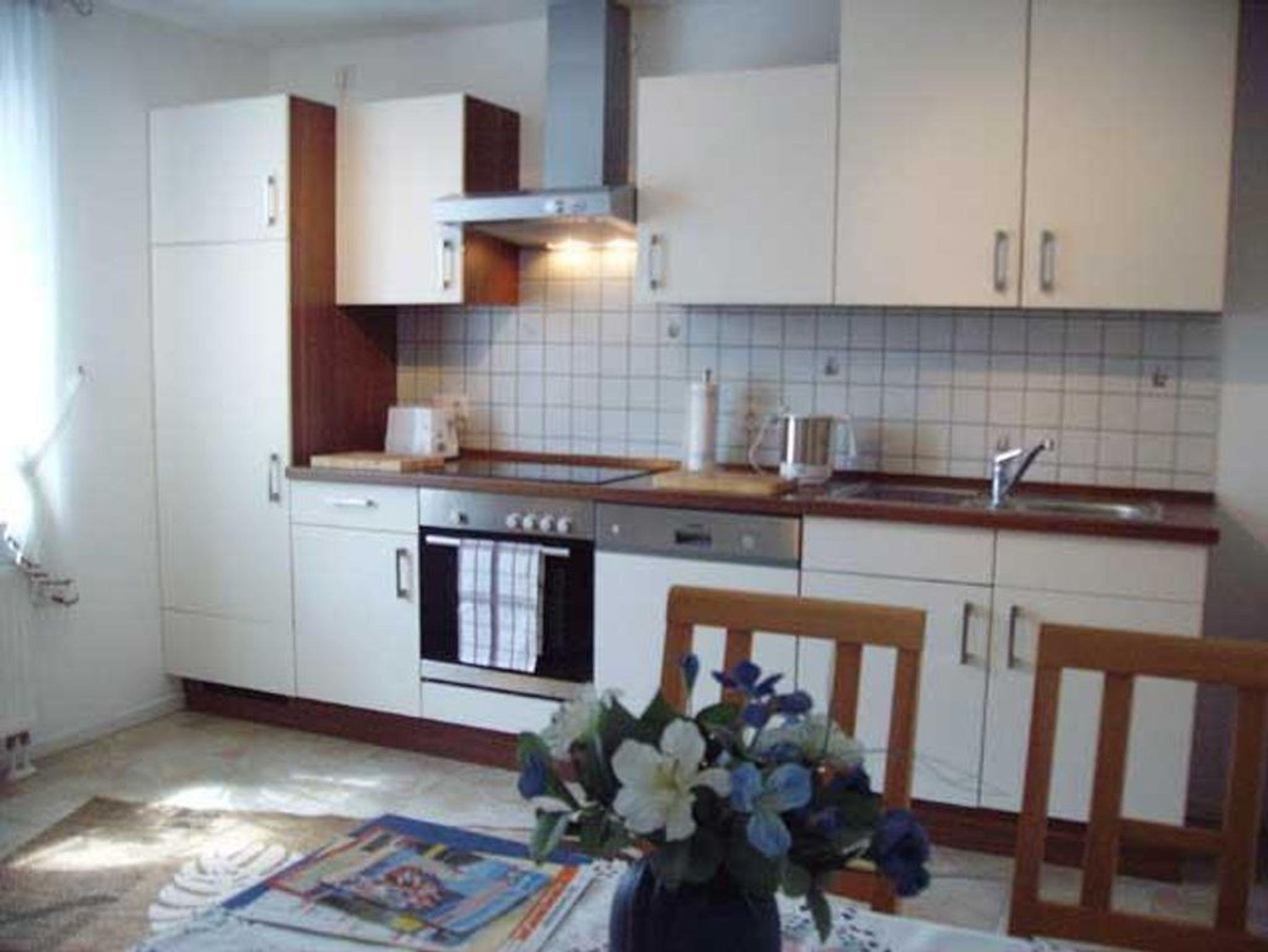 Die ca. 65 qm große Ferienwohnung liegt im Obergeschoss und ist für bis zu 4 Personen und einem Baby. Wenn Sie in die Ferienwohnung gehen befindet sich links das gemütliche Wohnzimmer mit seniorengerechtem Mobiliar und einem Schlafzimmer mit zwei getrennt stehenden Betten. Geradeaus befindet sich das Badezimmer mit Dusche/WC und Fußbodenheizung. Auf der rechten Seite finden Sie dann die helle und freundliche Küche mit Einbauküche und Essecke, wobei das zweite Schlafzimmer mit Doppelbett. Außerdem steht ihnen eine separate Terrasse zur freien Verfügung. Waschmaschine & Trockner können gegen eine geringe Gebühr genutzt werden. Langzeitvermietung zu Sonderkonditionen.