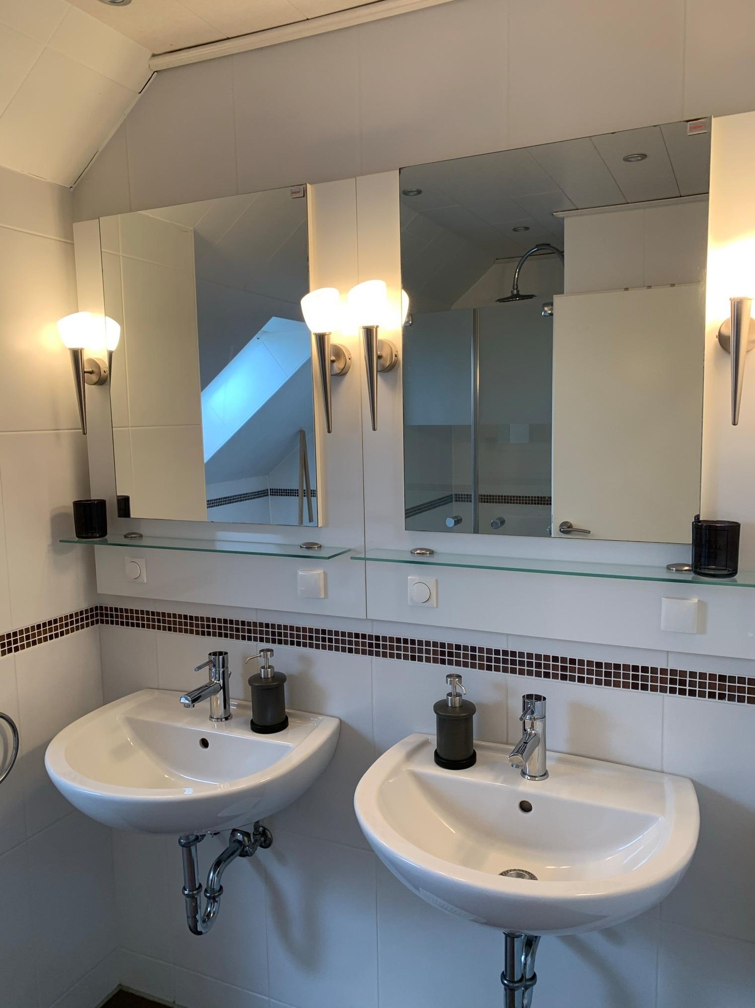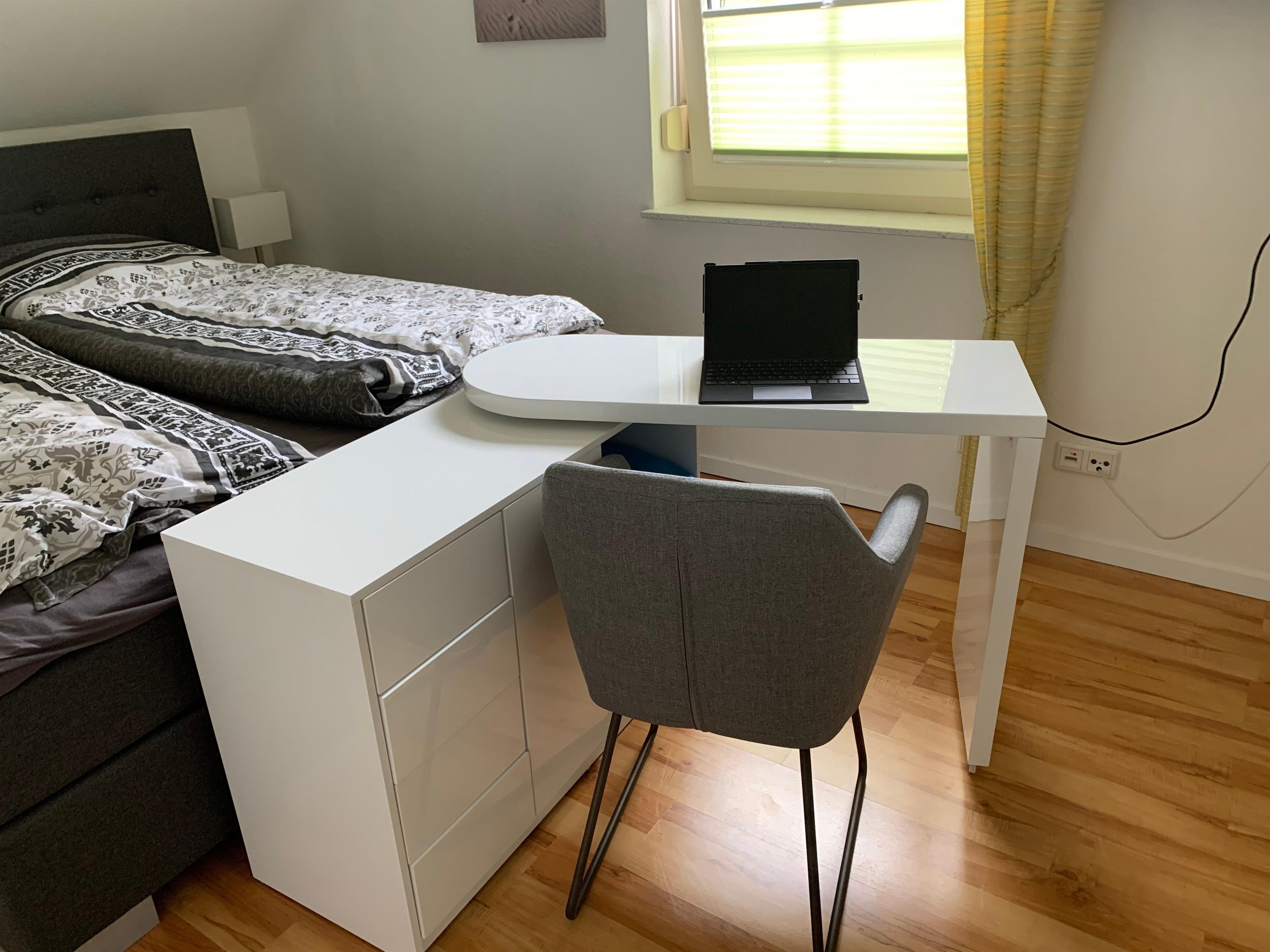 Vom Wohnzimmer aus, gelangen Sie über eine breite Metalltreppe in das ausgebaute Obergeschoss. Oben angekommen finden Sie zwei gemütliche Schlafzimmer mit Einbauschränken, sowie ein modernes Tageslichtbad mit Regendusche.