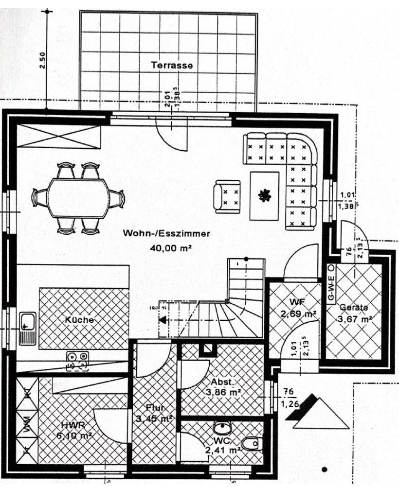 Das Raumangebot im Erdgeschoss wird durch ein WC, einen Abstellraum (auch für das Lagern der Koffer geeignet) und den privaten HW-Raum komplettiert.