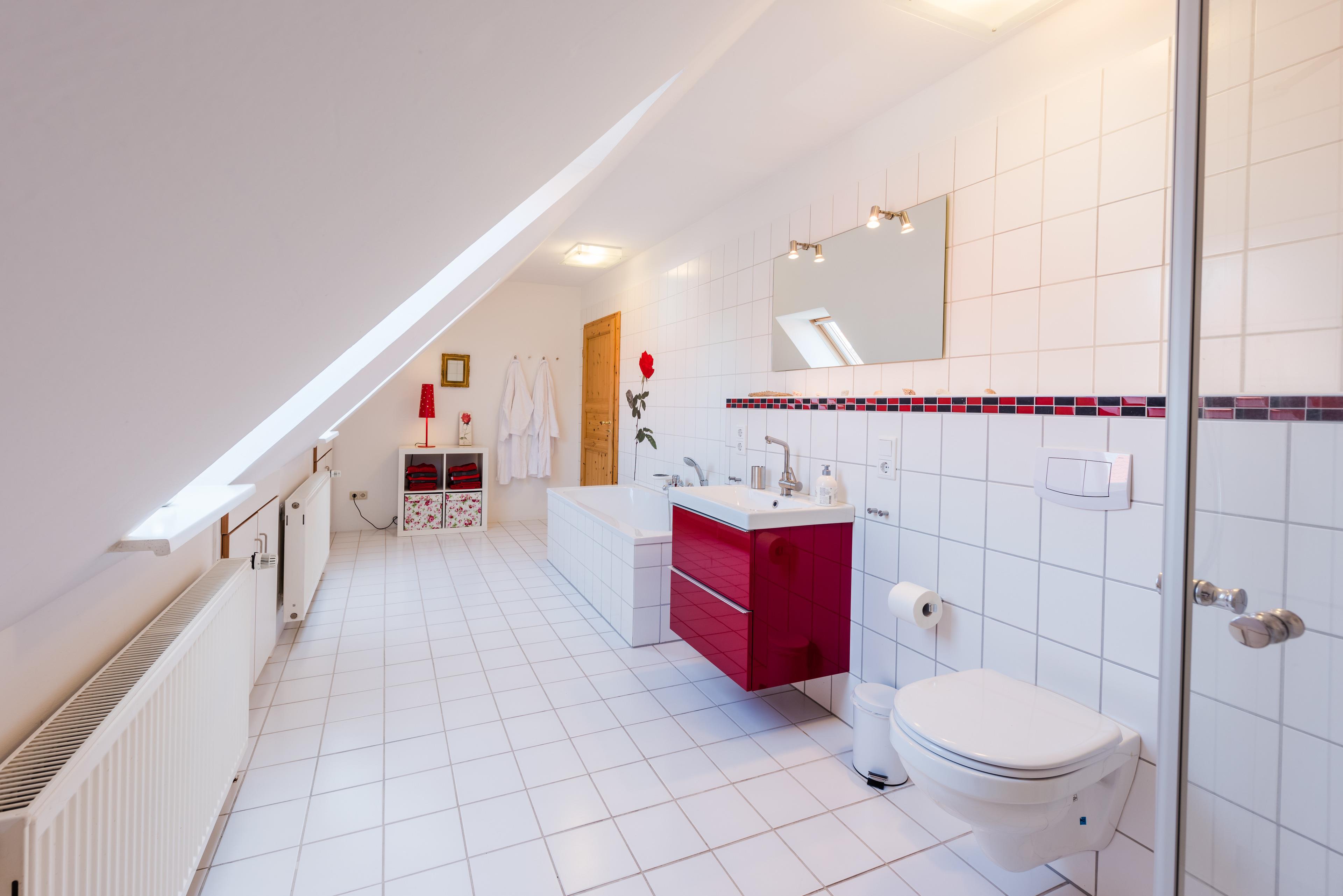 Das Design wird durchgängig bis hin zum Badezimmer mit Badewanne und Dusche von der Rose geprägt. Ein überraschendes Erlebnis.
