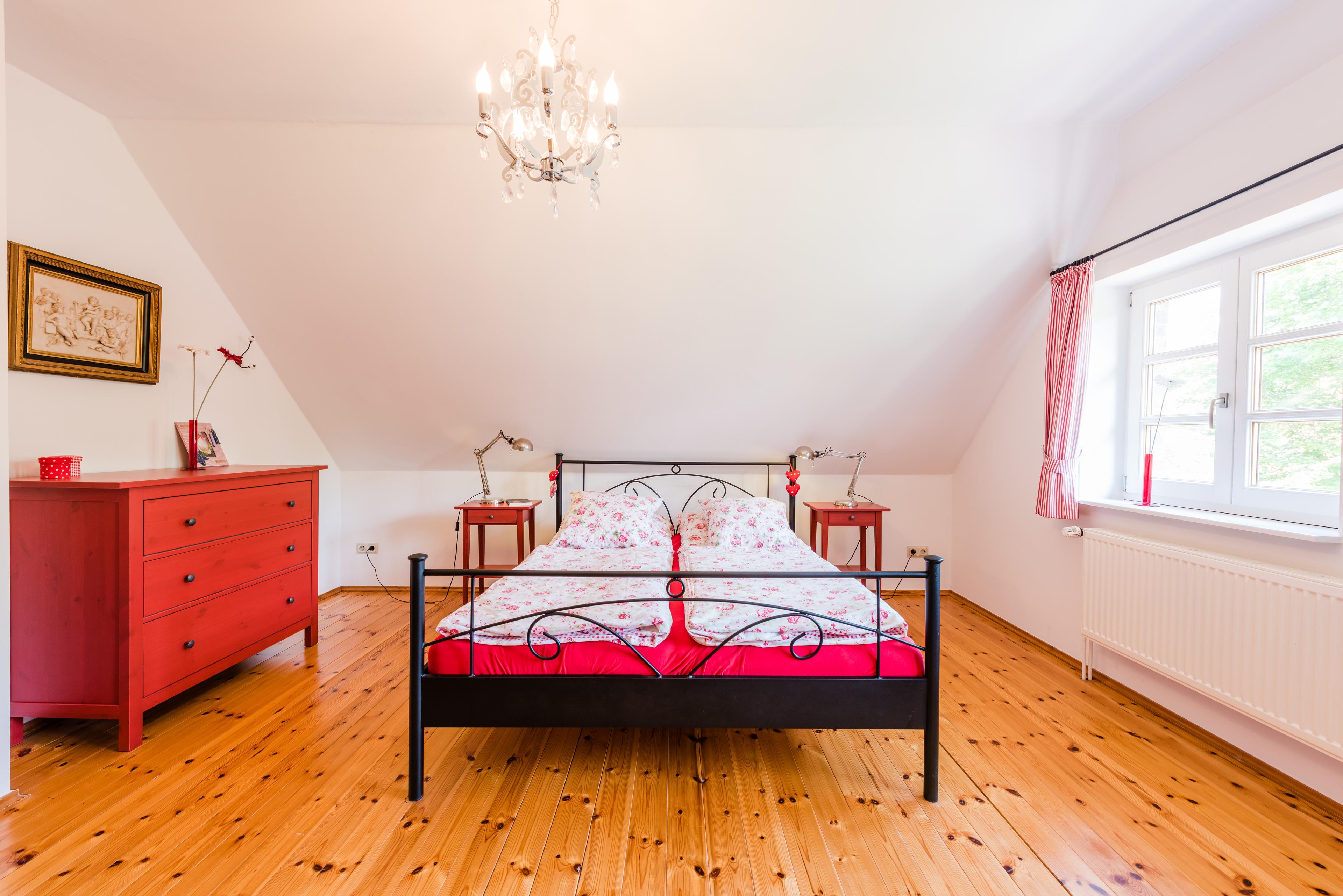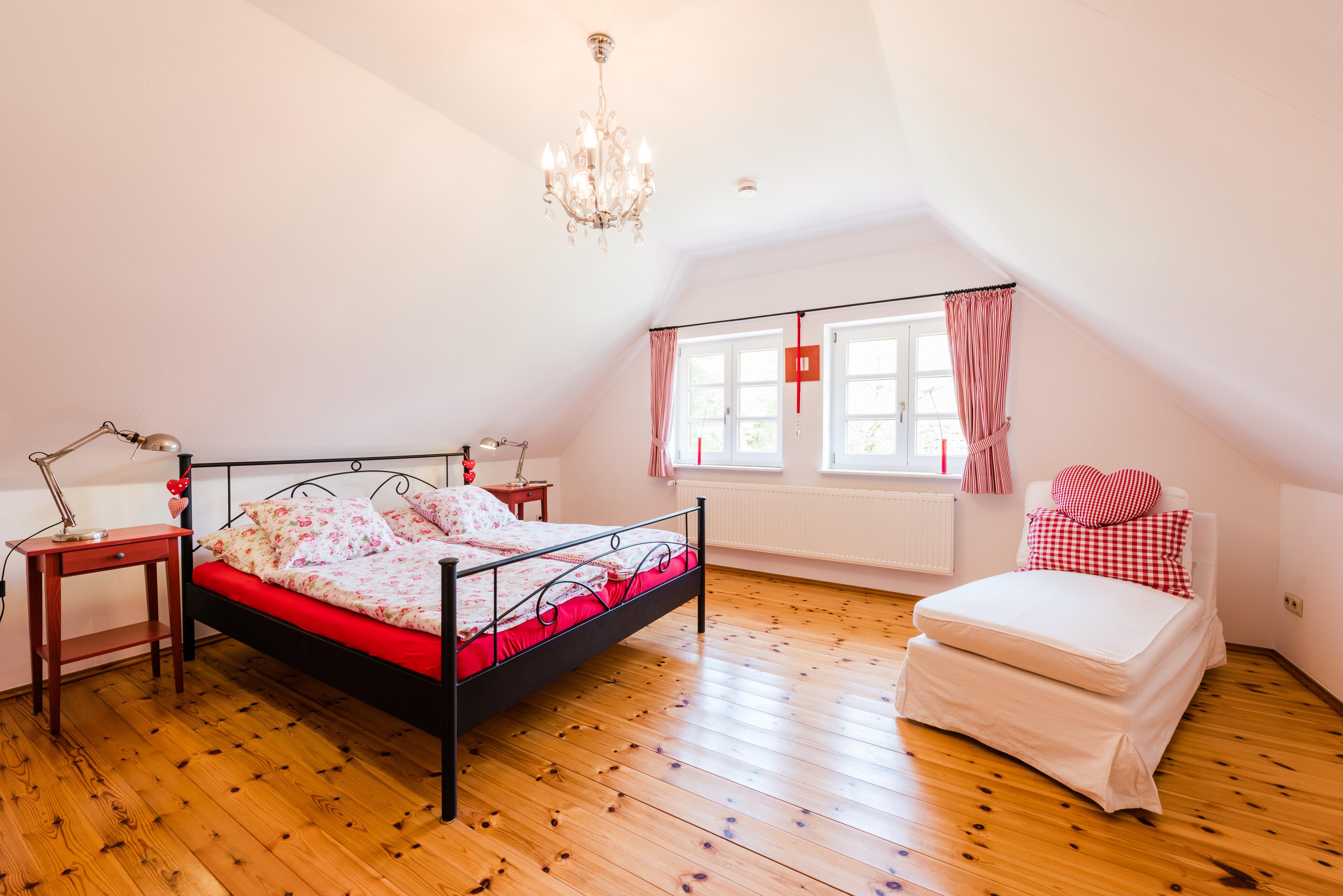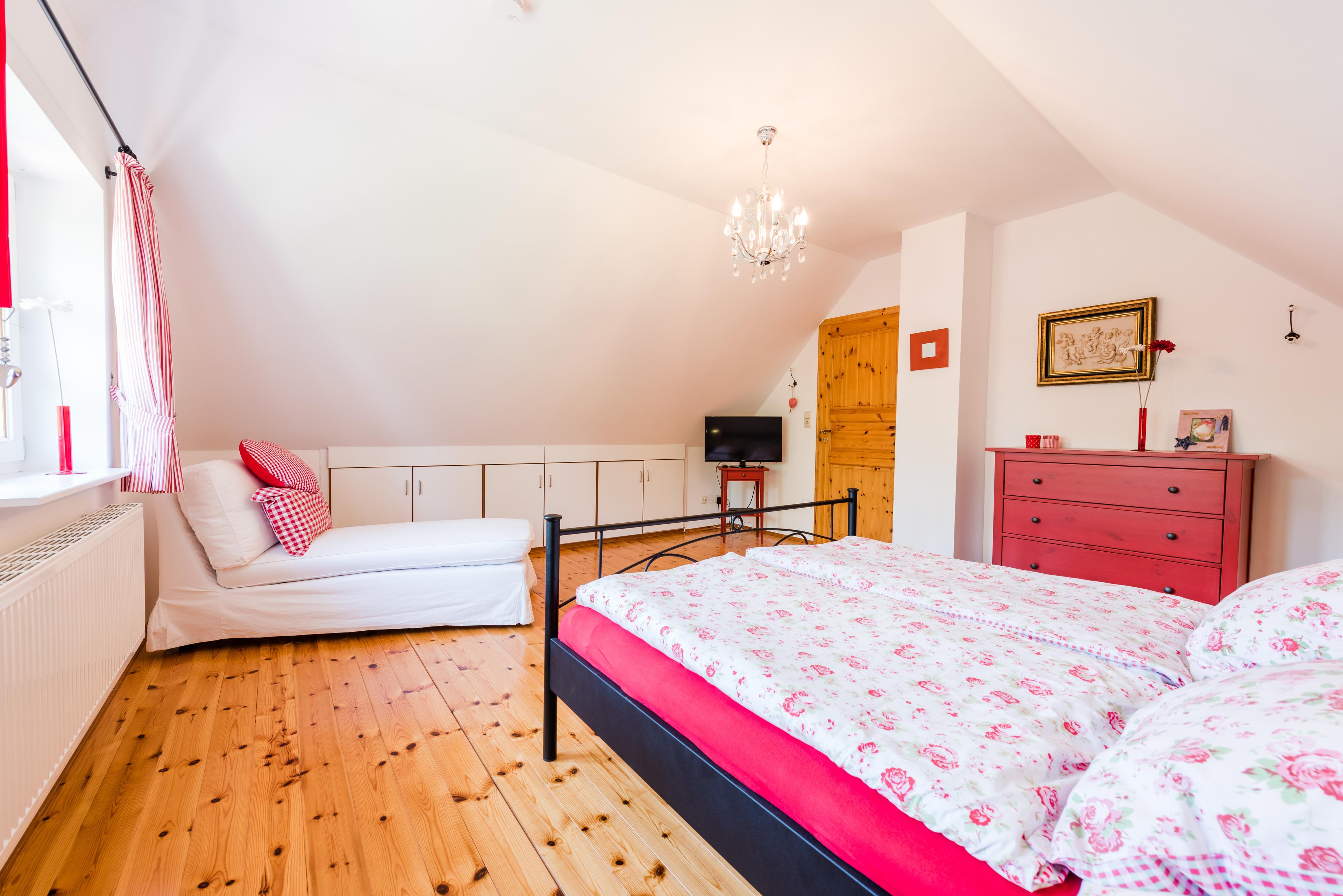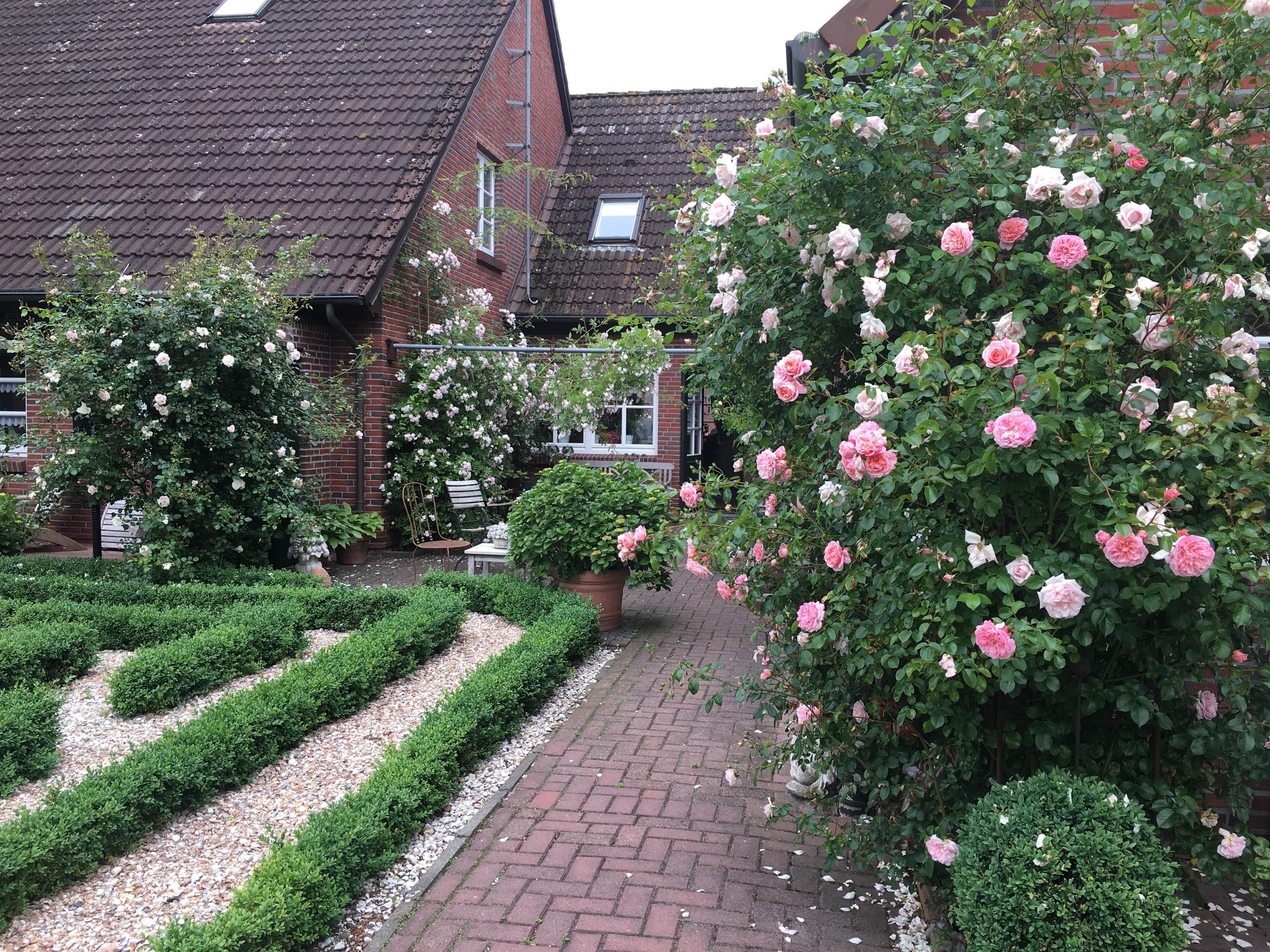 Eine Ferienwohnung wie ein Ferienhaus: geräumig, mit Büro, eigene Terrasse (40 qm), vor einem großen Garten (2000 qm). Design-Element ist die Rose auf 2 Etagen.