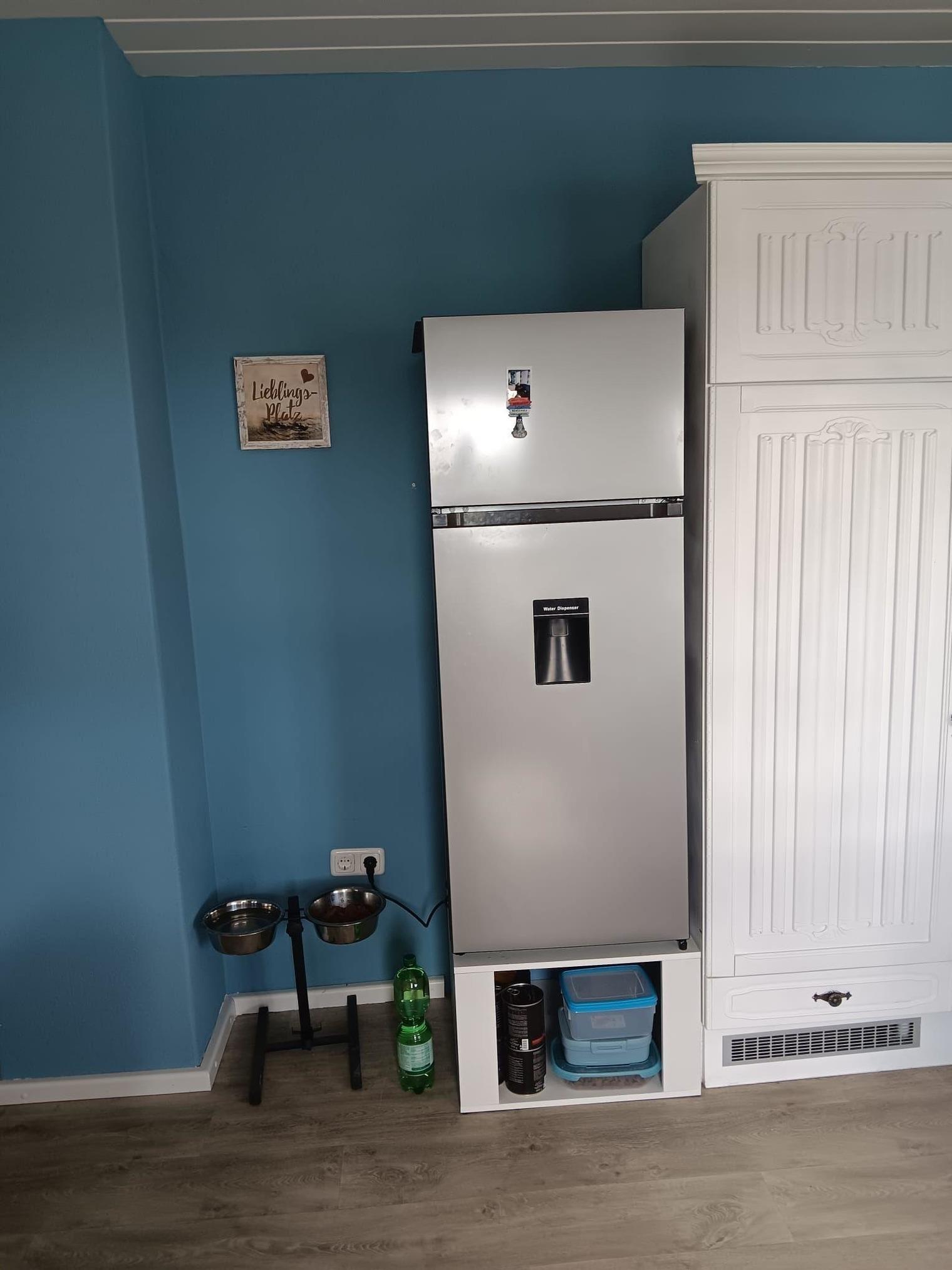 Küche : Essbereich mit Tisch, 6 Stühlen und einem Kinderhochstuhl, Geschirr, Spülmaschine, Herd, Backofen, Toaster, Kühl-Gefrierkombination, Mikrowelle, Wasserkocher, Kaffeemaschine, Waffeleisen, Sandwichmaker, Monsieur Cuisine, 2 höhenverstellbare Hundenäpfe