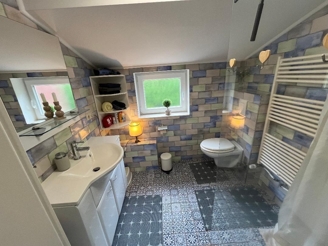 Das Bad im EG ist gefliest und mit einem Waschtisch, WC & Duschkabine mit Glastrennwand eingerichtet.