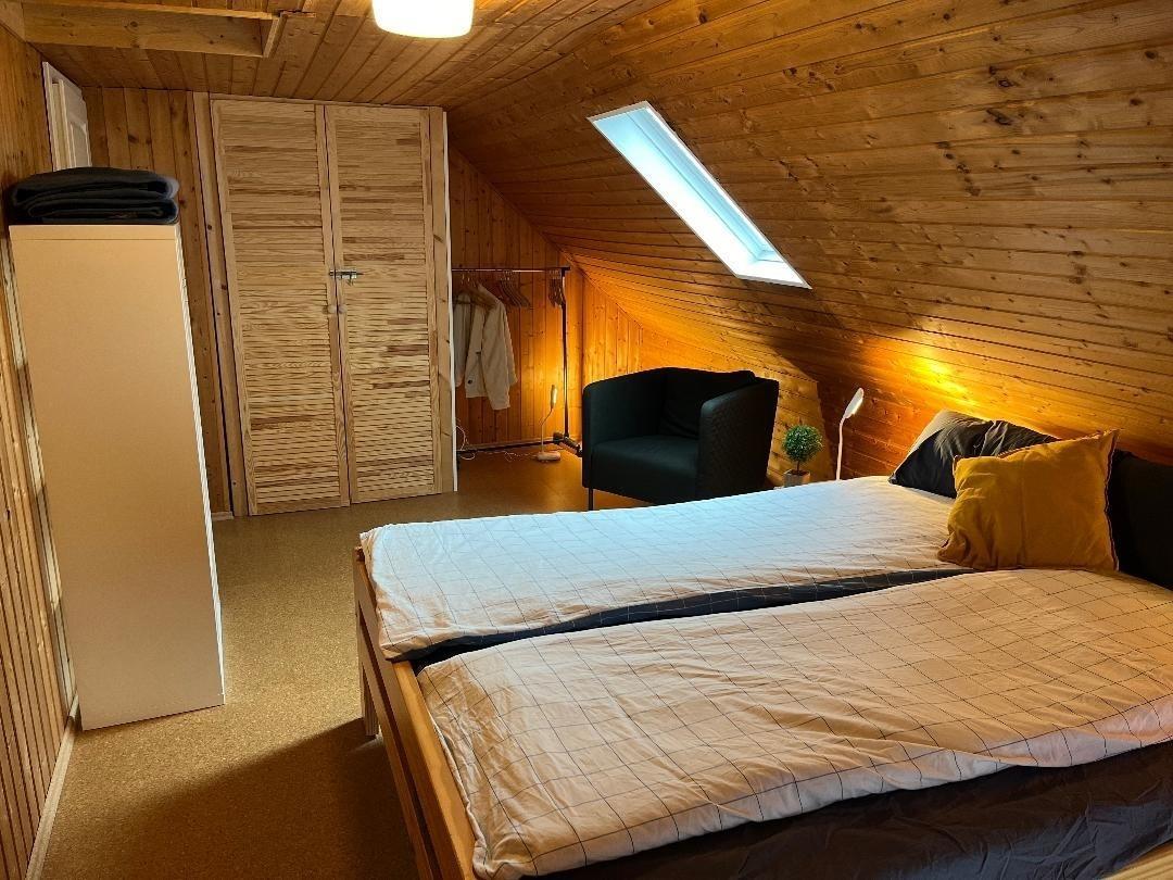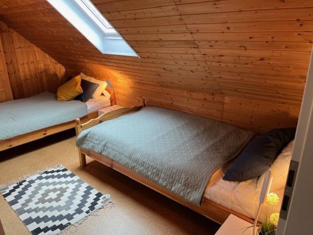 Im OG befinden sich 2 Schlafzimmer. Eines ist mit einem Doppelbett und ein weiteres mit 2 Einzelbetten ausgestattet. Beide Zimmer sind mit Fichtenholz ausgekleidet und mit einen angenehmen Korkfussboden versehen.