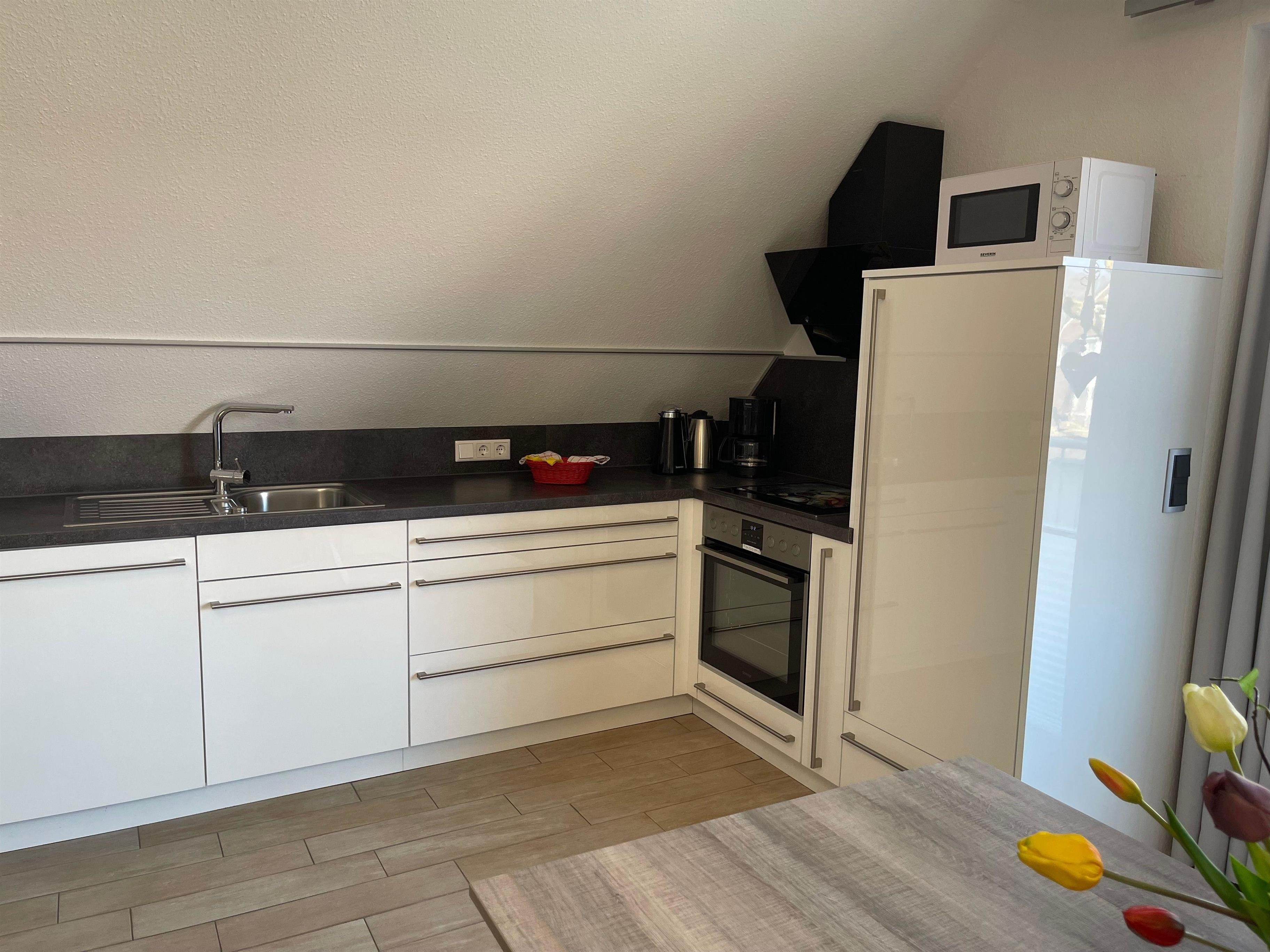 Die Ferienwohnung ist mit einer voll ausgestatteten Einbauküche, das heißt :Eß und Kaffeeservice sowie genügend Besteck, einer Kaffeemaschine, Spülmaschine , Toaster, Wasserkocher, Handmixer, und viele Kleinteile eingerichtet.Am Esstisch haben 6 Personen und ein Kleinkind Platz.