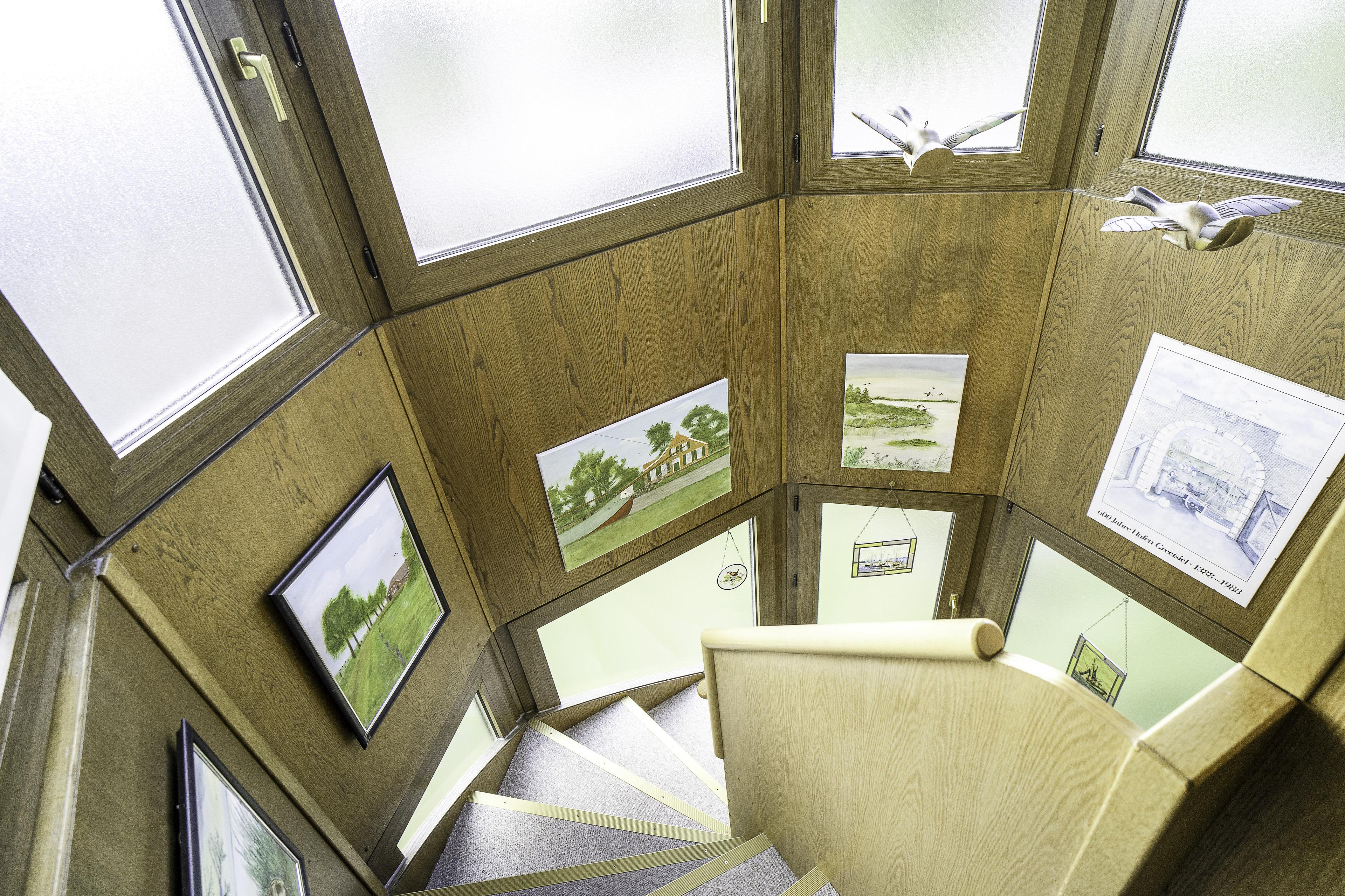 Das Haus relativ liegt nah am Zentrum des sehr malerischen Ortskerns. Alles ist fußläufig zu erreichen. Dabei ist die Lage des Ferienhauses ausgesprochen ruhig. Der eigene Parkplatz liegt direkt am Haus. Das Ferienhaus mit Küche, Bad und drei Zimmern, davon zwei Schlafzimmer, verfügt zudem über eine Terrasse und zwei Abstellräume. Das ehemalige, innenliegende Treppenhaus wurde durch einen Treppenhausanbau ersetzt und die Fläche den Wohnräumen zugeteilt. Somit vergrößerte sich im Erdgeschoss das Ess-/ Wohnzimmer und im Obergeschoss wurden zwei übereinanderliegende Kojen mit vollwertigen Betten eingebaut. Über dem Sofa und im Treppenhausturm hängen ein maritimes Werk und traditionelle Landschaftsbilder eines Emder Künstlers. Insbesondere das Wohn- und Esszimmer wurde im friesischen Stil eingerichtet.