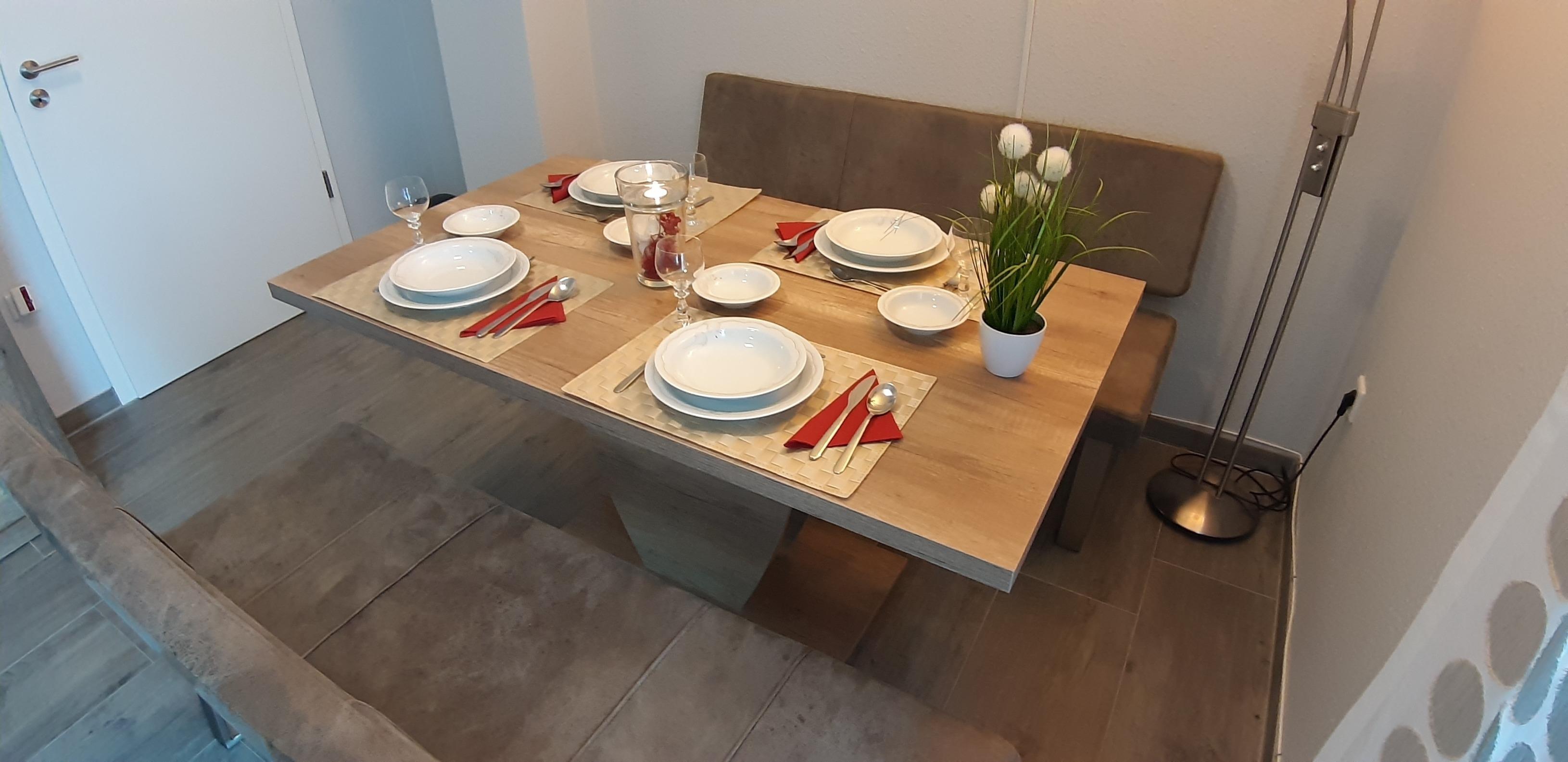 Die Küche ist mit einem Backofen, einer Mikrowelle, einem Geschirrschüler, einem Kühlschrank m. Gefrierfach, einer Kaffeemaschine, einer Senseo-Padmaschine und genügend Geschirr komplett ausgestattet.