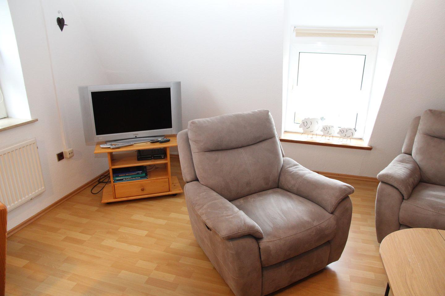 Die Obergeschosswohnung "Bentje" bietet auf großzügigen 60qm Platz für bis zu 3-4 Personen. In dieser Wohnung landen Sie direkt im großzügigen Wohn- und Essbereich mit Sofa, zwei Sesseln und Fernseher. Direkt angrenzend in der Küchenzeile mit Essbereich finden Sie Cerankochfeld, Backofen, Kühlschrank, Wasserkocher, Toaster, Kaffeemaschine, Senseo-Padmaschine und Spülbecken. Bitte beachten Sie, dass keine Spülmaschine und auch kein Gefrierfach vorhanden sind. Das modernisierte Badezimmer verfügt über eine Dusche mit niedrigem Einstieg, Waschbecken und WC. In einem der Schlafzimmer finden Sie ein Doppelbett und einen großen Kleiderschrank, in dem anderen ist ein Etagenbett (eher nur für Kinder geeignet) vorhanden.