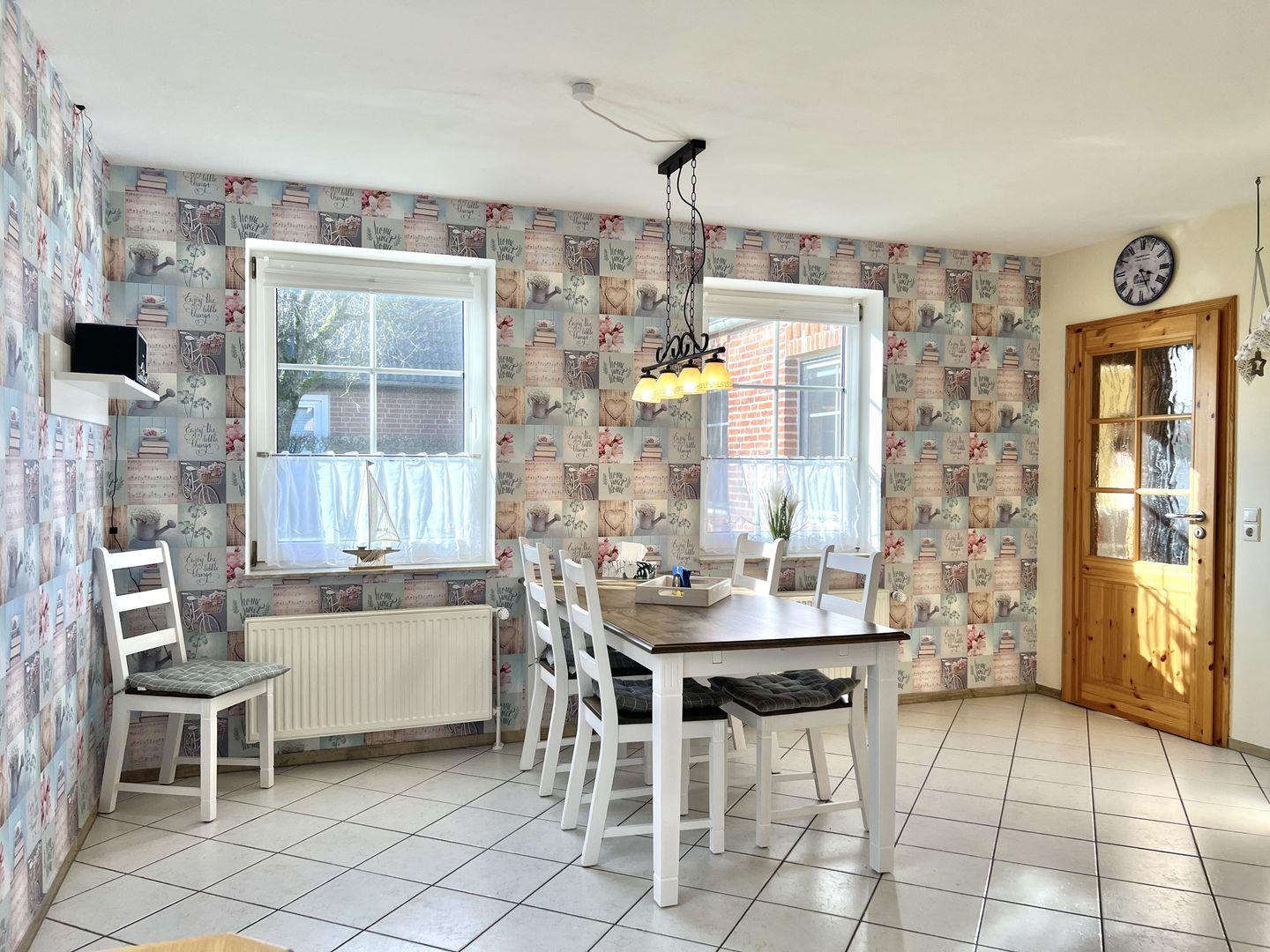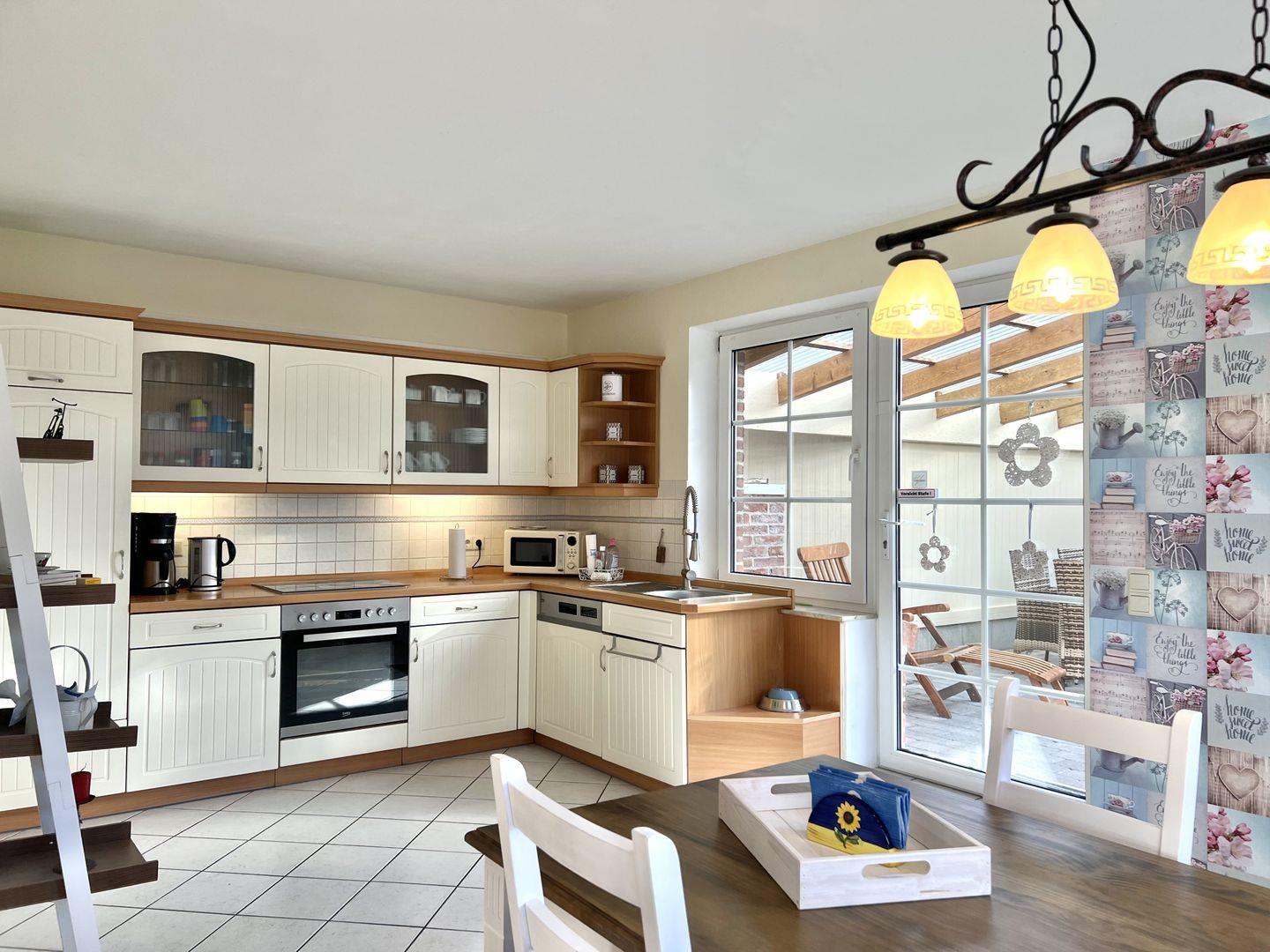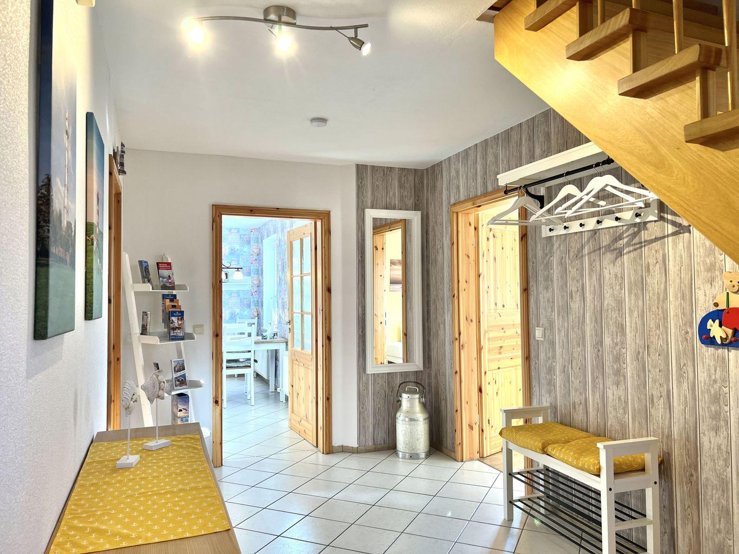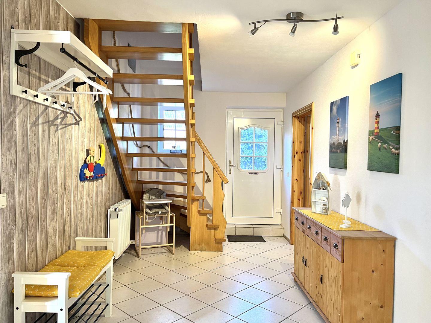 Kommen Sie herein! Vom Flur gelangen Sie in das 1. Schlafzimmer mit Boxspringbett (Matratzengröße 1,80 x 2 m, großes Laken erforderlich). Hier verbringen Sie erholsame Nächte. Nebenan befindet sich das Badezimmer mit begehbarer Dusche. Im hellen Wohnzimmer können Sie auf der großen Couch relaxen und kuschelige Abende verbringen. Das Herzstück ist die Küche mit dem Essbereich. Die Landhausküche bietet alles, was der Hobbykoch benötigt, um ostfriesische Gerichte zu kochen und am großen Esstisch zu servieren. Der Essbereich lädt außerdem zum klönen, Tee trinken und zu Spieleabende ein. Von der Küche erreichen Sie die überdachte Terrasse. Genießen Sie die Ruhe und den Blick in den Garten. Lassen Sie hier die Seele baumeln. Der Garten ist teilweise komplett eingezäunt. Die Treppe rauf bietet eine kleine Leseecke Platz zum Schmökern. Hier finden Sie 2 weitere Schlafräume, die sehr schön ausgestattet sind. Im ersten Schlafzimmer steht ein Bett der Größe 1,40 x 2 m (großes Laken erforderlich), im zweiten befindet sich ein 1,80 x 2 m Bett (Matratzengröße 0,90 x 2 m). Ein Bad mit Eckbadewanne und Brause komplettiert die obere Etage. In jedem Raum finden Sie eine individuell tapezierte Wand, die das Haus einzigartig macht. WLAN ist verfügbar. Eine Garage und ein PKW-Stellplatz sind ebenfalls vorhanden. An einer Wallbox können Ihre E-Autos gegen Gebühr geladen werden. Nebenan gibt es noch einen Raum zum Abstellen Ihrer mitgebrachten Fahrräder. E-Bikes können dort ebenfalls am Strom angeschlossen werden.