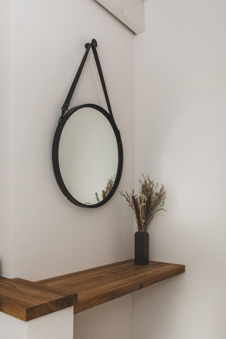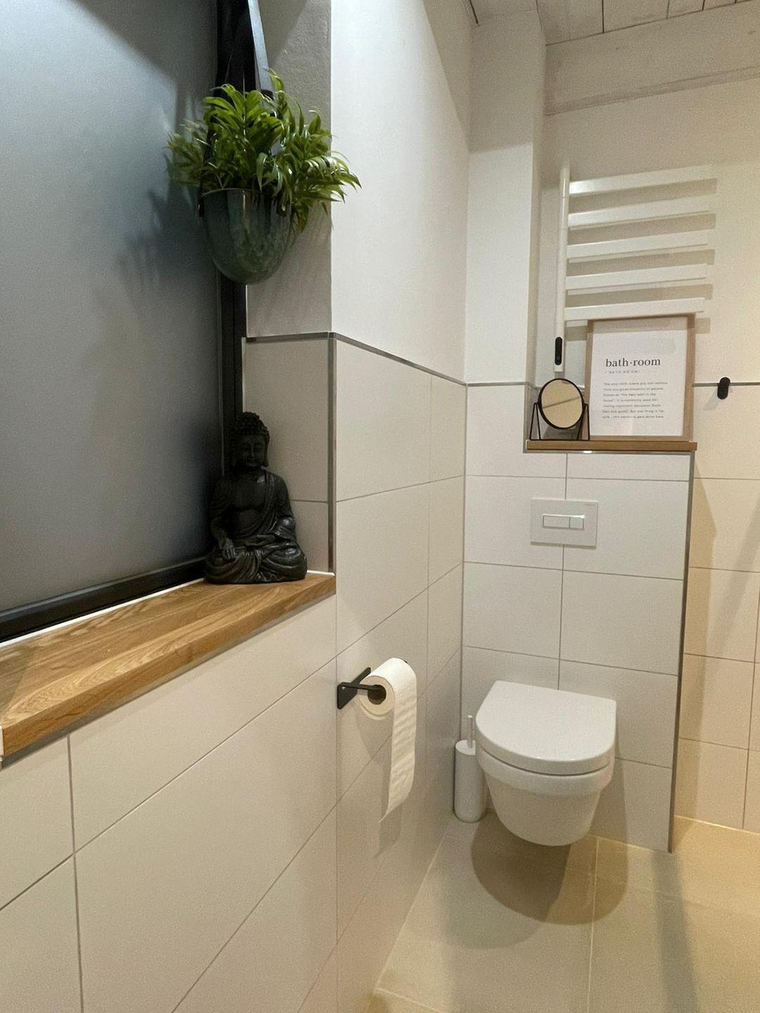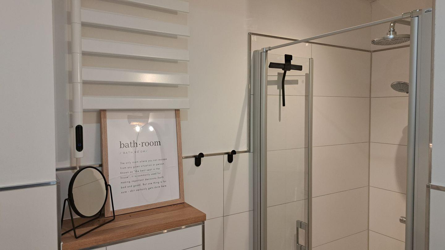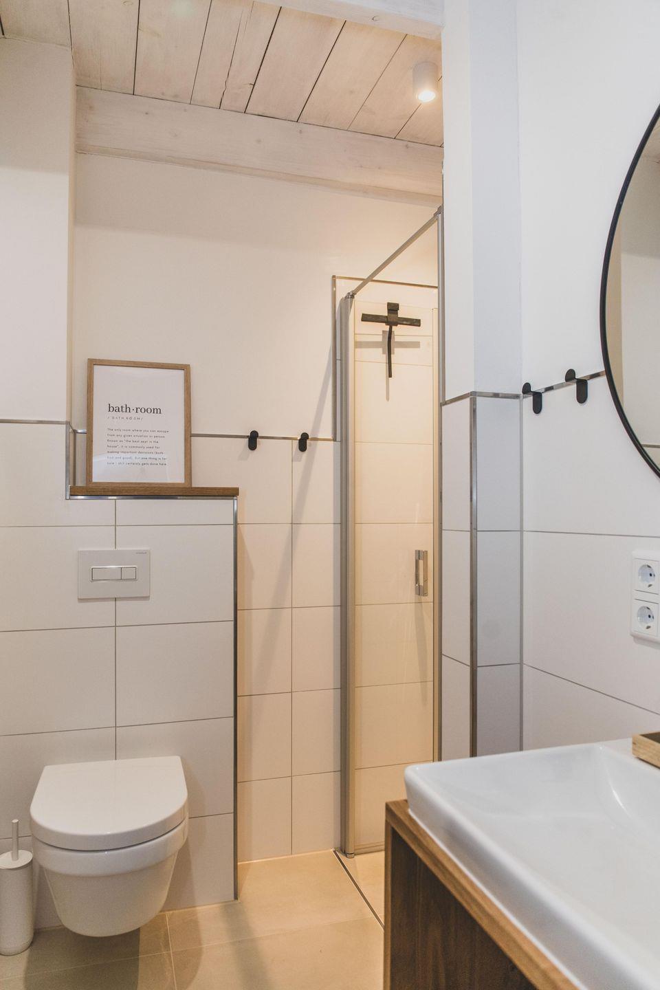 Außerdem befindet sich im OG natürlich noch das Badezimmer mit bodentiefer Dusche. Sowohl das Badezimmer als auch der Flur bieten genug Ablagefläche in Form von wunderschön geschreinerten Maßanfertigungen. Damit es im Badezimmer keinen Stau gibt, findet man im Flur und im Schlafzimmer auch noch praktische Spiegel mit Ablagen.