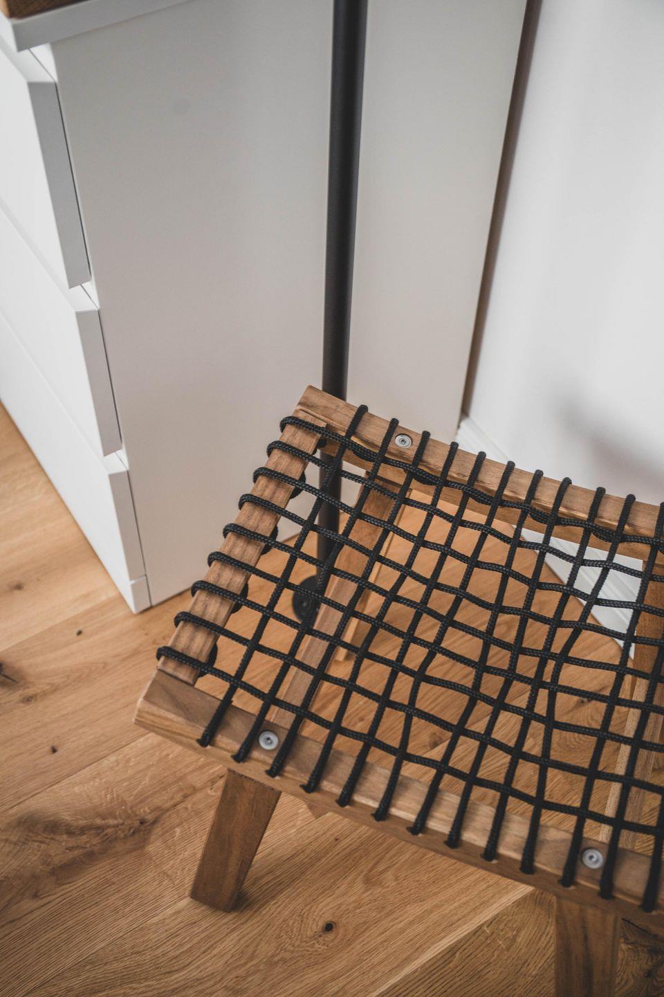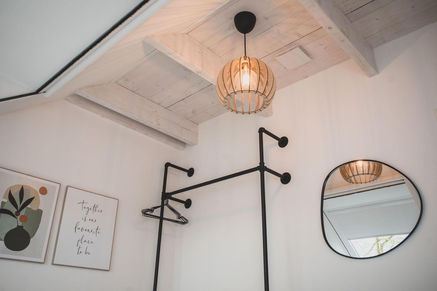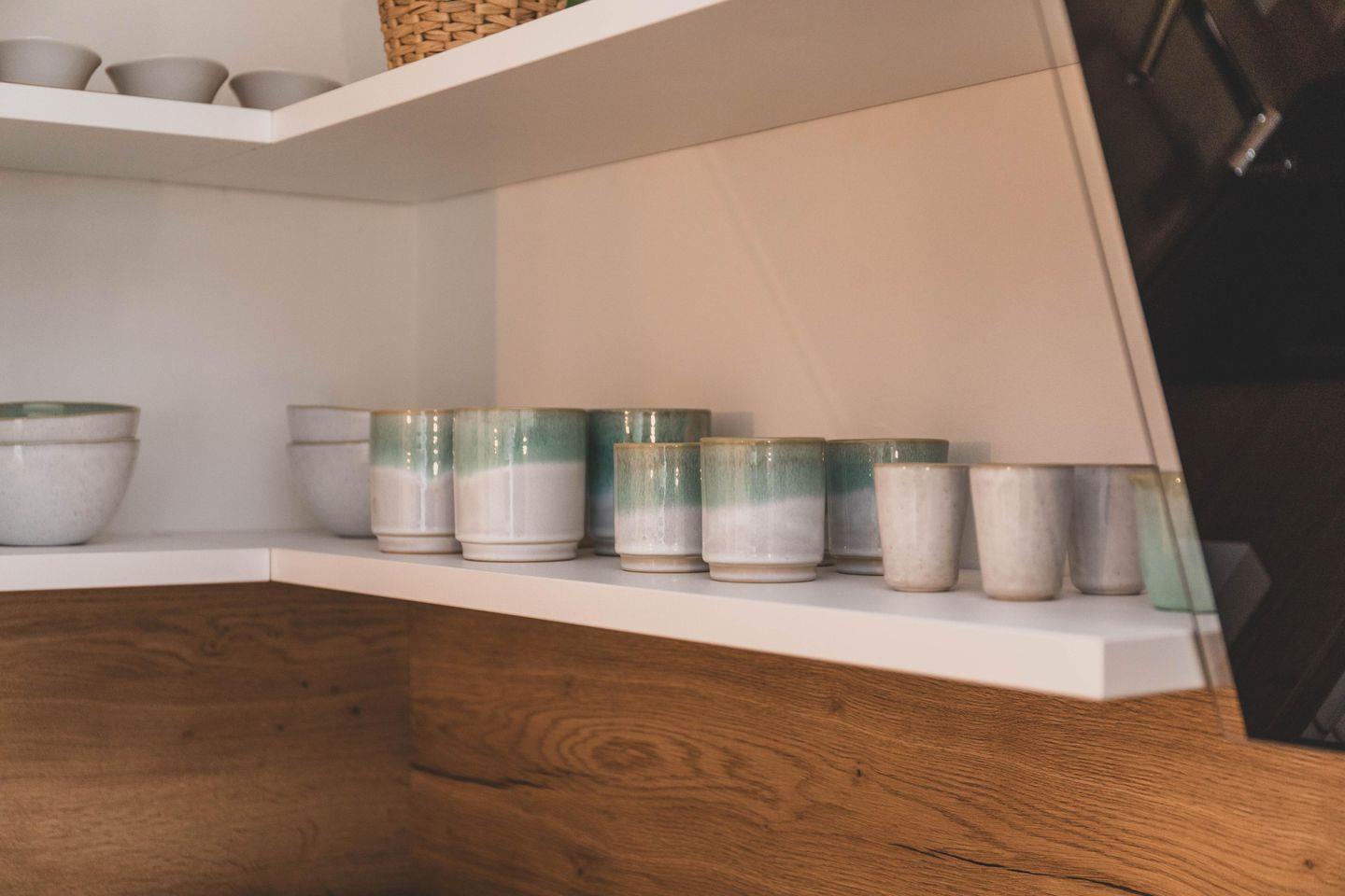 Außerdem befindet sich im OG natürlich noch das Badezimmer mit bodentiefer Dusche. Sowohl das Badezimmer als auch der Flur bieten genug Ablagefläche in Form von wunderschön geschreinerten Maßanfertigungen. Damit es im Badezimmer keinen Stau gibt, findet man im Flur und im Schlafzimmer auch noch praktische Spiegel mit Ablagen.