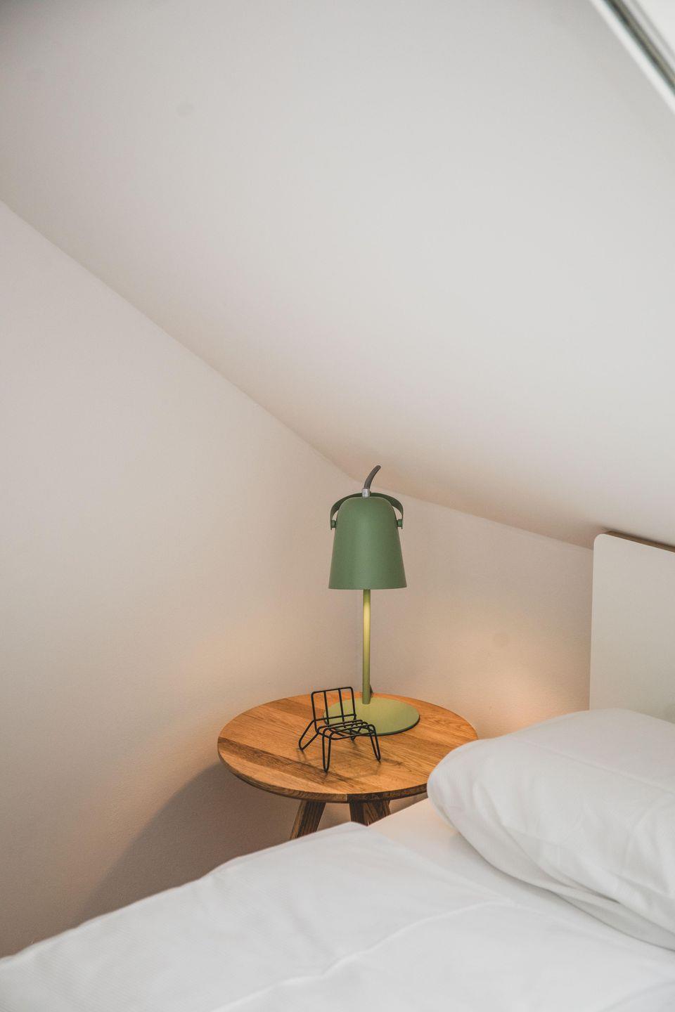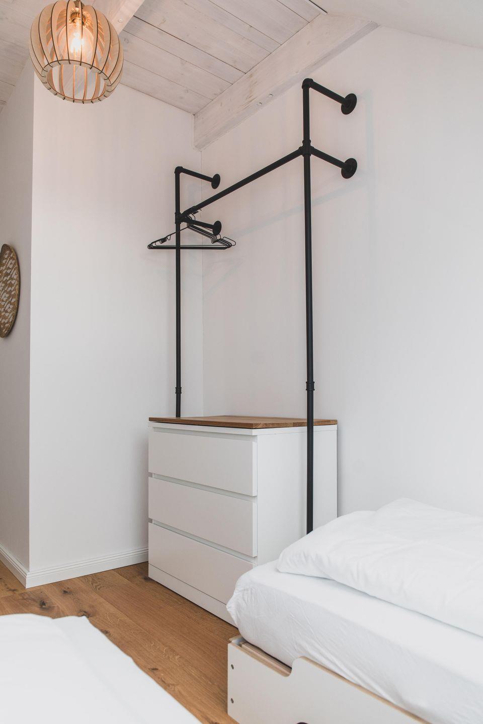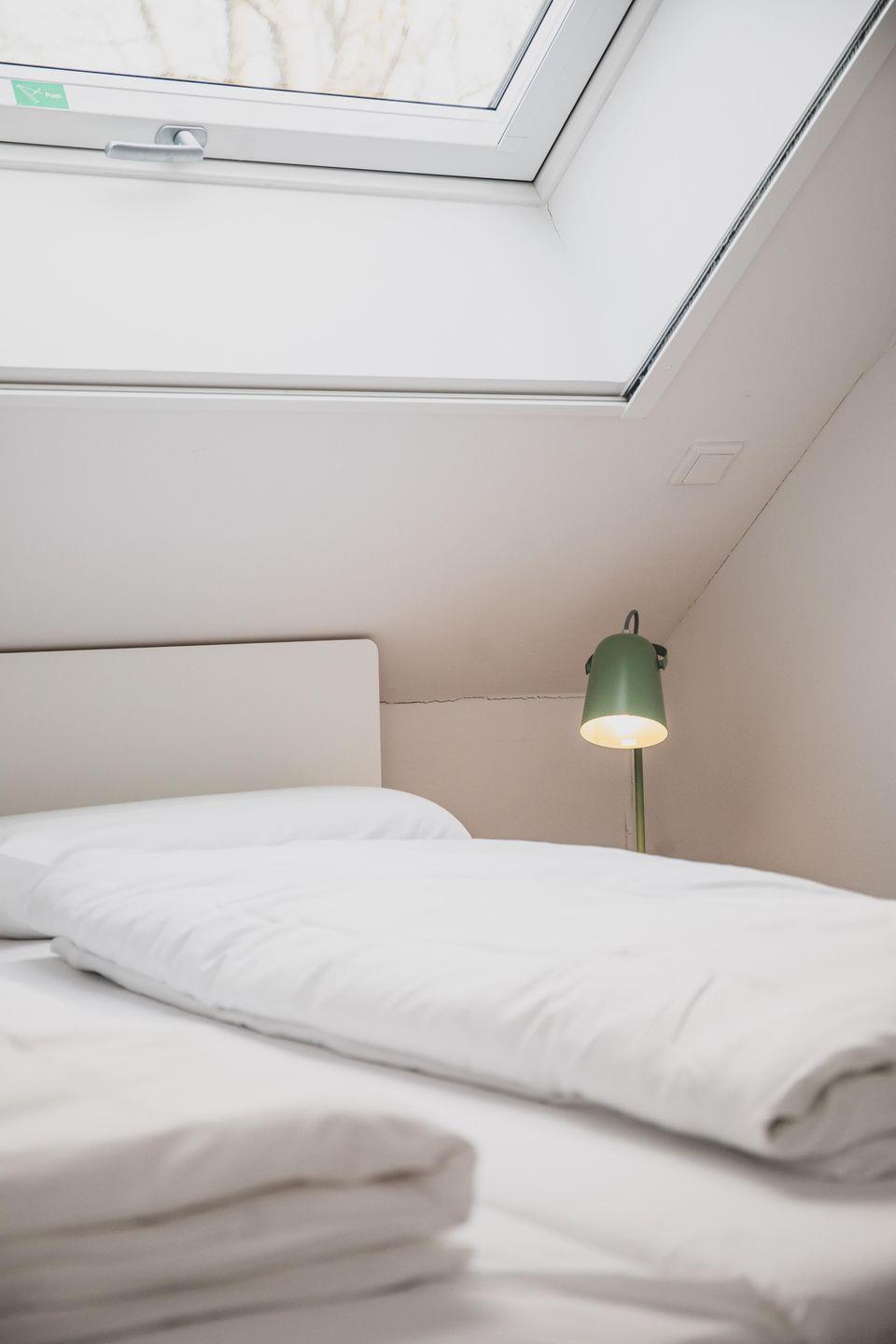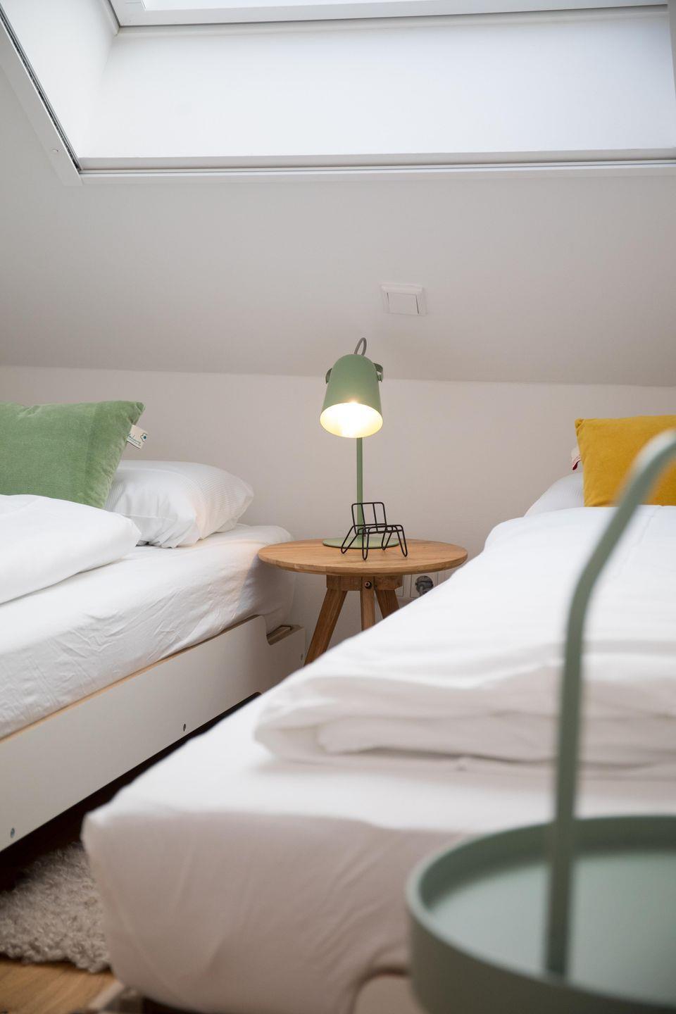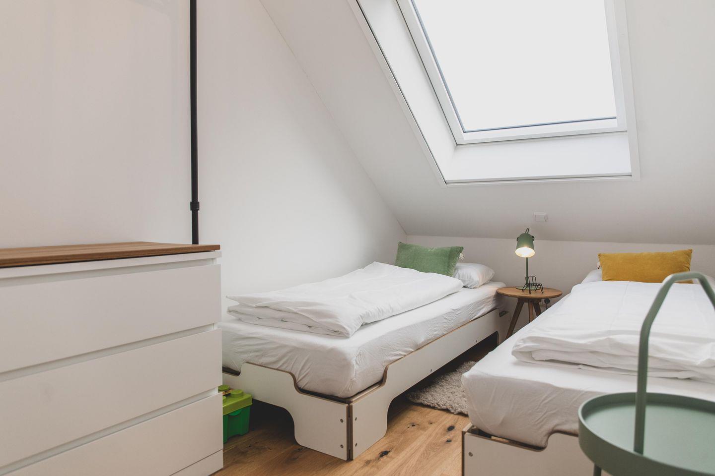 Im Obergeschoß verfügt die Wohnung über zwei gemütliche Schlafzimmer – einmal mit Doppelbett und einmal mit zwei separaten Betten. Je nach Bedarf können diese aber nebeneinandergestellt werden. Beide Schlafzimmer bieten selbstverständlich genug Platz für die Garderobe. Unter den gemütlichen Schrägen kann man entspannt träumen und Kraft für den nächsten Tag tanken. Damit man dabei nicht gestört wird, verfügen die Dachfenster über einen Insektenschutz und Verdunklungsmöglichkeiten.