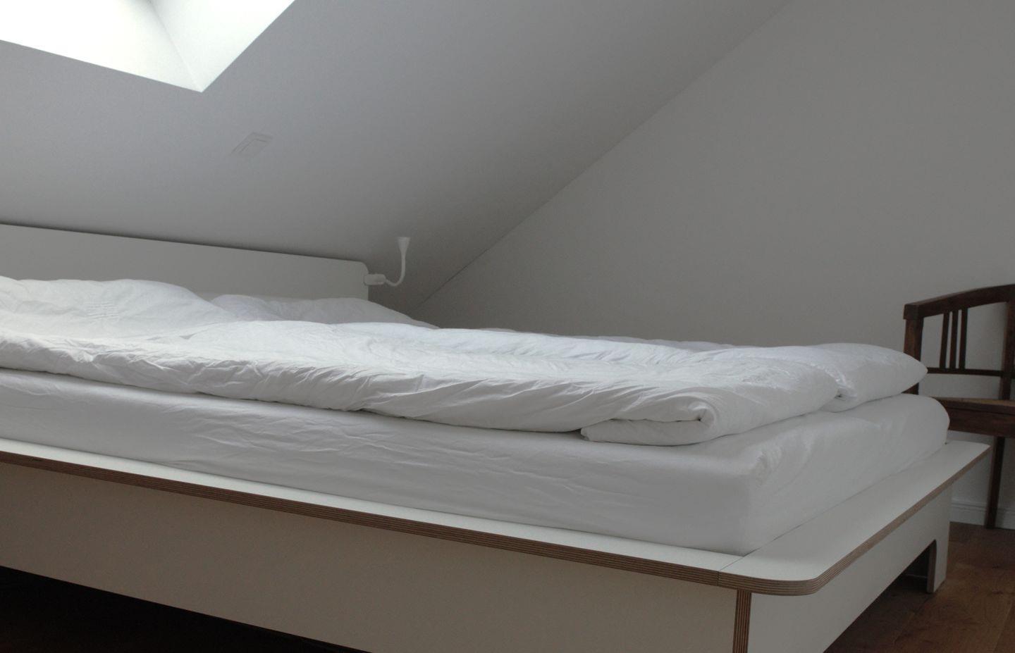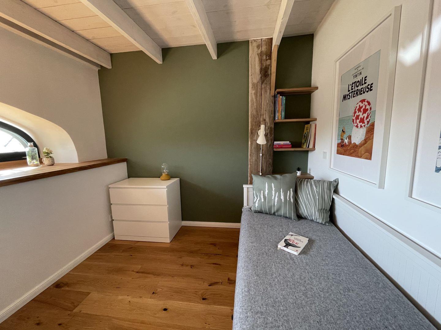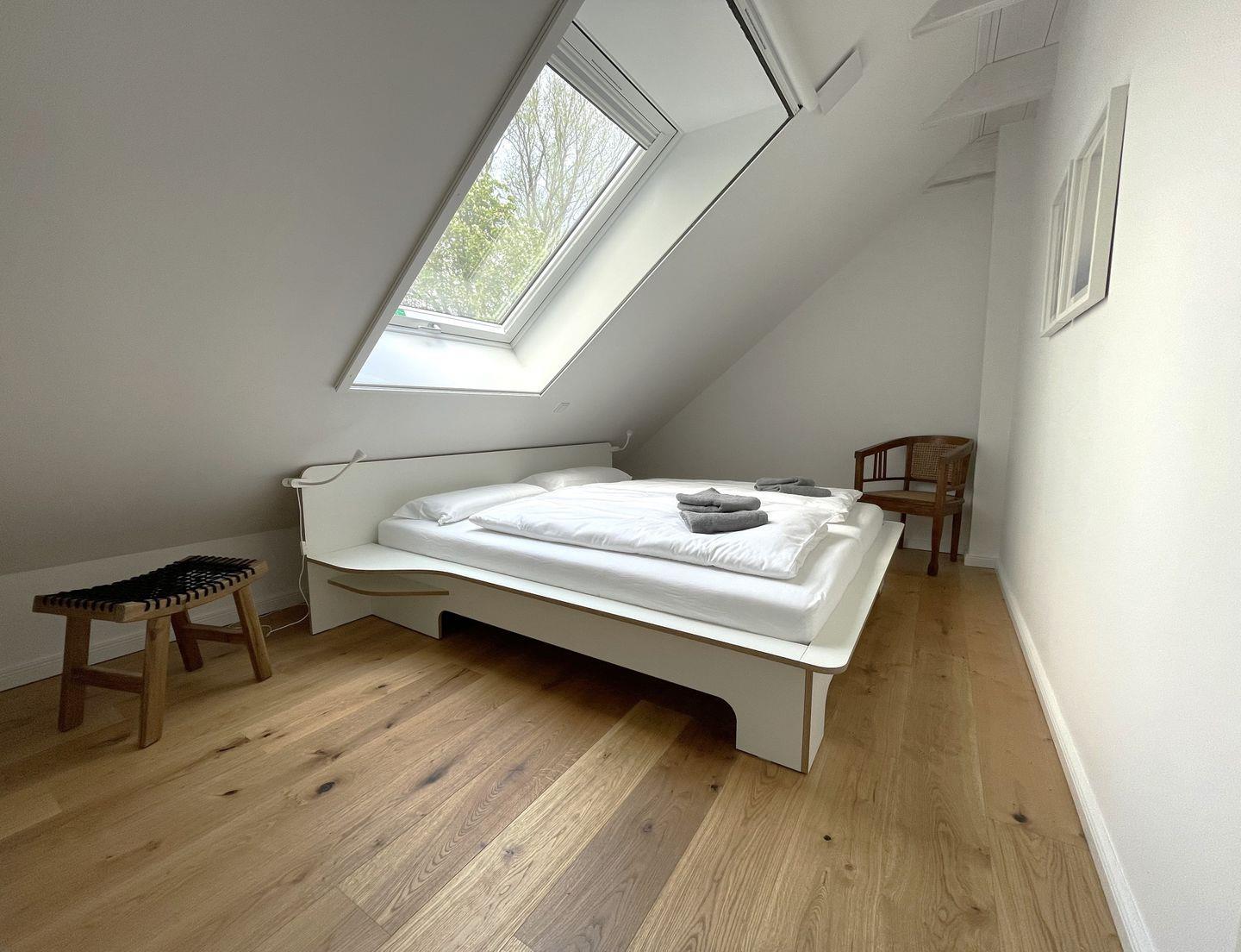 Das Obergeschoss verfügt über zwei geschmackvoll eingerichtete Schlafzimmer, 1x mit Doppelbett (200x180cm), 1x wahlweise mit Einzel-(200x80cm) oder Doppelbett (200x160cm). Das nach Osten ausgerichtete Schlafzimmer verfügt zudem über einen separaten Schreibtisch als Arbeitsplatz. Auch der hier vorhandene Ausblick aus dem historischen runden Fenster oberhalb des alten Scheuneneingangs gibt der Wohnung eine ganz besondere, individuelle Note. Ebenfalls im Obergeschoss befindet sich ein weiteres modernes und geräumiges Bad, ausgestattet mit bodentiefer Regendusche, WC und einer Handtuchheizung.
