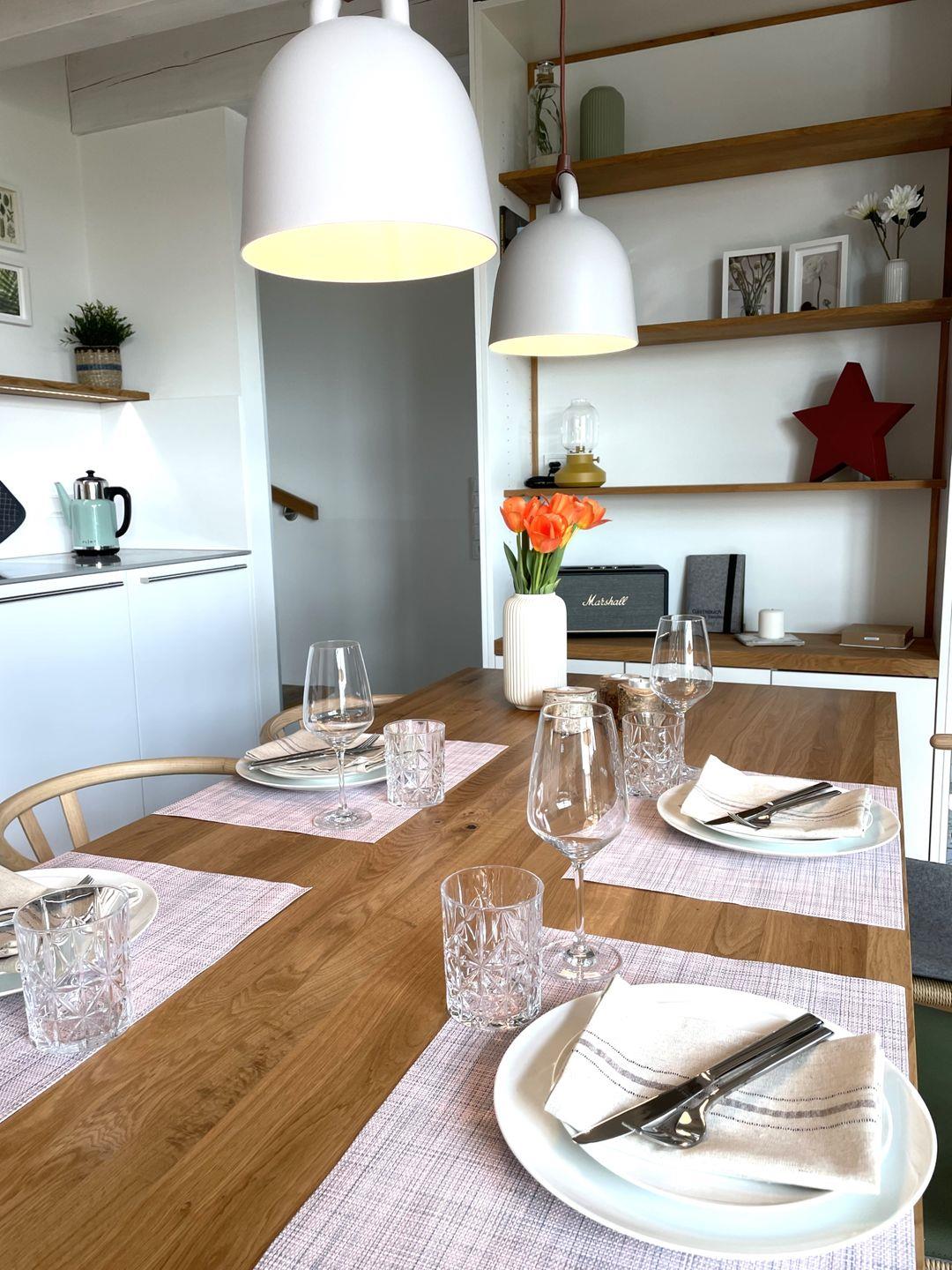 Im Erdgeschoss besitzt die charmante Ferienwohnung einen großzügigen, harmonisch eingerichteten Wohn- und Essbereich mit individuellen Einbauten, die auf das liebevolle Gesamtkonzept abgestimmt sind. Wir legen großen Wert darauf, dass Ihr Euch in unserem „gemeinsamen Zuhause“ genauso wohlfühlt wie wir als Eigentümer. Daher ist die Ausstattung bis in die Details vielfältig und hochwertig. Neben den üblichen technischen Gerätschaften stehen Euch eine Vielzahl an neuwertigen Büchern bzw. Reiseführern sowie Gesellschaftsspiele zur Verfügung. Der großzügig und mit allen Annehmlichkeiten ausgestattete offene Küchenbereich ist in den gemütlichen Wohnbereich integriert. Ein großer Esstisch für 6 bis 8 Personen lädt zum gemeinsamen Essen in geselliger Runde ein. Zudem sind im Erdgeschoss ein modernes Badezimmer (mit ebenerdiger Regendusche) und ein Abstellraum vorhanden.
