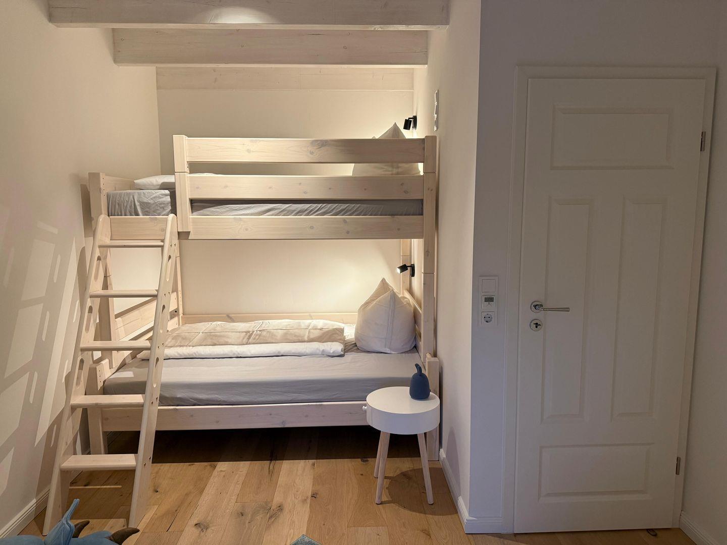 Eines davon mit einem Doppelbett (180x200) einem großen Kleiderschrank und einem Schreibtisch, welcher zum mobilen arbeiten einlädt, ein weiteres als Kinderzimmer gestaltet, mit einem großen Doppelstockbett (untere Etage 140x190/ obere Etage 120x190) sowie ein gemütliches Klappsofa mit umklappbarer Rücklehne (140x190), das sich mit wenigen Handgriffen in ein Doppelbett verwandeln lässt. In diesem Raum befindet sich ebenfalls ein Kleiderschrank und allerlei Dinge, die Kinderaugen strahlen lassen.