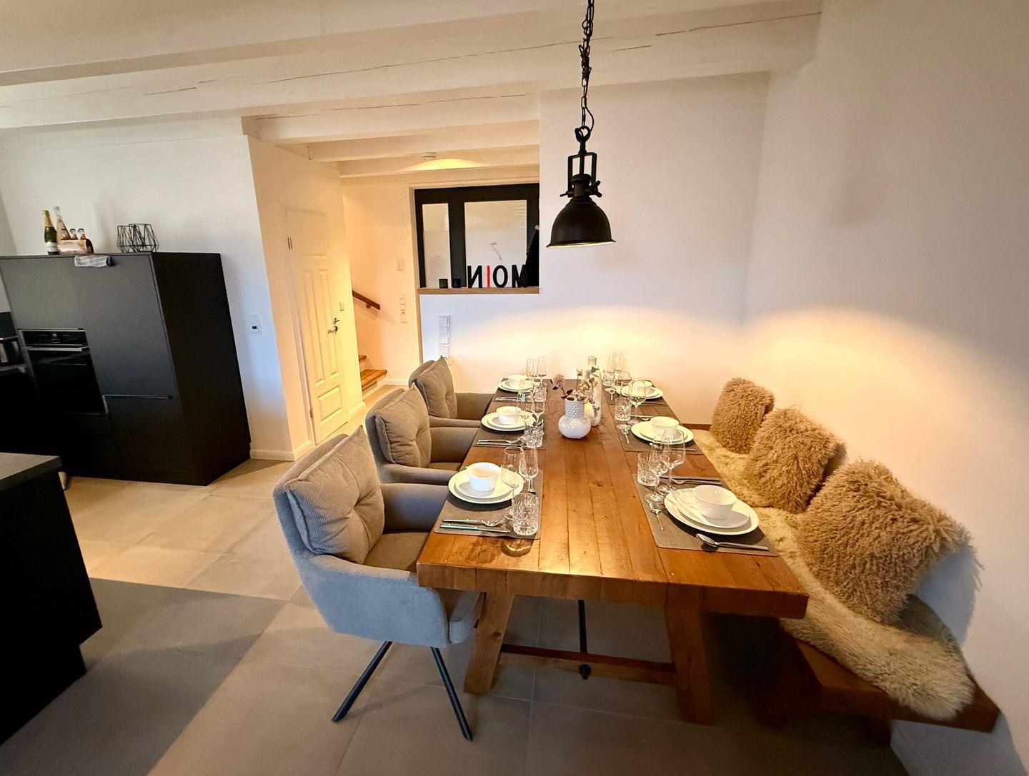 Die Wohnung erstreckt sich über 2 Ebenen. Im offen gestalteten Erdgeschoss werden sich Kochliebhaber über eine voll ausgestattete große und moderne U-Küche, einen großen Essbereich mit rustikalem Esstisch und einen gemütlichen Wohnbereich mit einem 50 Zoll Smart-TV, der über alle gewünschten Streaming Dienste verfügt, sowie einer JBL Musikbox, freuen.
