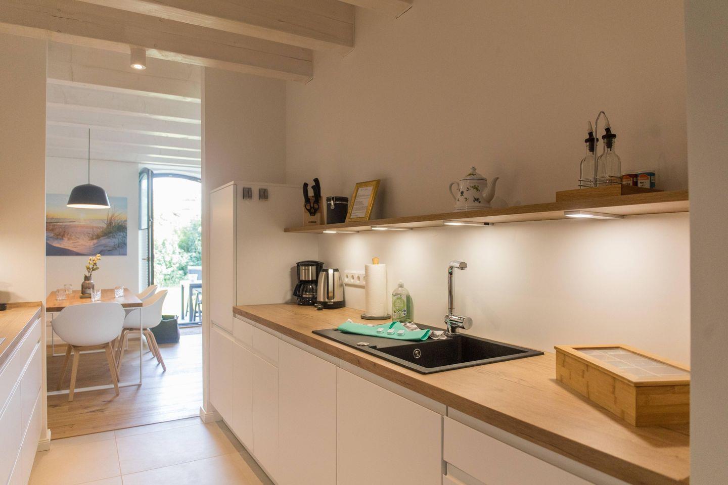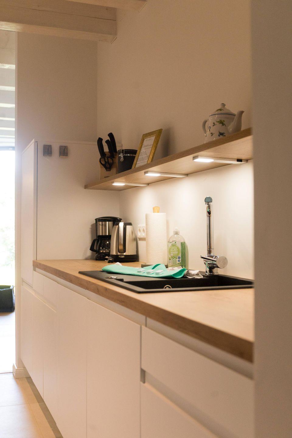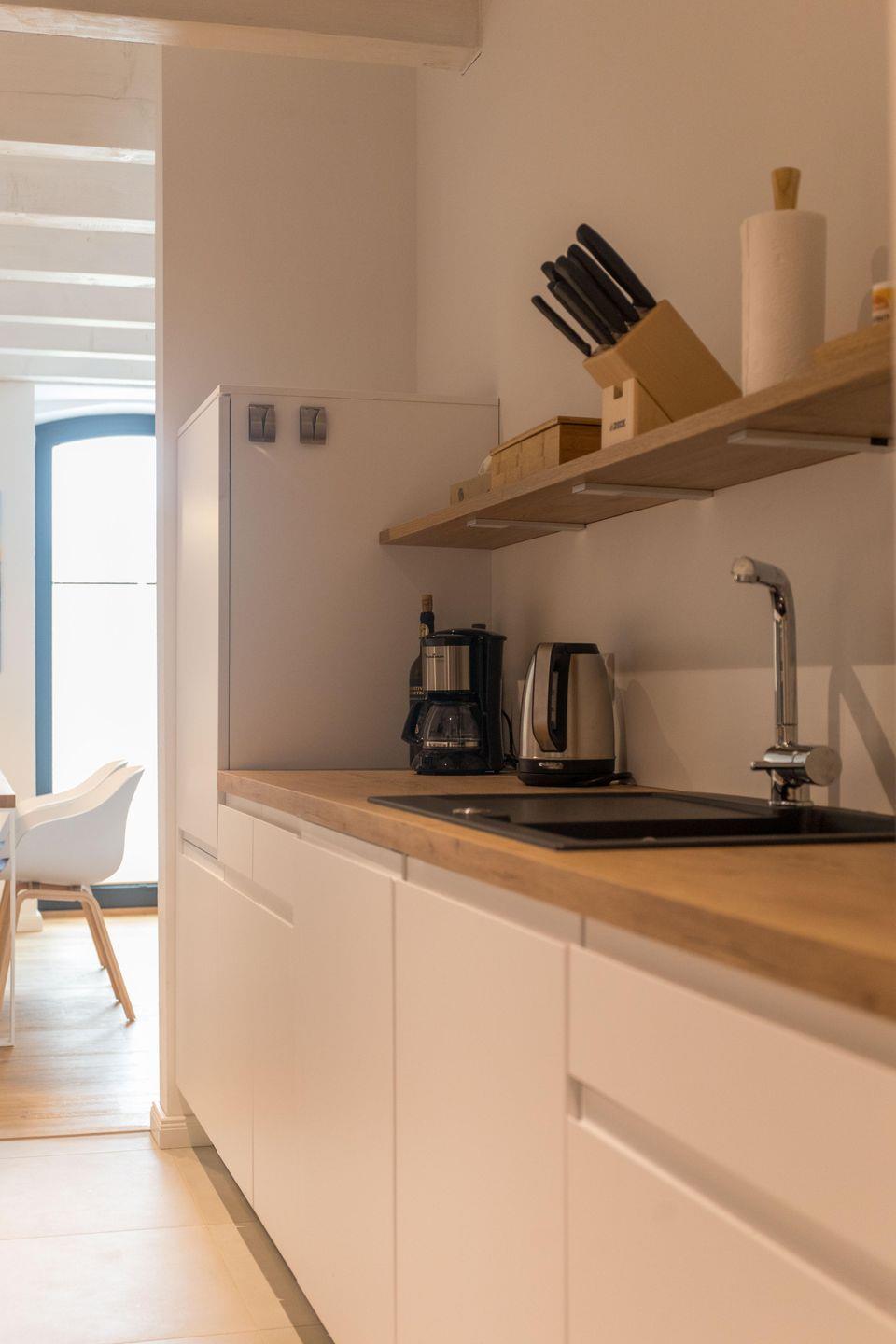 Die Wohnung verfügt über eine gut ausgestattete Küche im Eingangsbereich. Hier stehen Ihnen alle wesentlichen Küchenutensilien zur Verfügung, von der Induktionsherdplatte über eine moderne Espressomaschine bis hin zu einer Heißluftfritteuse.