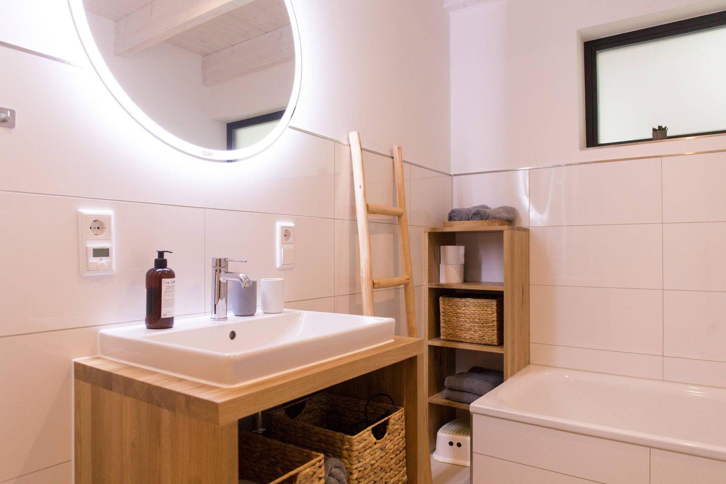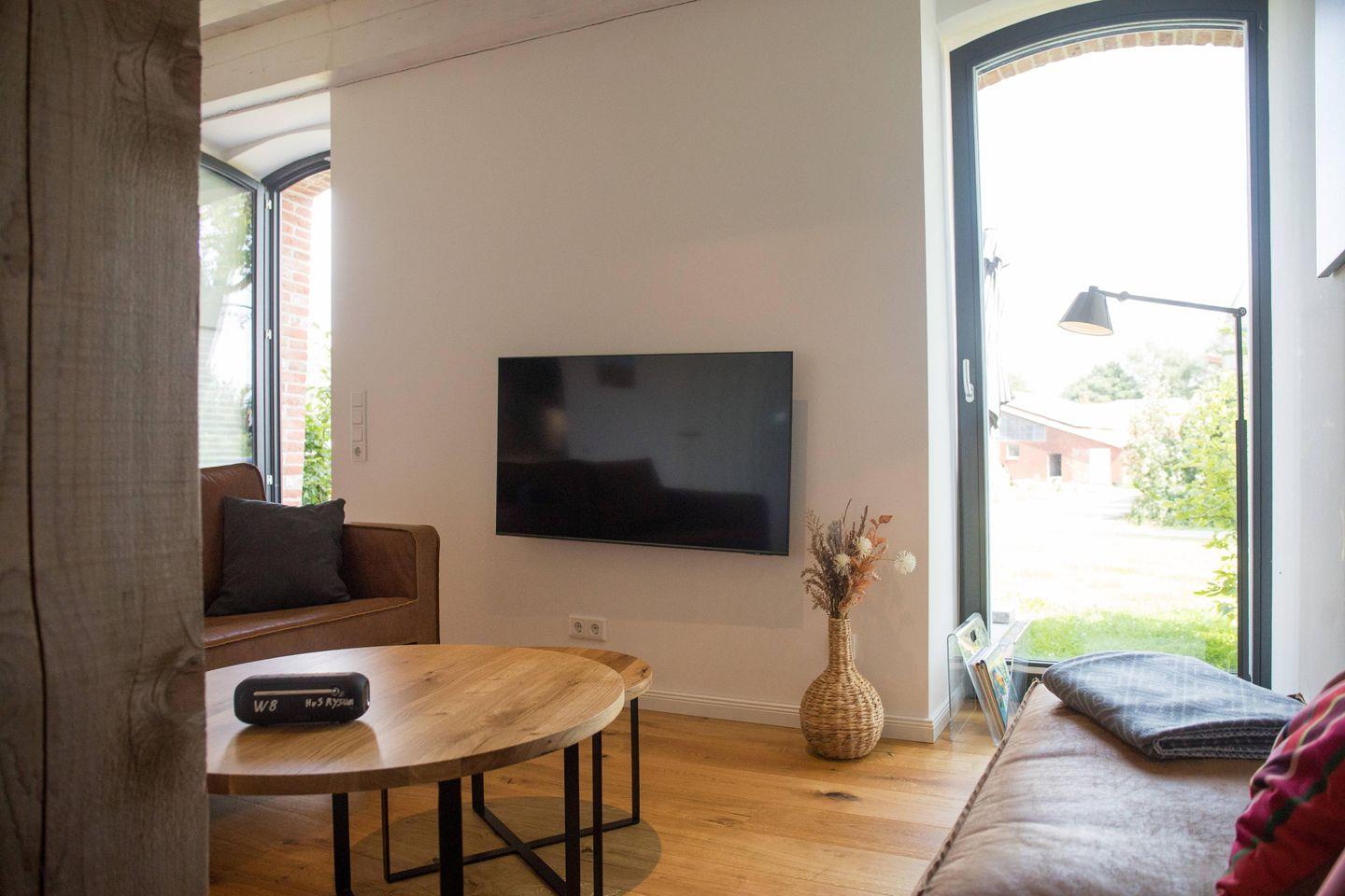 Von der Küche gelangt man in das großzügige Wohn- und Esszimmer. Genießen Sie gemeinsame Mahlzeiten im Essbereich oder entspannen Sie einfach auf dem bequemen Sofa im Wohnzimmer, während Sie den 50 Zoll großen QLED-Fernseher nutzen. Für die kleinen Gäste steht ein Kinderhochstuhl zur Verfügung. Für zusätzlichen Komfort sorgt die Fußbodenheizung, die für eine wohlige Atmosphäre selbst an kühlen Tagen sorgt. Zudem sind im Erdgeschoss ein Gäste-WC und ein Abstellraum vorhanden.