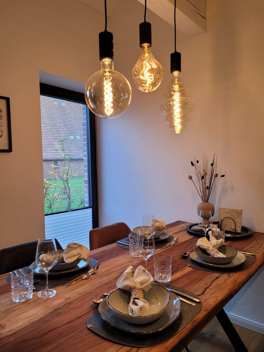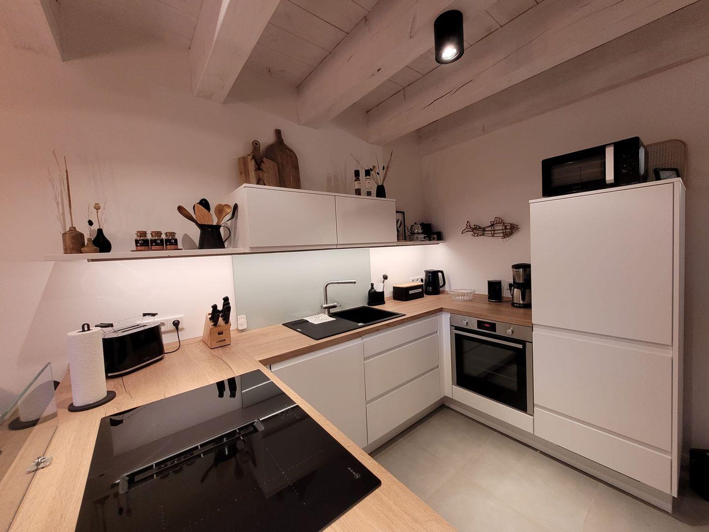Die moderne, umfangreich ausgestattete Küche lädt zum gemeinsamen Kochen ein. Backofen, Toaster, Mikrowelle, ein großer Kühlschrank incl. Gefrierfach und eine Spülmaschine gehören ebenso zur Ausstattung wie ein Induktionskochfeld mit integriertem Dunstabzug.
