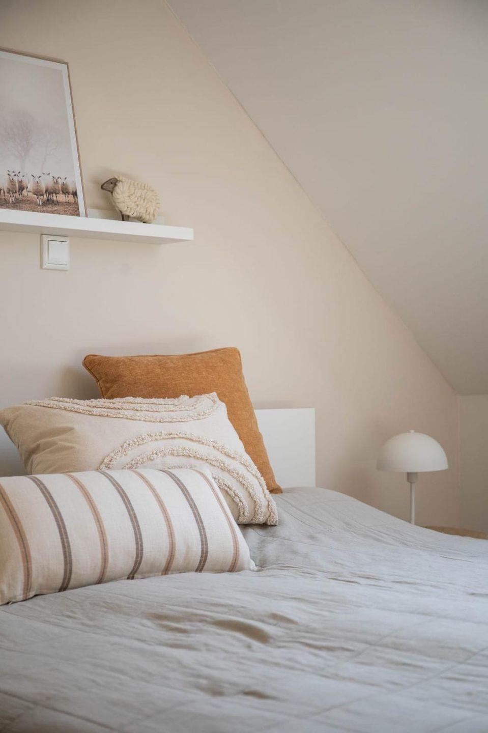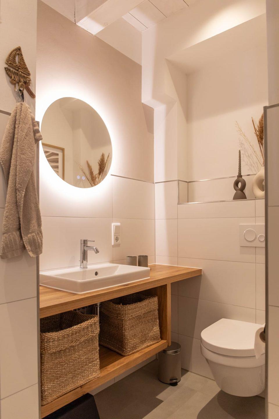 Ein weiteres Bad mit bodentiefer Dusche sowie 2 Schlafzimmer mit großen Dachfenstern (incl. Insektenschutz- und Verdunklungsrollos) befinden sich in der oberen Etage. Im oberen Bad sorgt der integrierte Träger des Ständerfachwerks wiederum für einen ganz besonderen Charme.