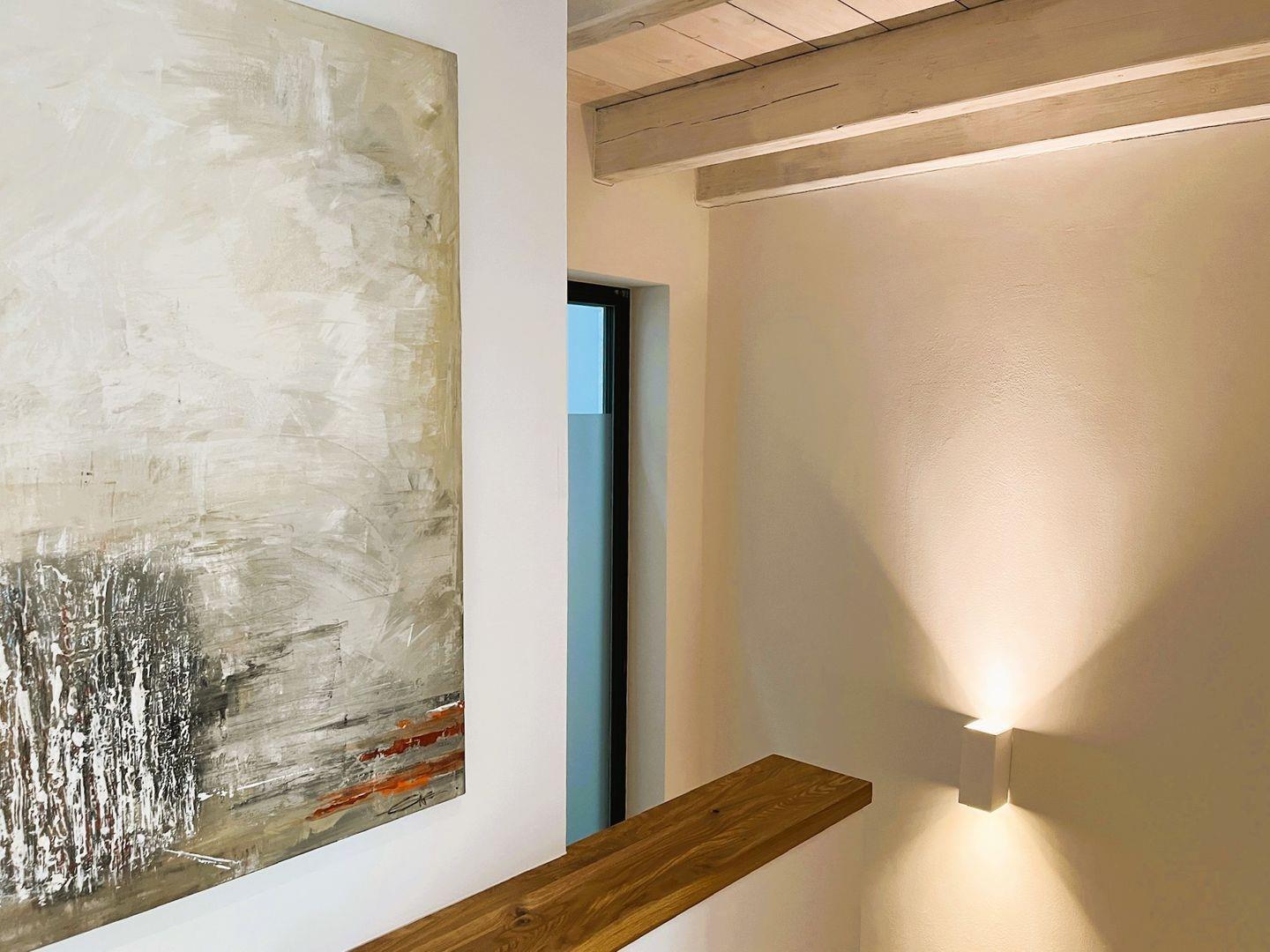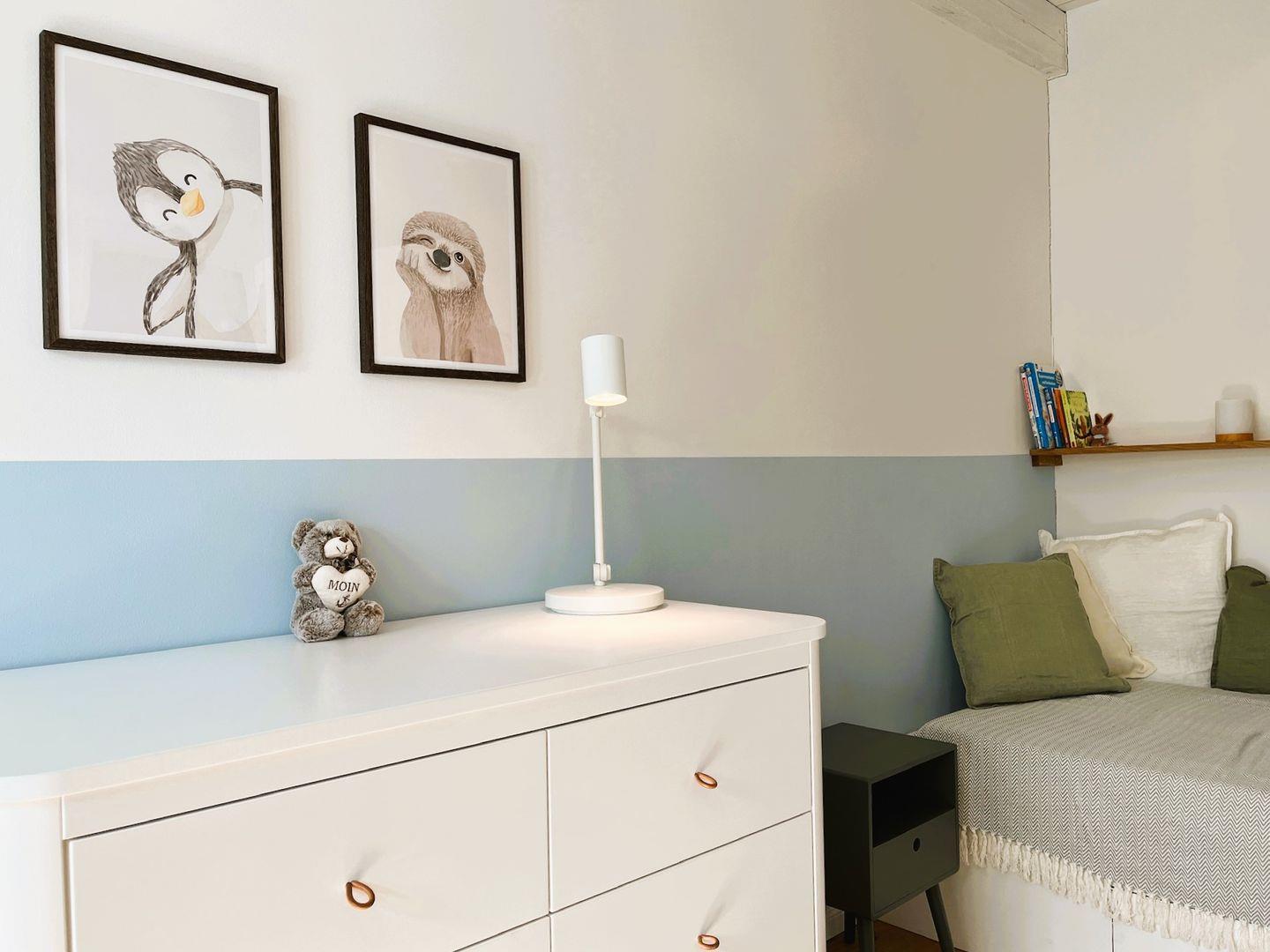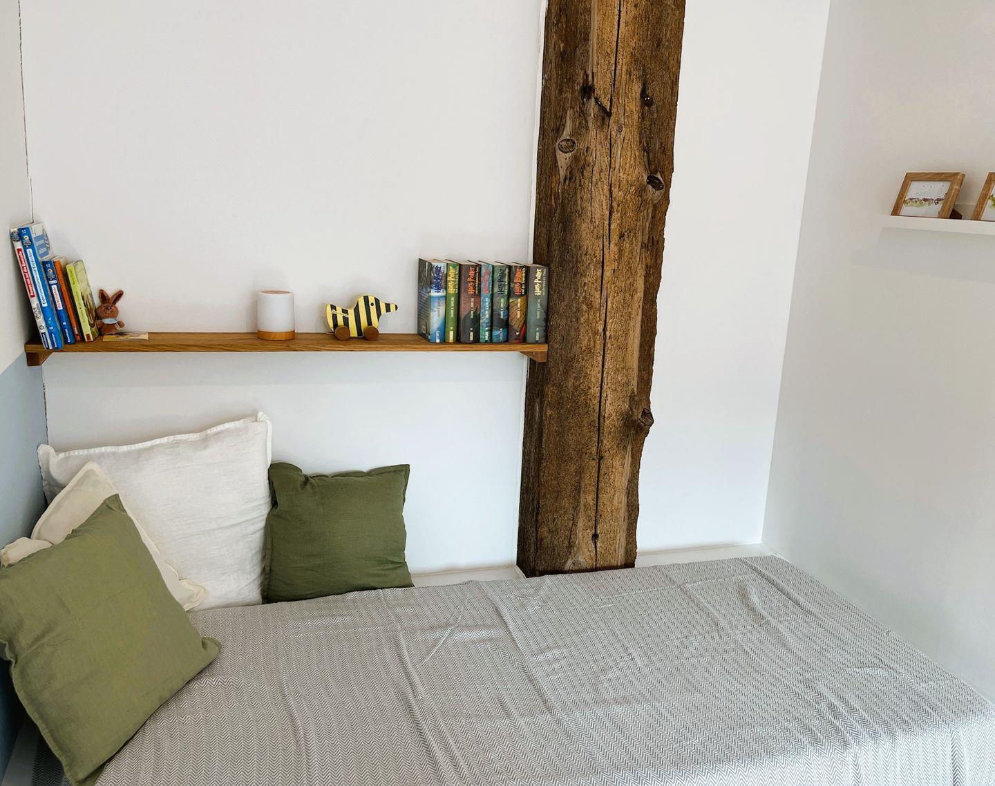 Über eine Holztreppe gelangen Sie ins Obergeschoss, wo sich zwei liebevoll eingerichtete Schlafzimmer befinden. Das Elternschlafzimmer ist mit einem besonders langen Doppelbett (180x210 cm) mit komfortablen Matratzen in zwei Härtegraden (H2 und H3), einem geräumigen Kleiderschrank und einem Hoteltresor ausgestattet. Im zweiten Schlafzimmer erwarten Sie drei Einzelbetten (90x200 cm) – eines davon als gemütliche Schlafkoje unter dem historischen Gebälk, die der Wohnung ihren Namen „Bütz“ gibt. Eine schöne weiße Kommode sorgt für Stauraum, der zugehörige Kleiderschrank befindet sich im Flur. Beide Schlafzimmer verfügen über Verdunklungs- und Insektenschutzrollos, sodass einem erholsamen Schlaf nichts im Wege steht. Desweiteren sind alle zugänglichen Steckdosen in der Ferienwohnung mit einem integrierten Kinderschutz ausgestattet.