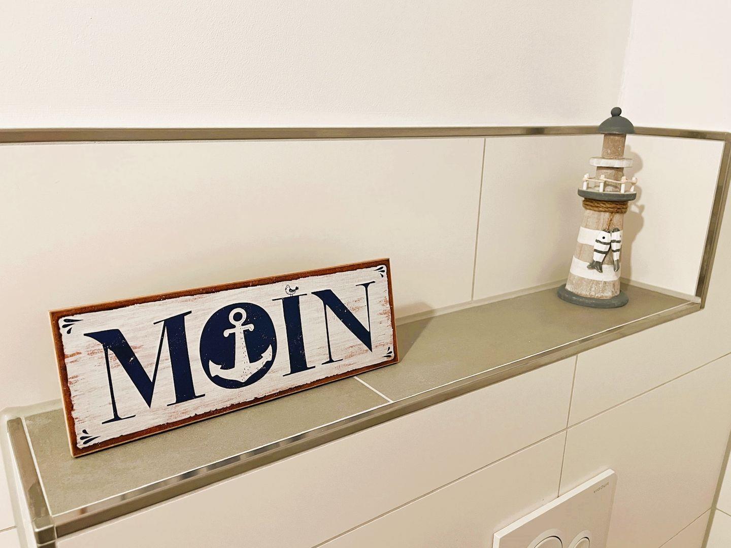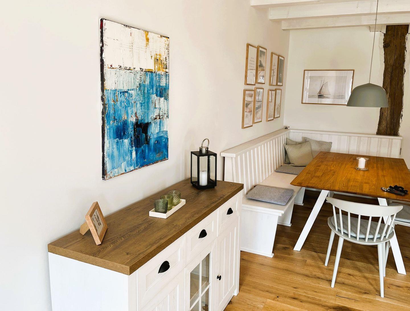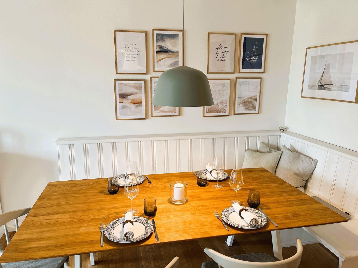 Bereits beim Betreten der Wohnung empfängt Sie ein heller Flur mit Gäste-WC im Erdgeschoss. Herzstück ist die großzügige Wohnküche mit drei großen Fenstern, die den Raum in freundliches Licht tauchen und den Blick auf die Terrasse und die weite ostfriesische Landschaft freigeben. Die Küche ist vollständig ausgestattet – mit Induktionsherd, Mikrowellen-Ofen-Kombi, Kühlschrank, Spülmaschine, Nespresso-Maschine, Toaster, Wasserkocher und Wassersprudler – hier fehlt es an nichts. Die gemütliche Essecke mit Eckbank bietet Platz für bis zu 7 Personen – ideal für gesellige Abende mit Familie oder Freunden.