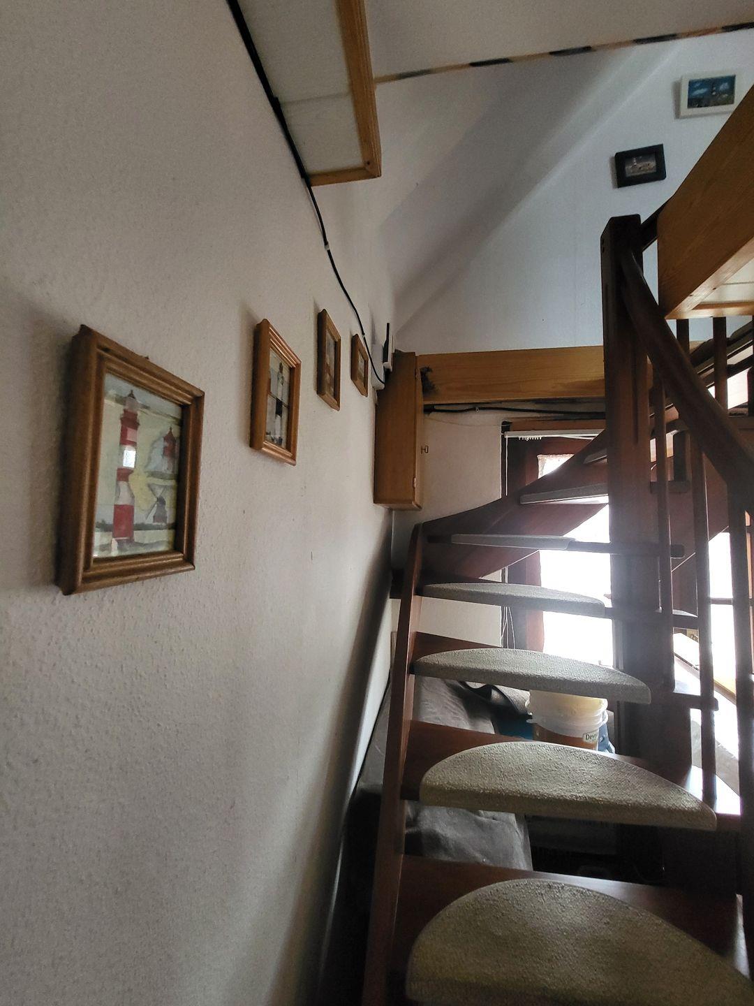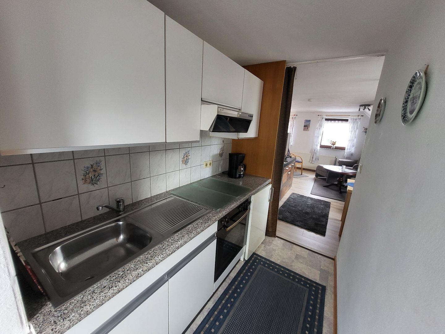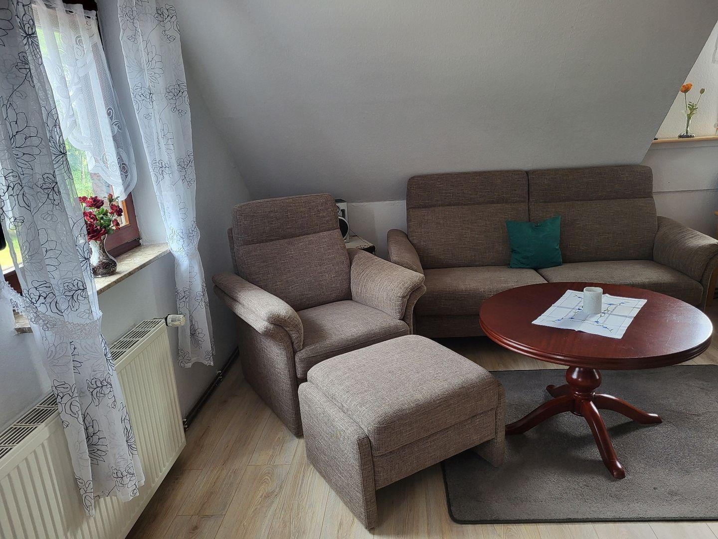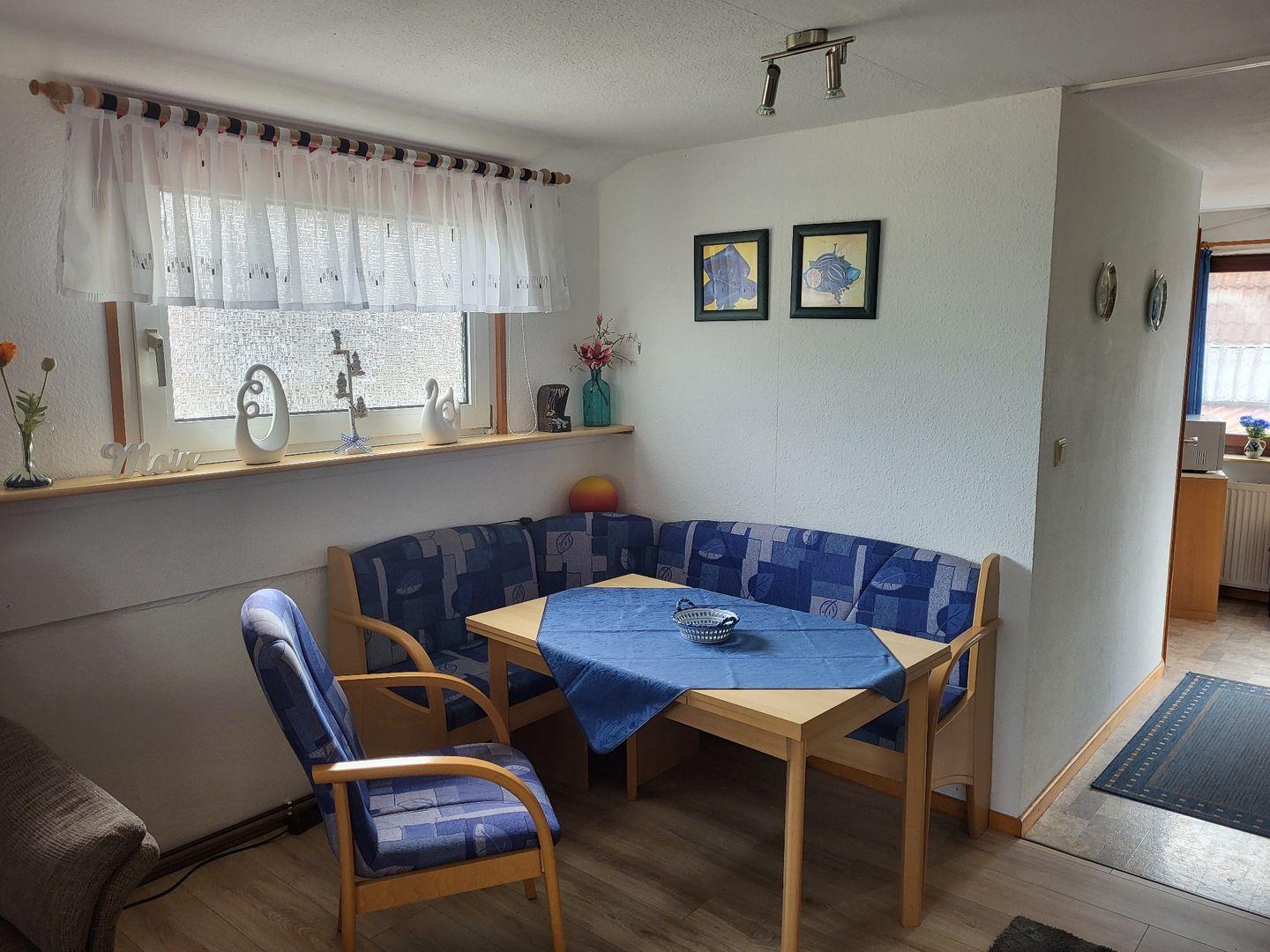 Die Oberwohnung erreichen Sie über einen separaten Eingang. Kommen Sie herein! Die bequeme Couch mit Sessel im Wohnbereich lädt zu gemütlichen Abenden ein. Genießen Sie einen spannenden Film bei einem Gläschen Wein. Nebenan finden Sie eine kleine Essecke mit Eckbank. Hier kann gegessen oder bei einer Tasse Ostfriesentee geklönt werden.