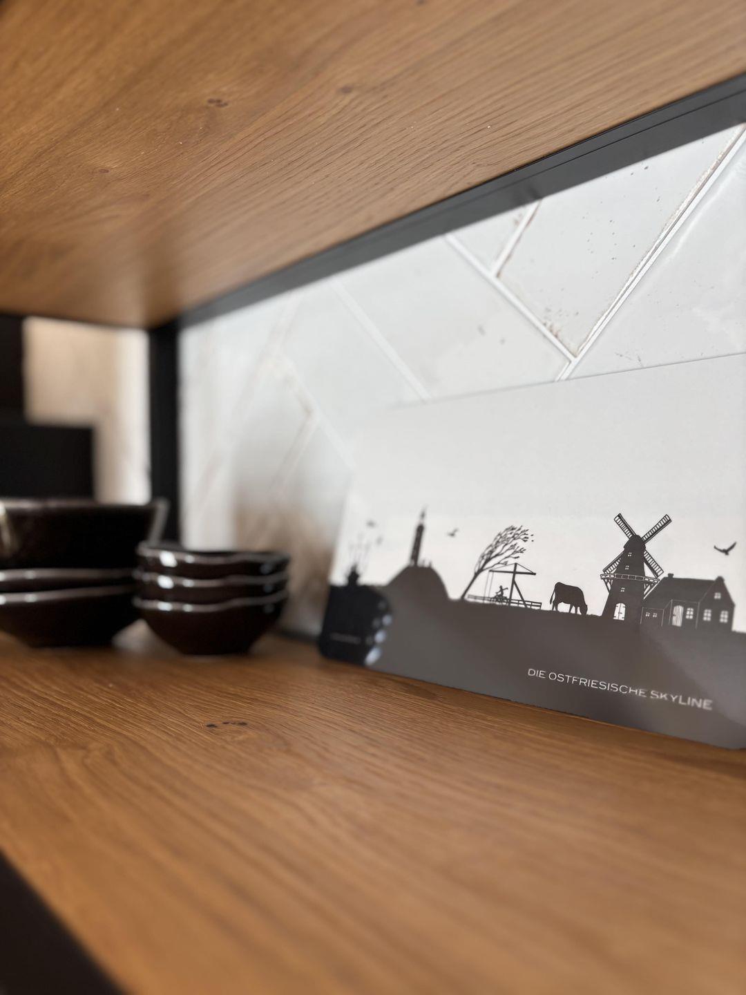 Die Ferienwohnung Mühle 4 in Rysum (Gemeinde Krummhörn) bietet modernen Komfort mit offenem Wohn- und Küchenbereich, bodengleicher Dusche, kostenlosem Privatparkplatz und WLAN. Eine möblierte Terrasse, Fußbodenheizung und hochwertige Ausstattung schaffen eine angenehme Atmosphäre für zwei Gäste.