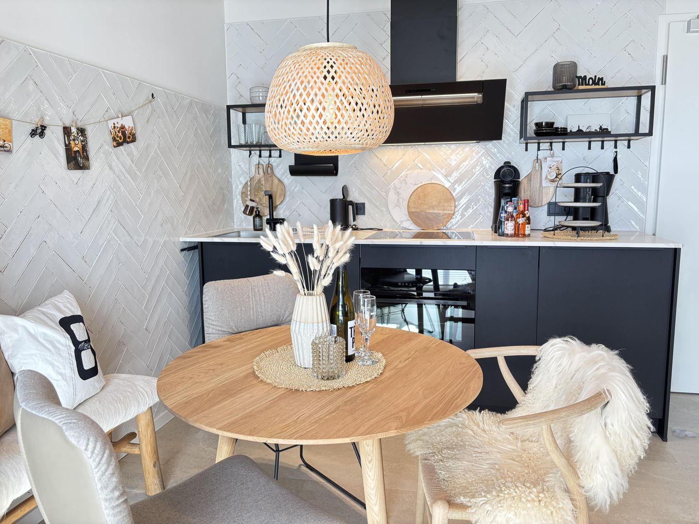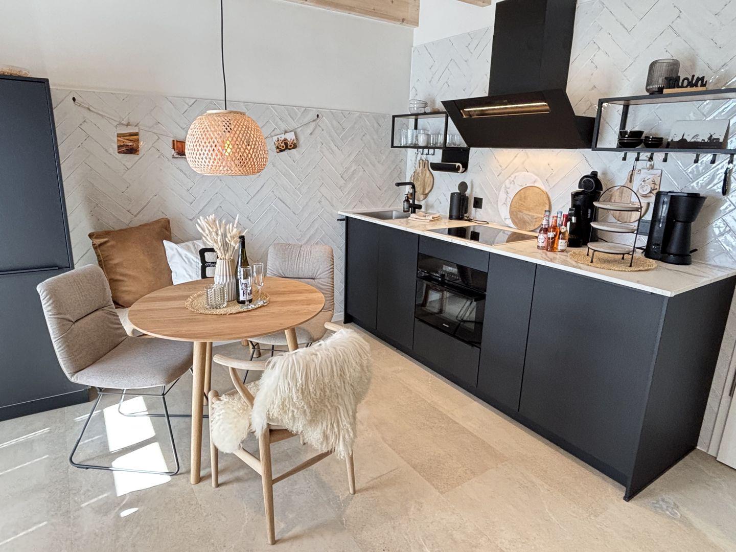 Die offene Küche ist umfassend ausgestattet und lässt keine Wünsche offen: Neben einem Ceranherd, Backofen, Spülmaschine, großem Kühlschrank mit Gefrierfach sowie Kaffeemaschine, Wasserkocher, Nespresso-Espressomaschine und weiteren Küchenutensilien finden Gäste alles, was sie für einen unabhängigen Aufenthalt benötigen. Für zusätzlichen Komfort sorgen eine Erstausstattung mit Bettwäsche, Handtüchern und Geschirrhandtüchern sowie praktische Details wie ein Staubsauger, Abfalleimer und Ganzkörperspiegel.