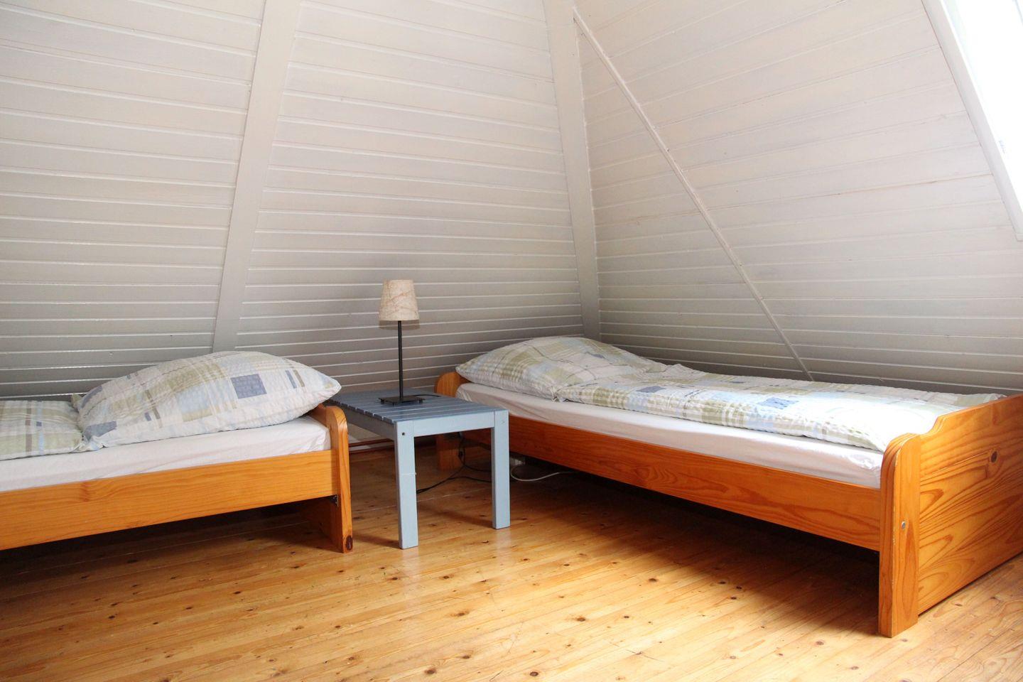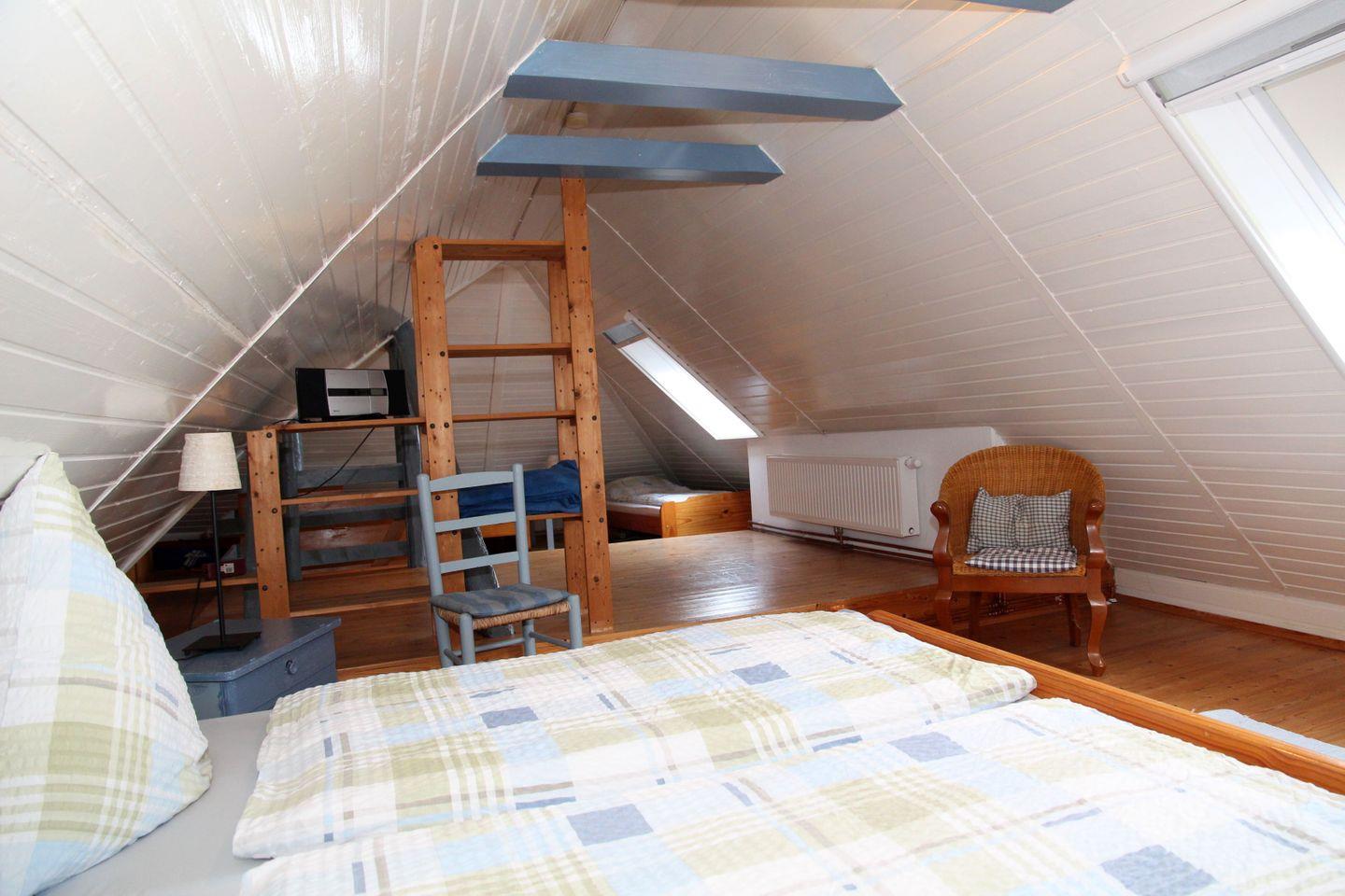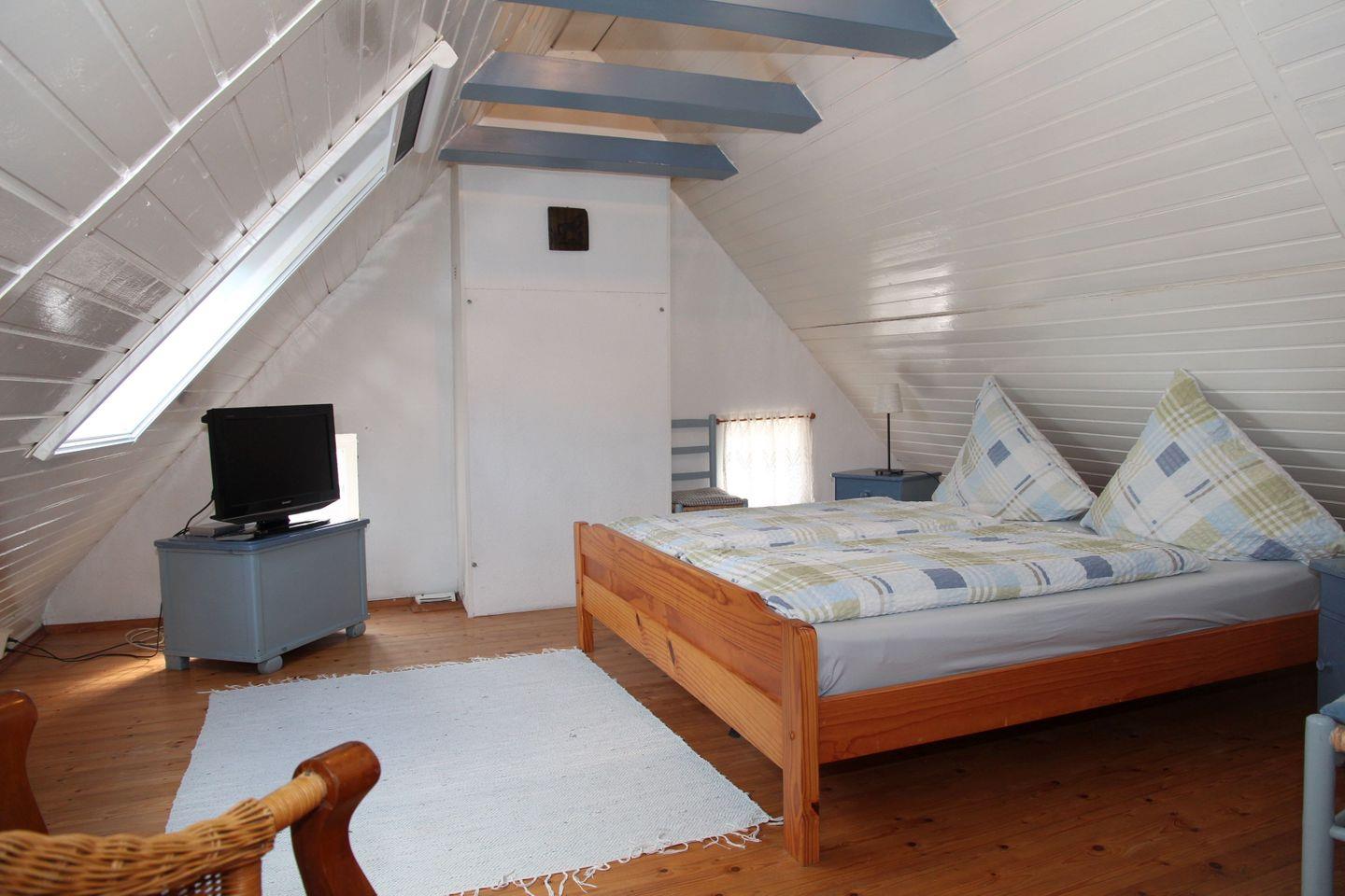 Über eine steilere Treppe gelangen Sie in das Dachgeschoss, wo sich ein großzügiger Schlafraum mit einem Doppelbett (1,80 x 2,00 m) und zwei Einzelbetten (je 0,80 x 2,00 m) befindet. Auch hier sorgt ein kleiner, zusätzlicher TV für Komfort. Alle Räume sind hell und freundlich gestaltet – im Erdgeschoss mit einem Fliesenboden, im Obergeschoss mit gemütlichen Holzdielen. Die wichtigsten Fenster sind mit Fliegengittern und Verdunklungsmöglichkeiten versehen.
