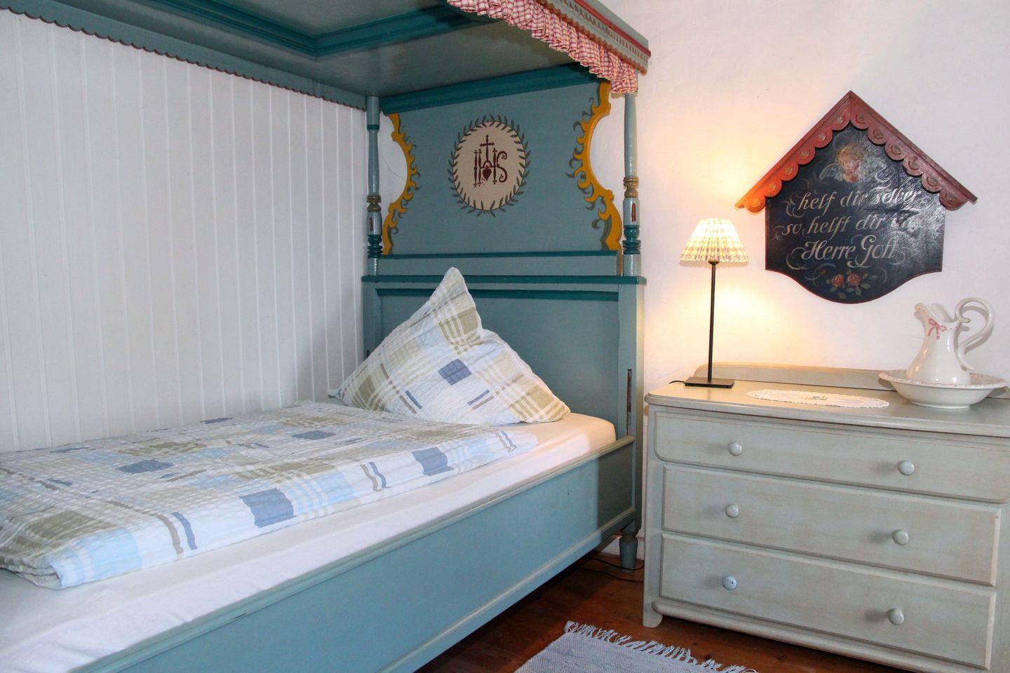 Im Erdgeschoss befindet sich der gemütliche Wohnbereich mit Kaminofen und TV, der besonders an kühleren Tagen eine behagliche Atmosphäre schafft. Die Küche ist mit Spülmaschine, Mikrowelle, Toaster, Wasserkocher, Kaffeemaschine, Kühlschrank mit Gefrierfach, Toaster, Herd, Backofen und allen wichtigen Kochutensilien ausgestattet – hier können Sie Ihre Lieblingsgerichte ganz bequem zubereiten. Angrenzend lädt das kleine Esszimmer mit Bauernecke zum gemeinsamen Essen und Verweilen ein. Ebenfalls im Erdgeschoss liegen das Schlafzimmer mit romantischem Bauernhimmelbett (ca. 1,35 m breit, auf Anfrage auch für eine 6. Person nutzbar) sowie das Badezimmer mit ebenerdiger Dusche und Föhn.