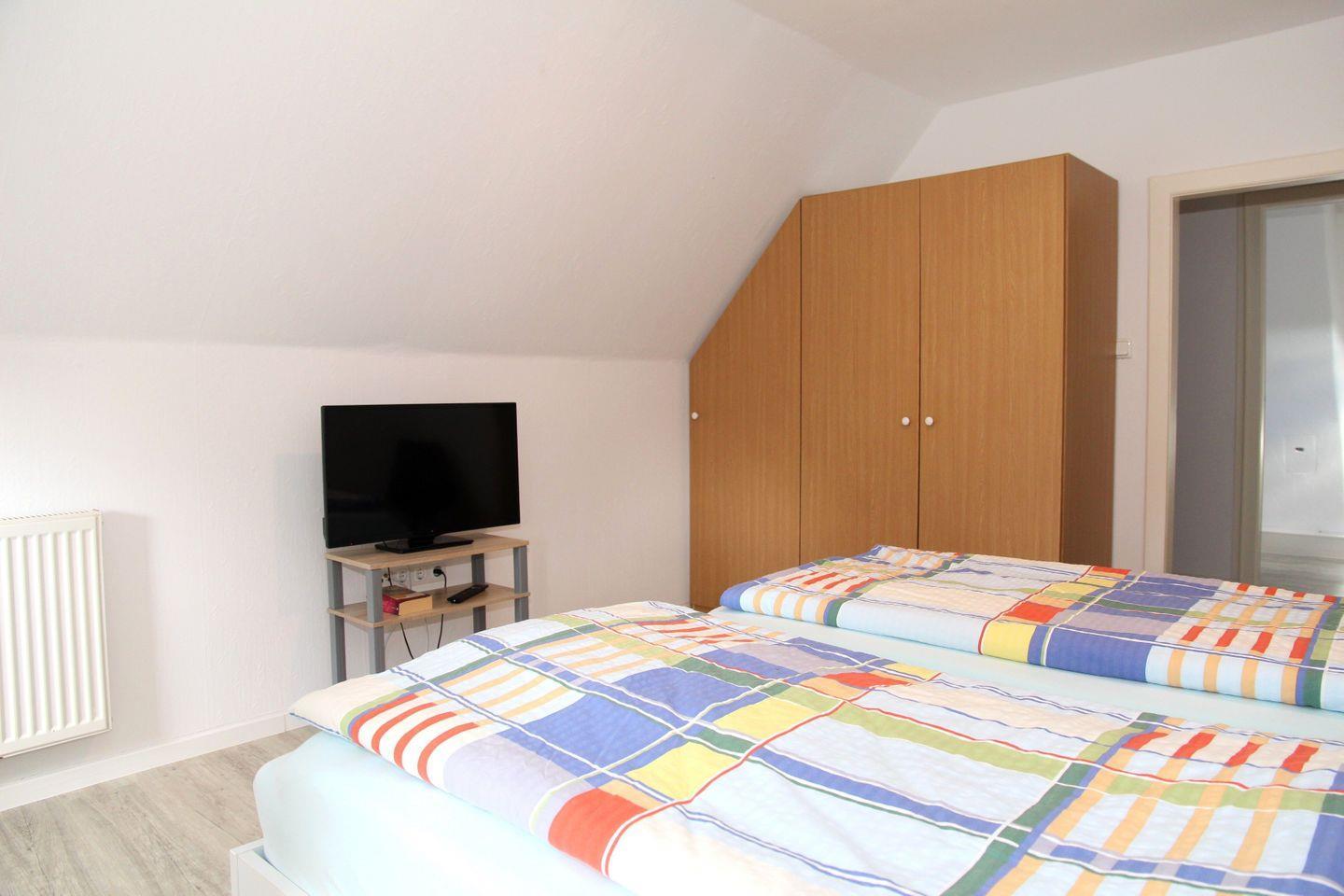 Über eine Holztreppe gelangen Sie in das Obergeschoss, wo sich zwei Schlafzimmer, jeweils mit eigenem TV, befinden. Das Elternschlafzimmer verfügt über ein Doppelbett (1,60 x 2,00 m), Kleiderschrank und Fliegengitter, im Kinderzimmer (zwei Einzelbetten) sorgen Veluxfenster mit Verdunkelungsrollos für erholsamen Schlaf. Alle Räume sind mit einem pflegeleichten Design-Vinylboden ausgestattet, die Wände sind in traditioneller Gipsoptik freundlich hell verputzt.