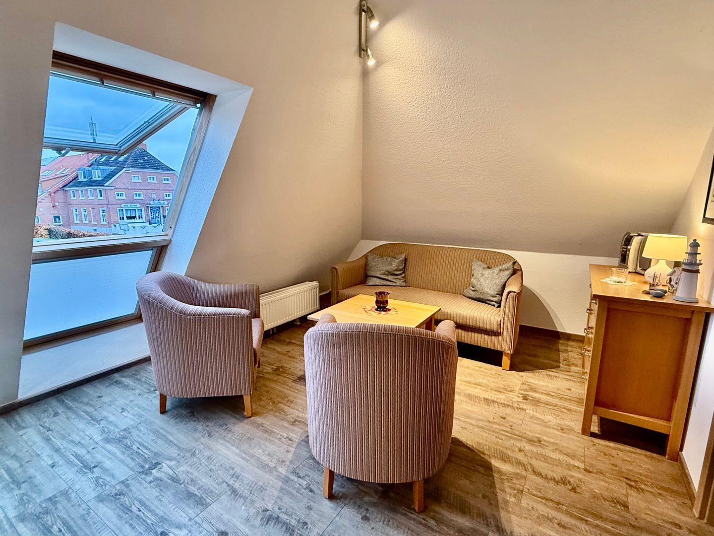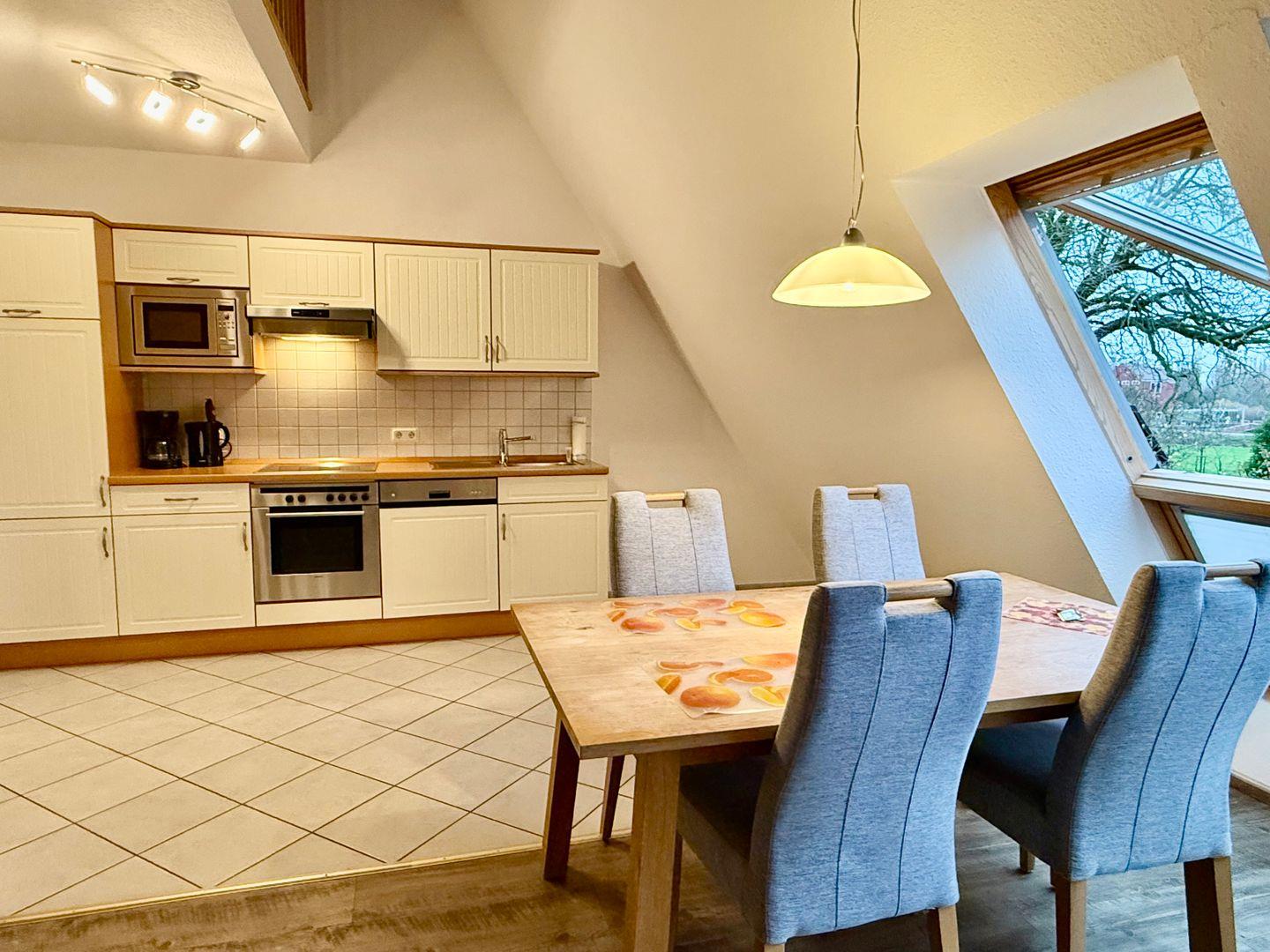 Ferienwohnung "Campen" im Amtmannshaus am Greetsieler Hafen mit Blick auf den Amtmannsgarten und moderner Ausstattung.
