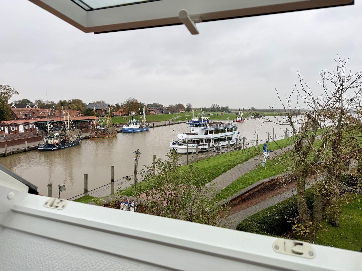 Ferienwohnung Woquard im Amtmannshaus bietet charmanten Komfort am Greetsieler Hafen mit Blick auf den Kutterhafen.