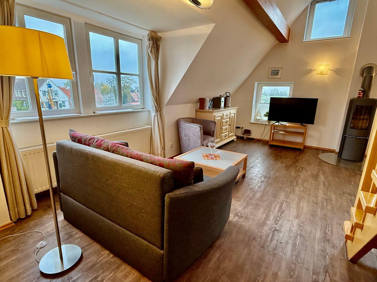 Ferienwohnung „Rysum“ im Amtmannshaus direkt am Greetsieler Hafen, für 2 Personen im Dachgeschoss des Vorderhauses. Helles Wohnzimmer mit Kamin, Essecke und Küchenzeile, offenes Dachgeschoss-Schlafzimmer mit Doppelbett, modernes Bad mit Dusche/WC. Smart-TV, Radio/CD-Player, kostenfreies W-LAN, voll ausgestattete Küche. Großer Garten, Parkplatz auf dem Hof und Fahrrad-Remise. Betten und Handtücher bei Ankunft bereit.