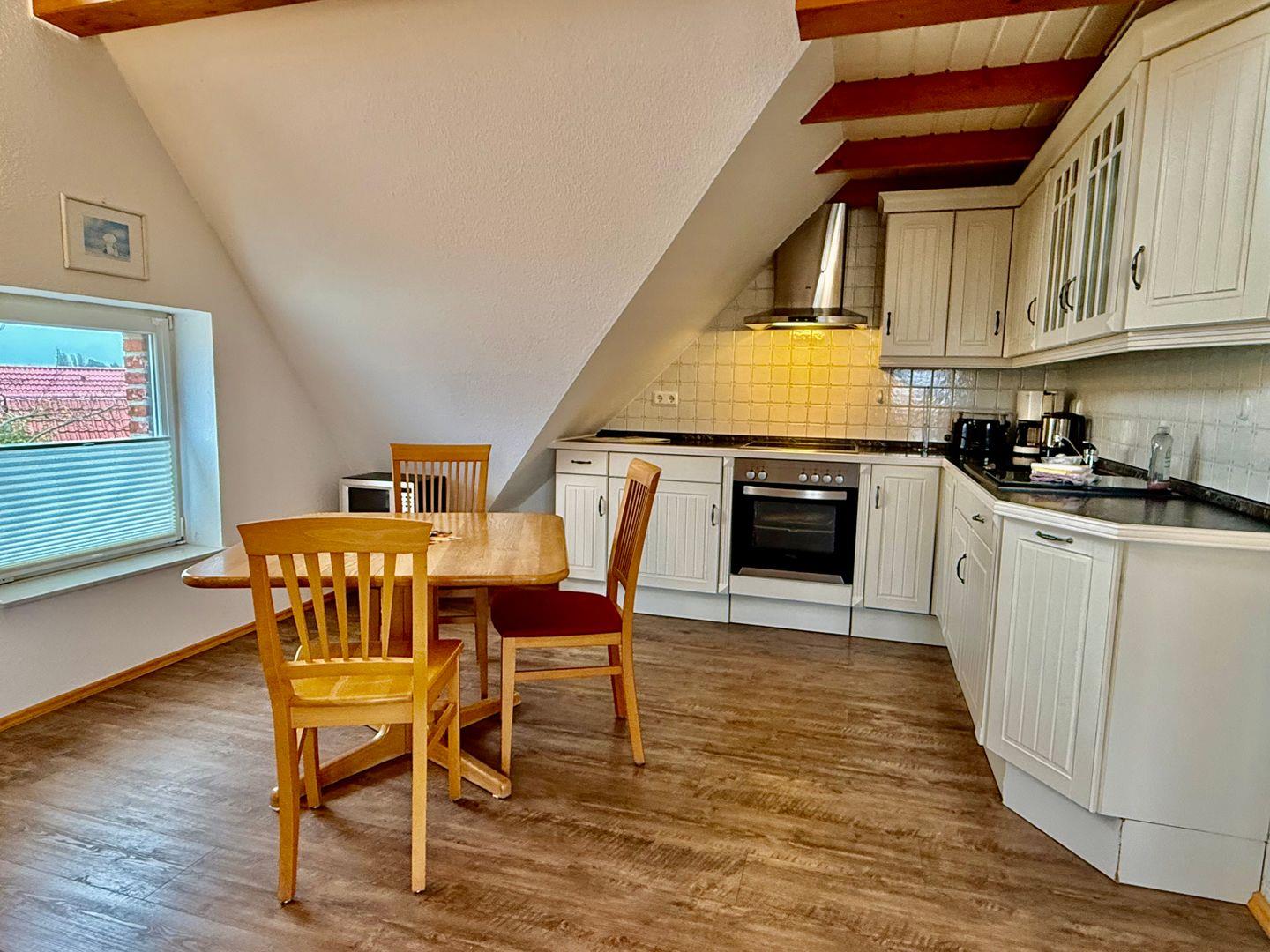 Die Nichtraucher-Ferienwohnung „Rysum“ liegt im Vorderhaus im Dachgeschoss und bietet Platz für 2 Personen. Genießen Sie den wunderschönen Blick auf den Kutterhafen und die historische Häusergalerie.